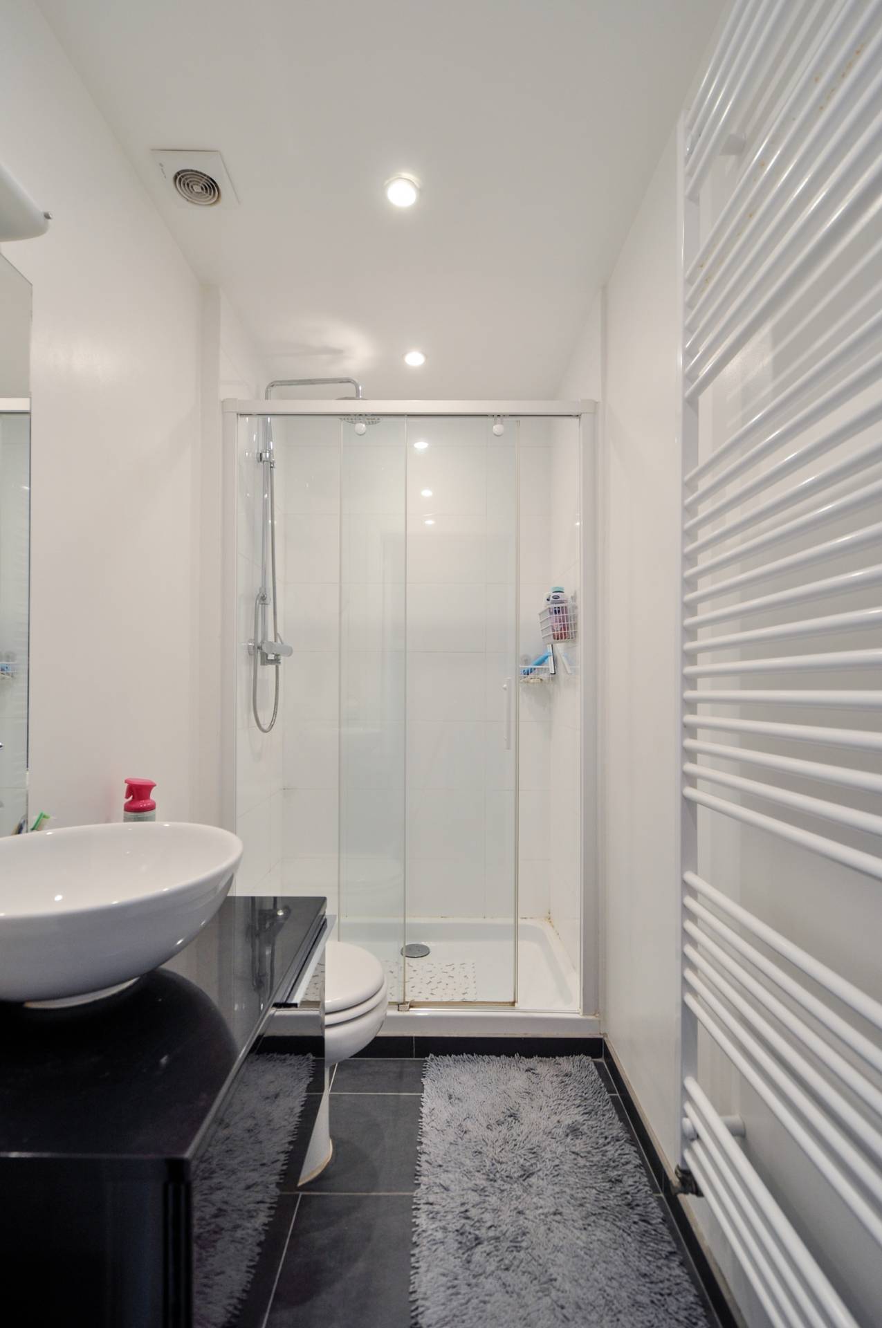 Il y a une chambre avec un lit double. Salle de douche séparée avec douche, lavabo et toilette.