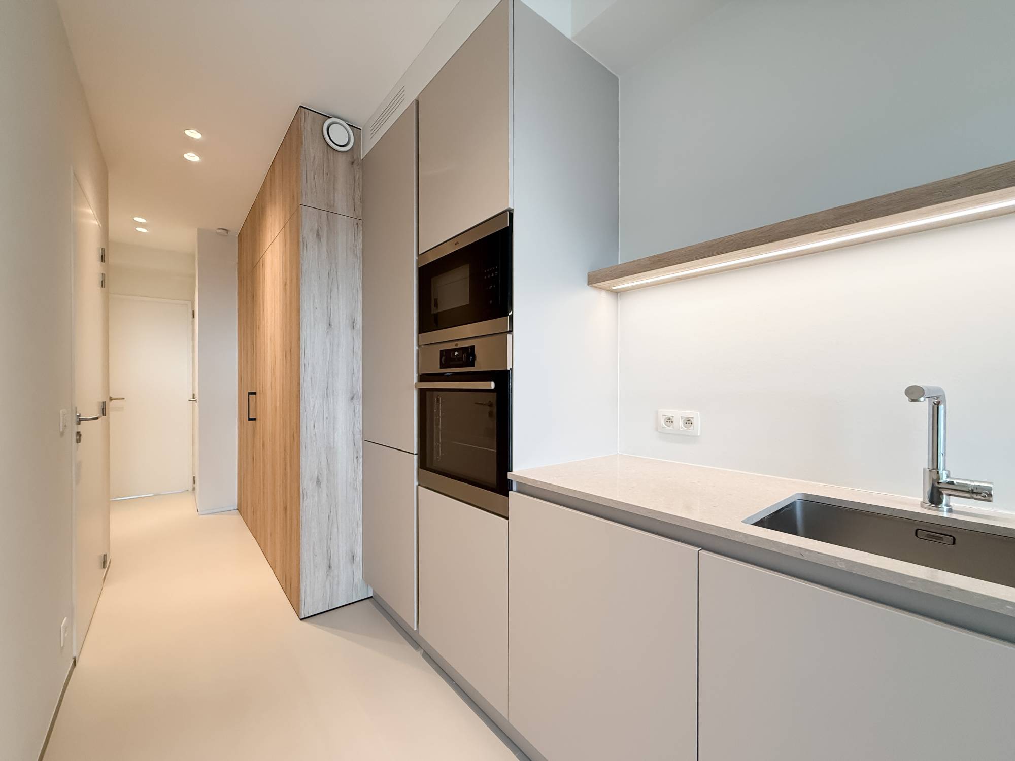 L’appartement dispose également d’une buanderie séparée avec raccordement pour machine à laver, d’une chambre spacieuse avec accès à la terrasse arrière et d’une salle de bain moderne avec douche à l’italienne et lavabo. Un WC séparé et une cave privée complètent ce bien.
