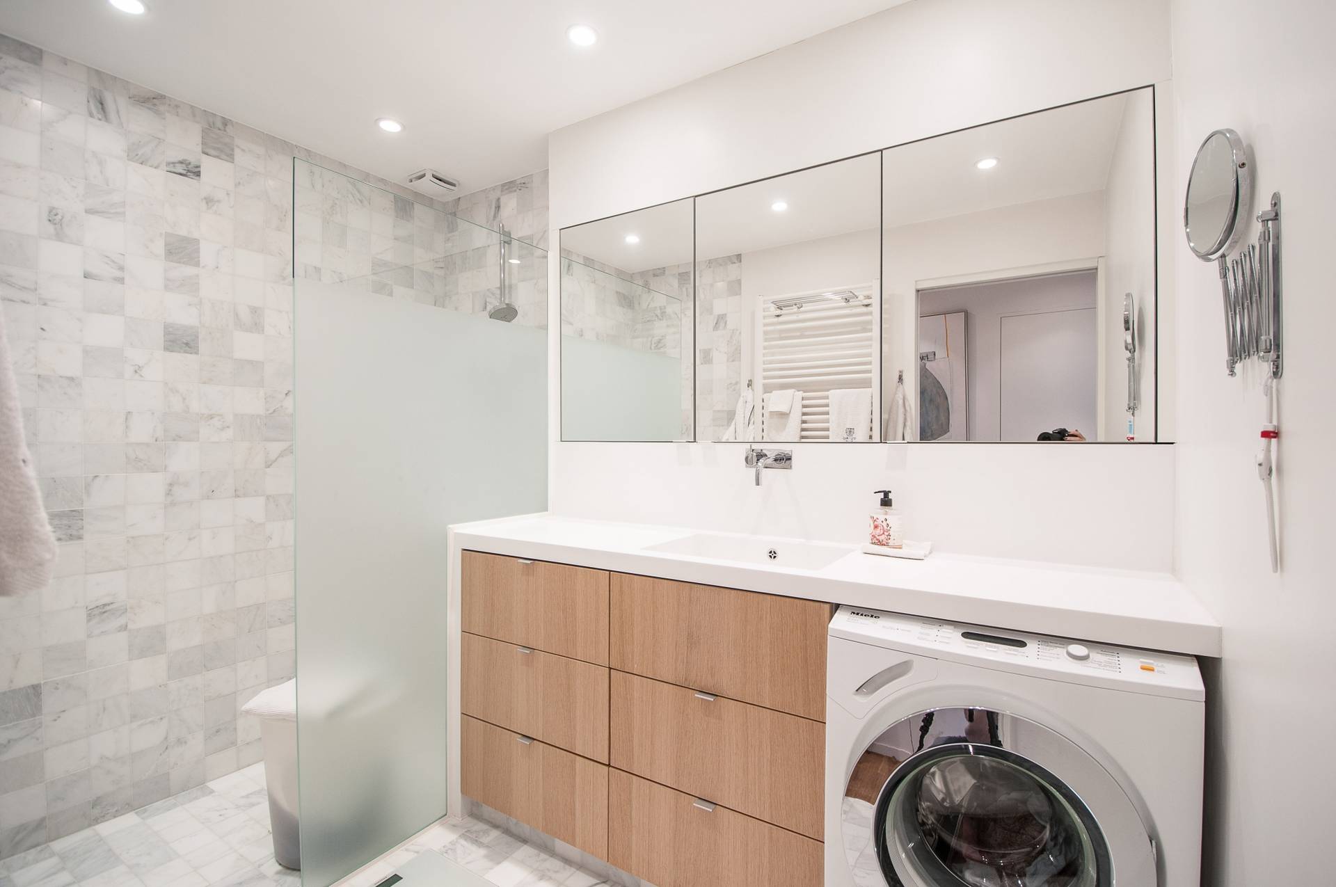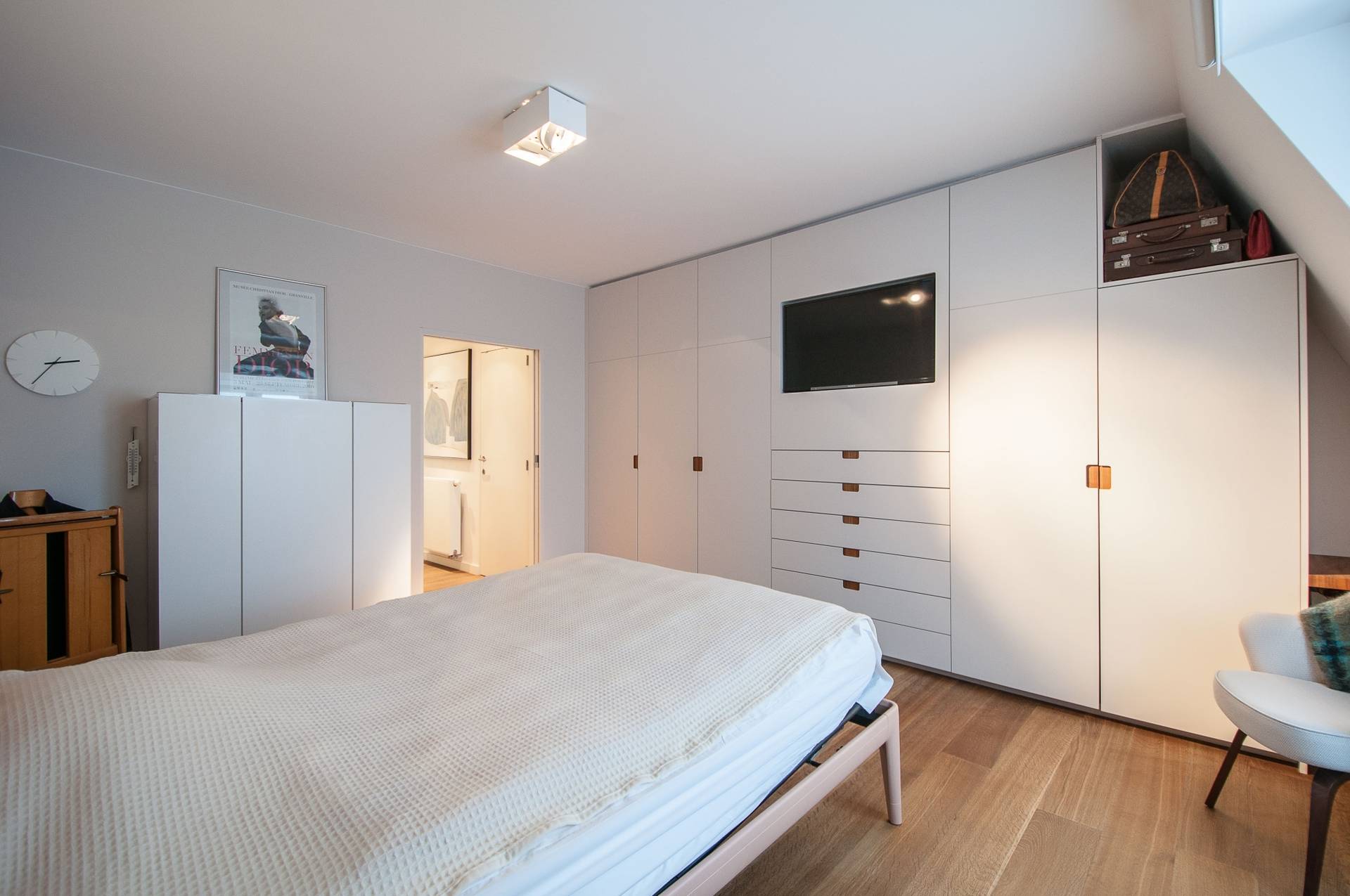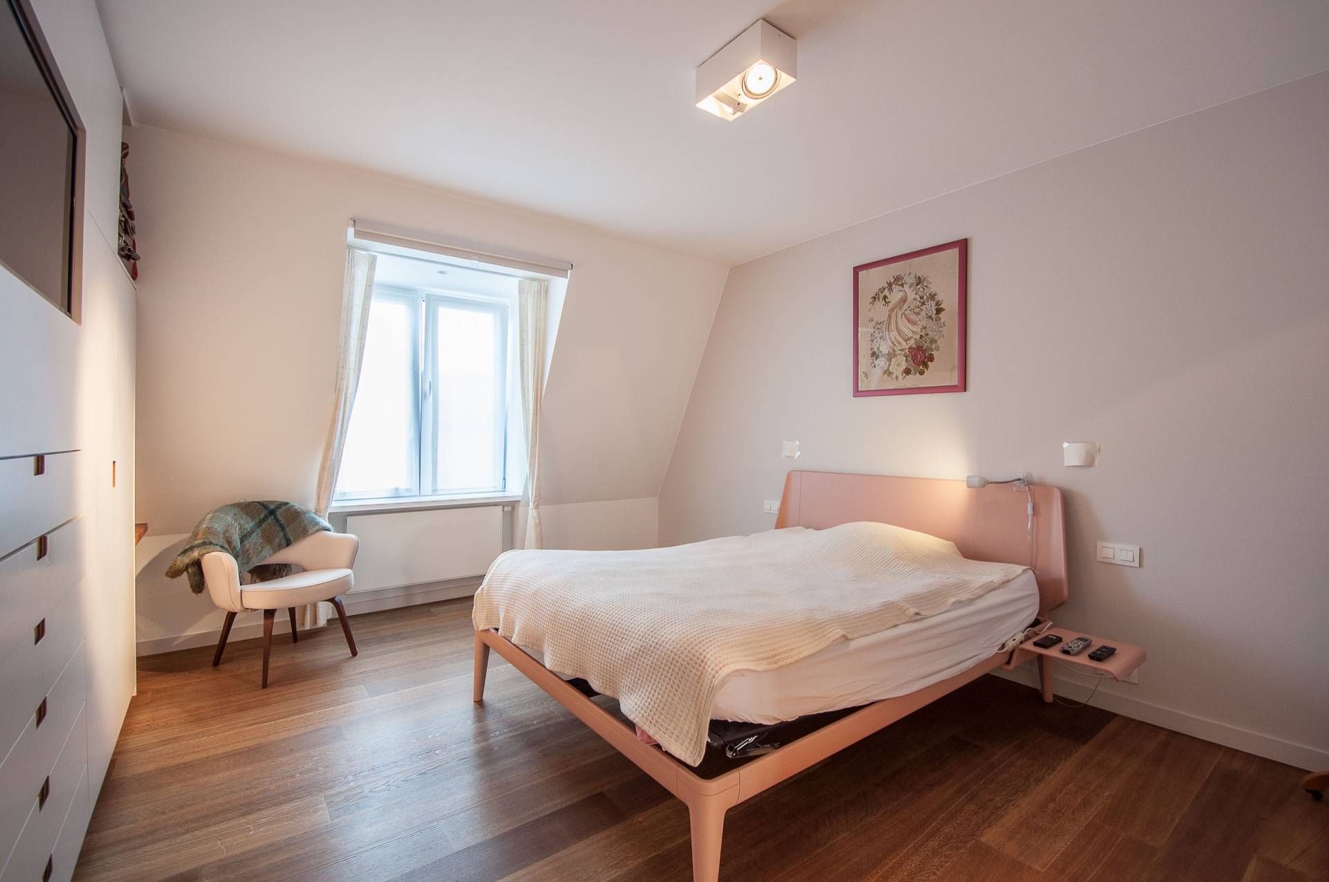 À l'arrière il y a 1 chambre très spacieuse avec placards. Il y a une salle de bains luxueusement meublée, finie en pierre naturelle et équipée d'une belle douche à l'italienne.