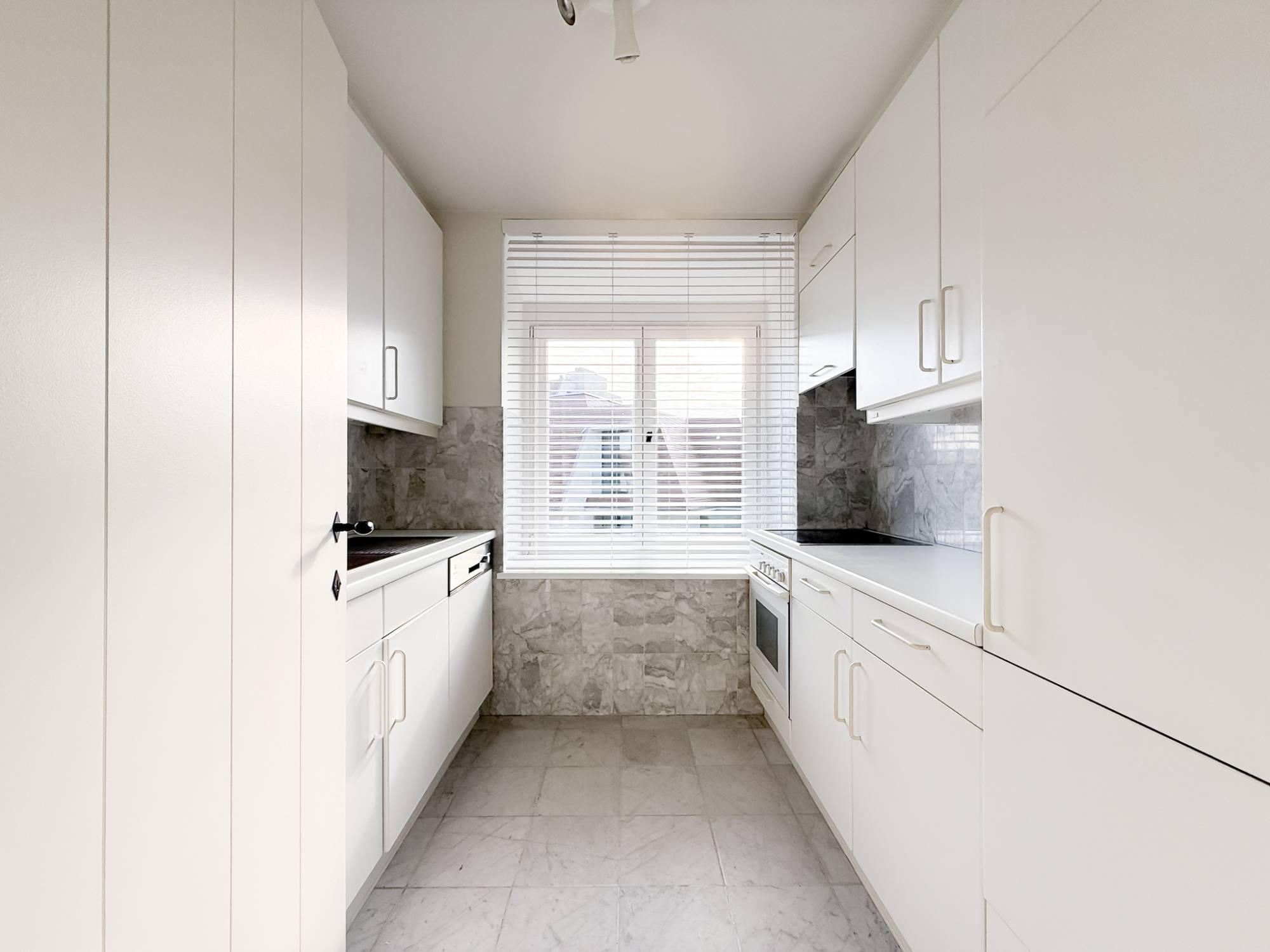 L’appartement dispose de deux chambres avec placards intégrés et d’une salle de bains avec baignoire-douche et machine à laver. Rideaux et luminaires sont installés.