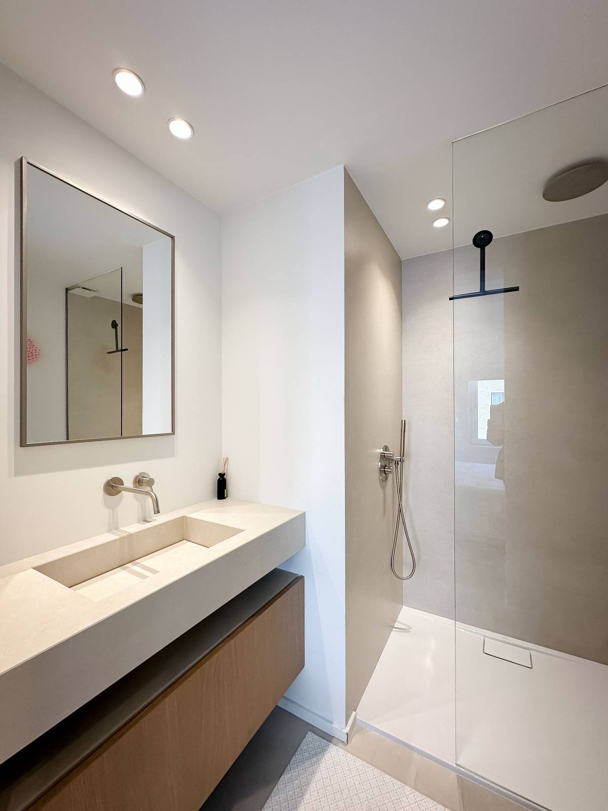 L'appartement dispose de 3 grandes chambres, chacune équipée d'un lit double, de placards intégrés et d'une salle de douche privative, dont une avec toilettes. Un espace de rangement avec machine à laver et sèche-linge est également disponible.