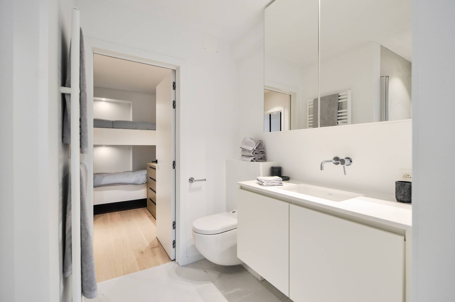 Il y a 3 chambres à coucher. 2 chambres ont des armoires encastrées. La 3ème chambre est une chambre avec des lits superposés. 1 Salle de bains décorée avec goût avec douche, WC et lavabo. 1 Salle d'eau avec douche et lavabo.