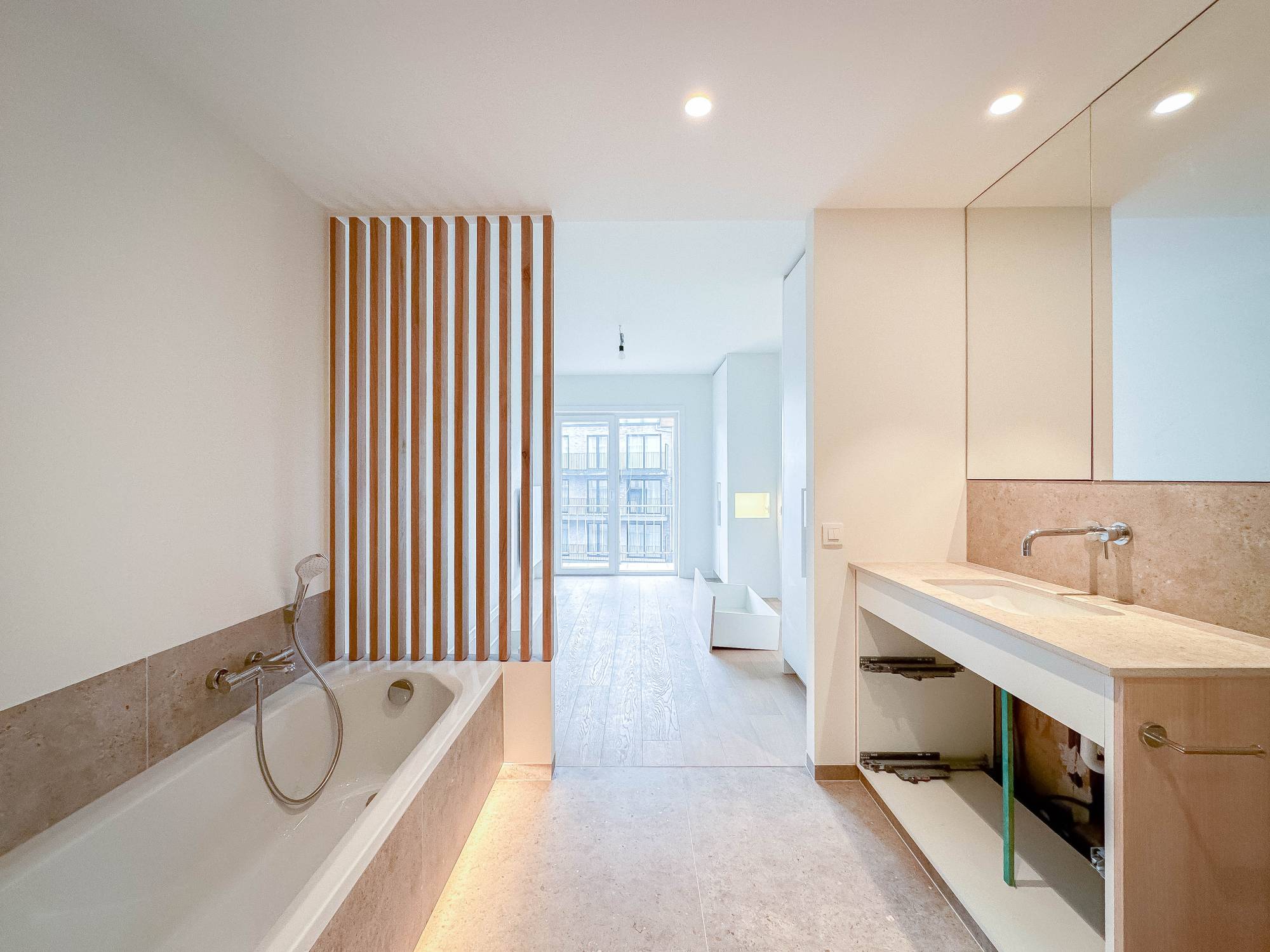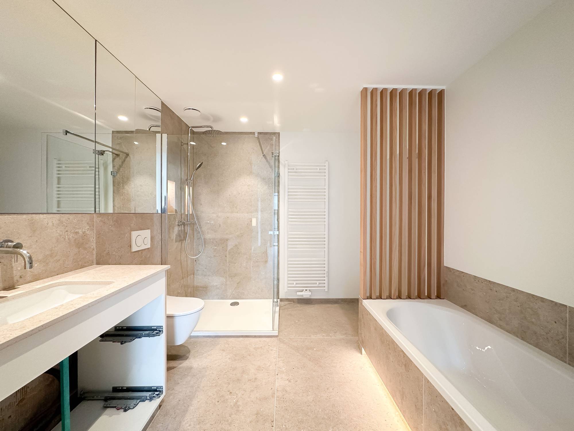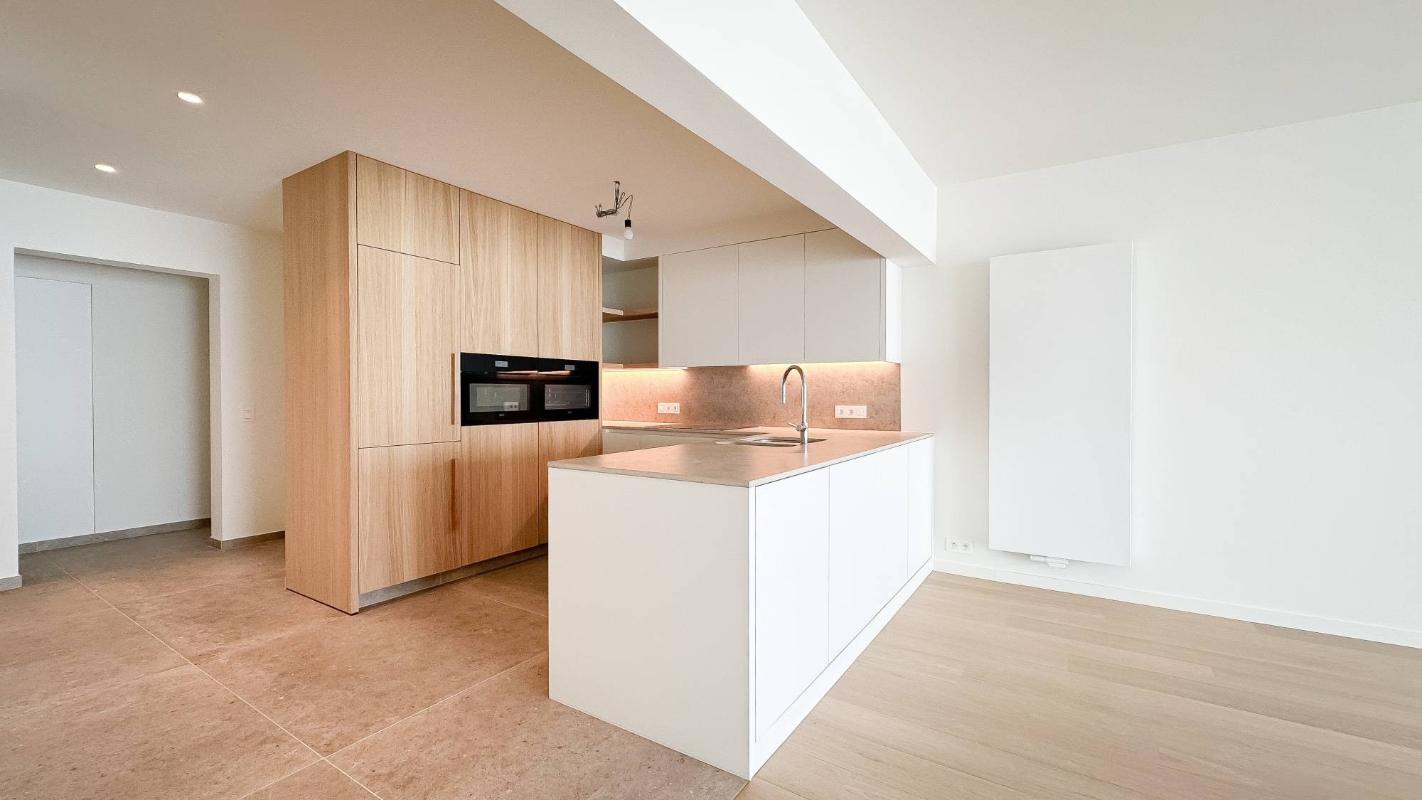 Composition : Hall d'entrée spacieux avec toilettes invités et vestiaire. Le séjour lumineux et généreux offre une vue panoramique frontale sur la mer et donne accès à une terrasse sur toute la largeur de l'appartement. À côté se trouvent la salle à manger et la cuisine semi-ouverte, équipée de tout le confort moderne.