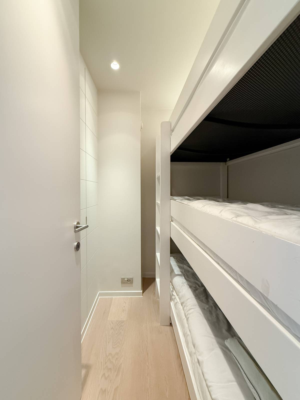 L’appartement comprend trois chambres. Deux chambres spacieuses situées à l’arrière donnent accès à une terrasse au calme. La troisième chambre, plus compacte, est aménagée avec un lit superposé et des placards intégrés, idéale comme chambre d’enfant ou d’appoint.