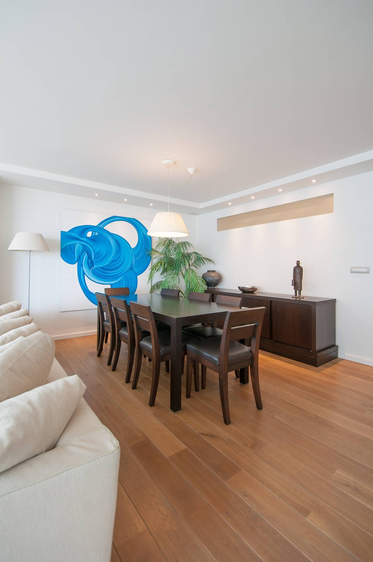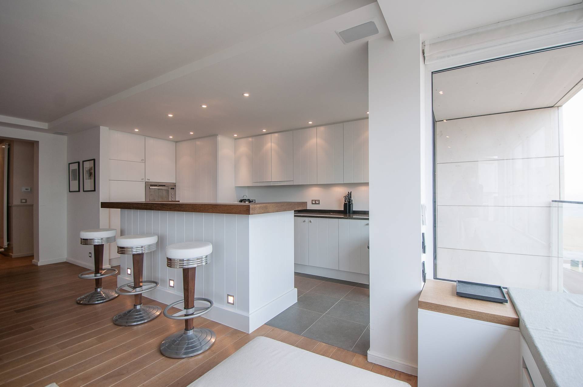 Composition: Hall d'entrée avec toilette invités et vestiaire. Salon ensoleillé avec coin repas adjacent. Cuisine ouverte, ouvrant sur une terrasse. Vue imprenable sur la mer, la Place Albert et les villas du Zoute.