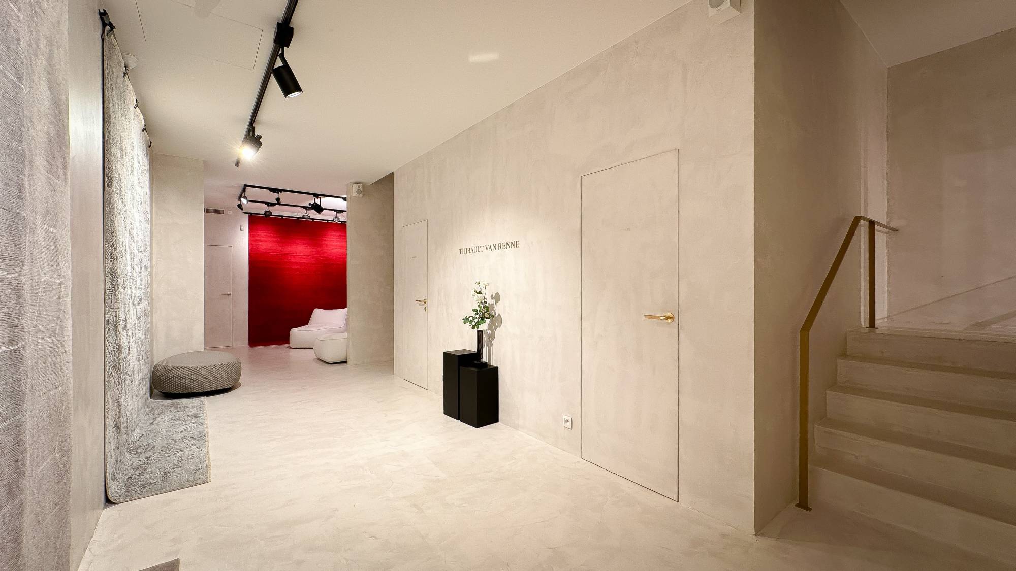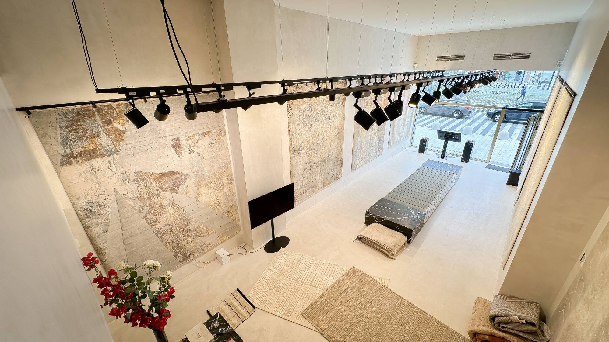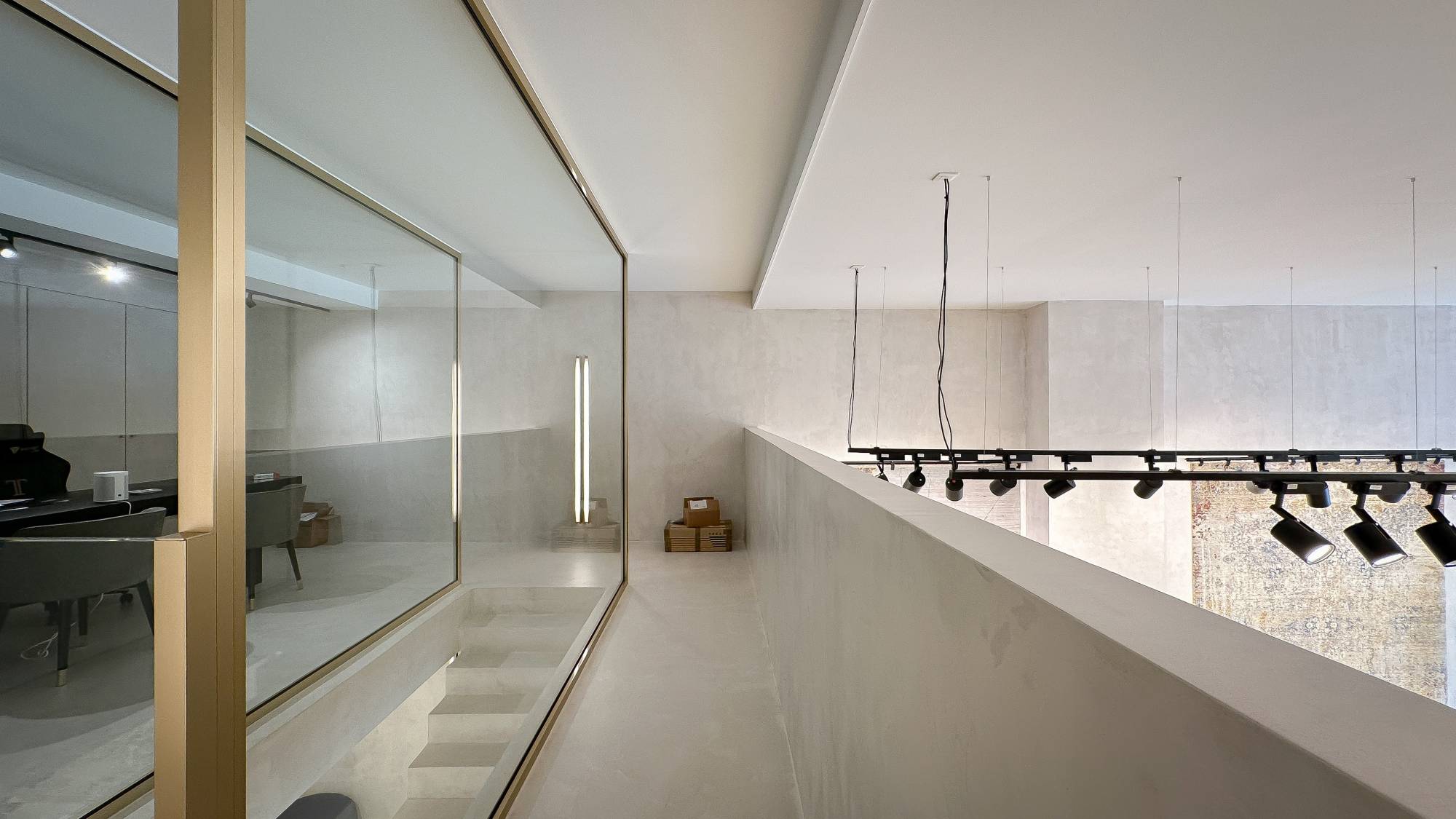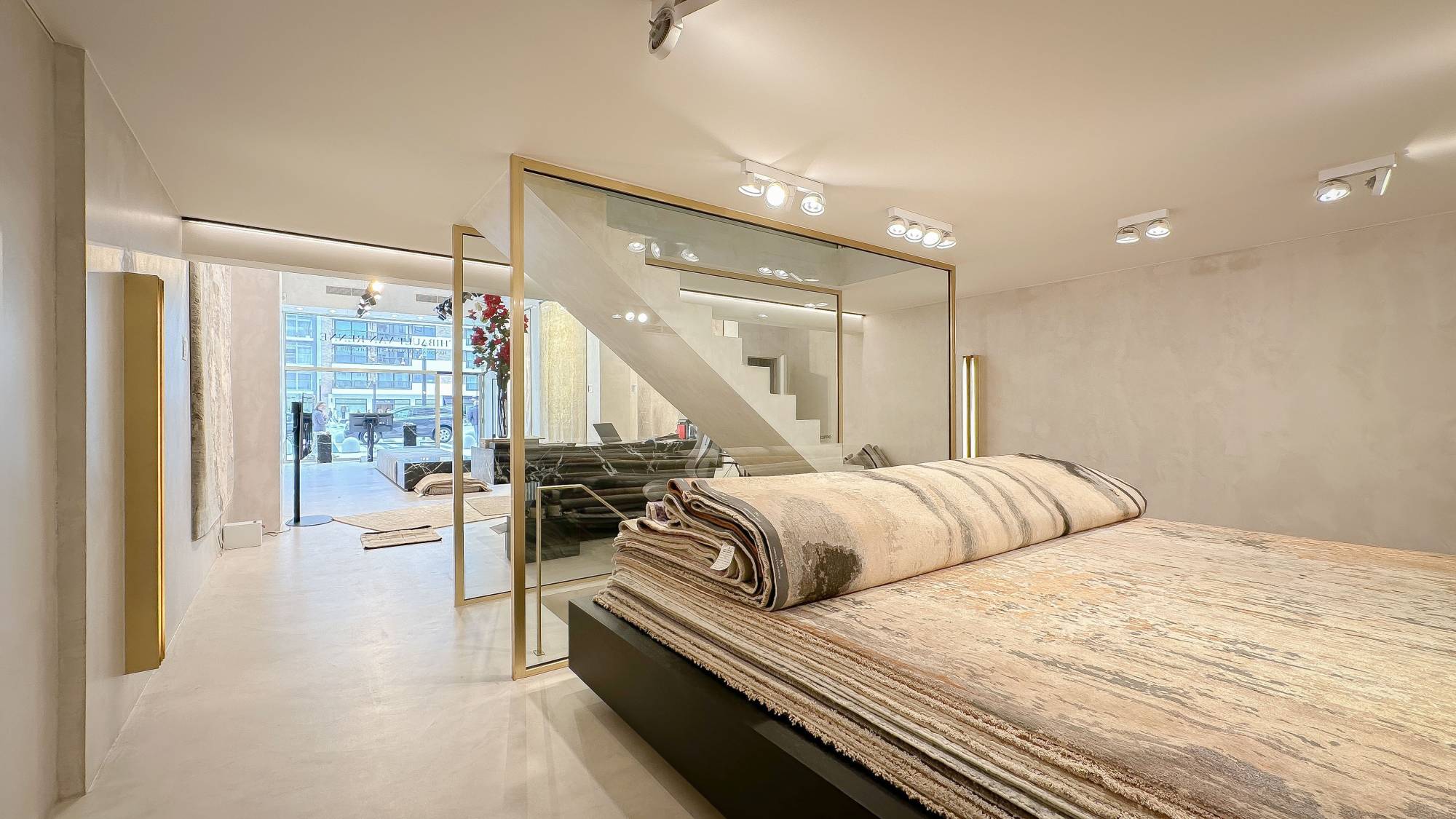 Grand rez-de-chaussée avec un escalier menant à la mezzanine, où se trouvent actuellement un espace bureau et une kitchenette luxueusement aménagée. Le sous-sol, de la même taille que le rez-de-chaussée, est également accessible par l'escalier dans la boutique.