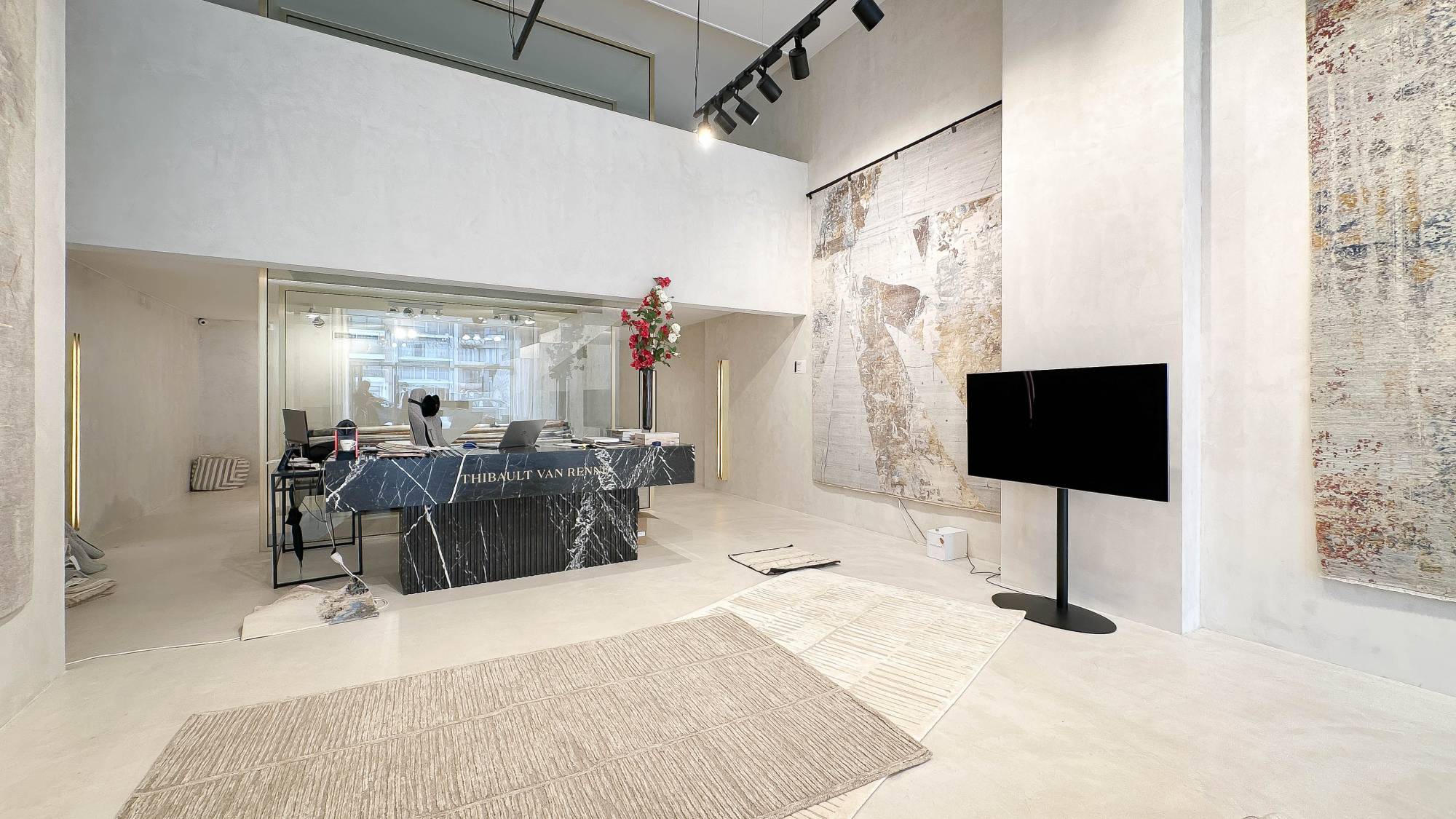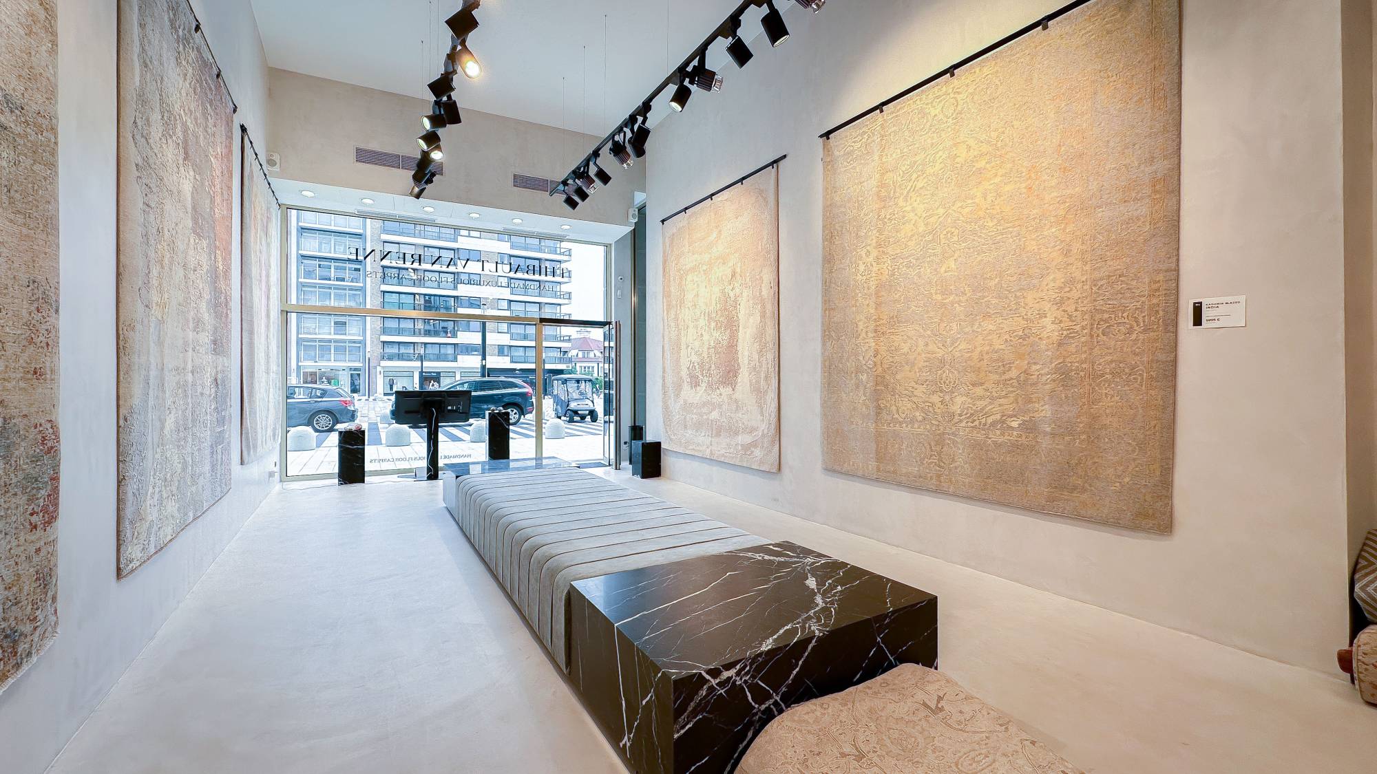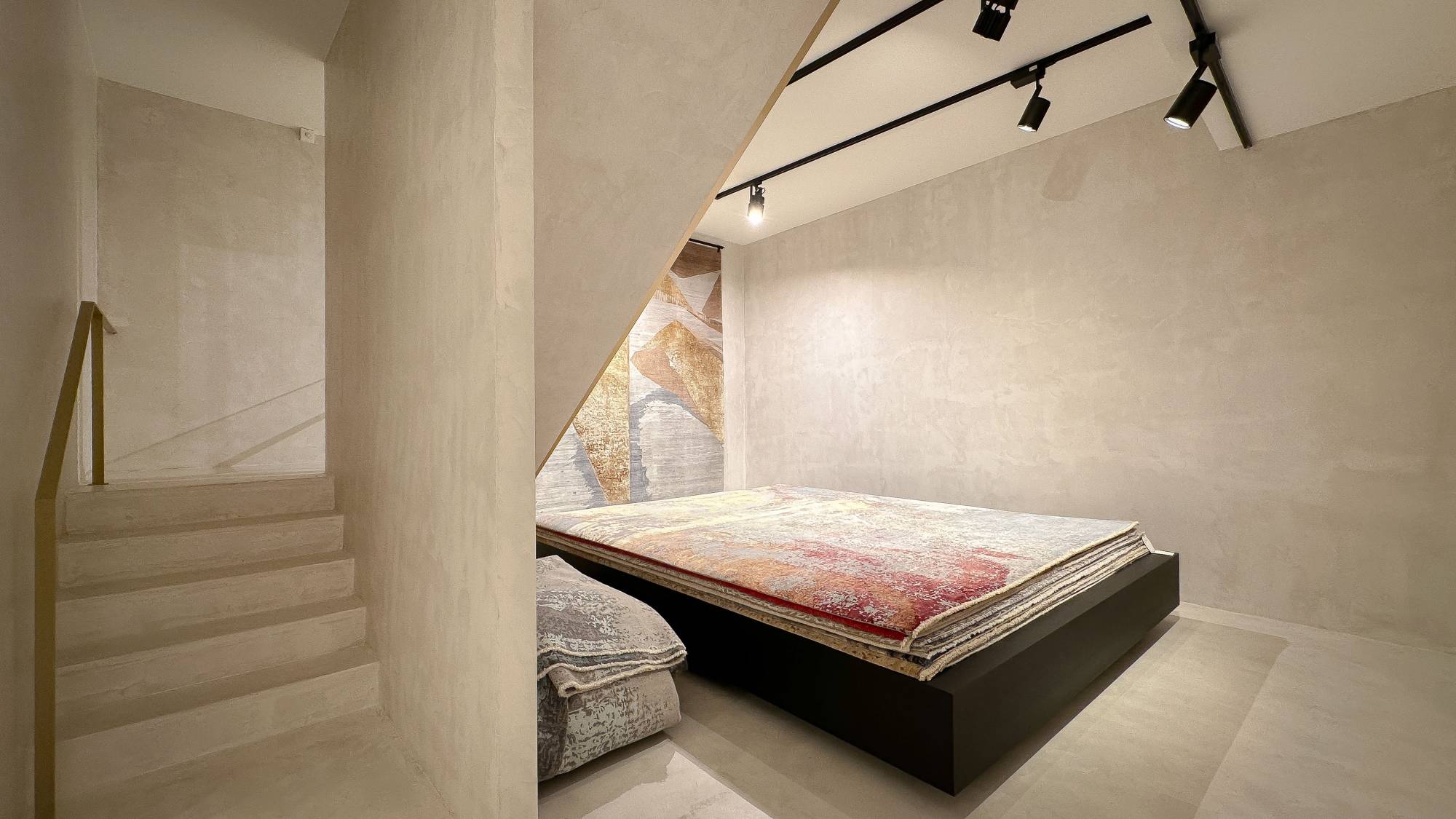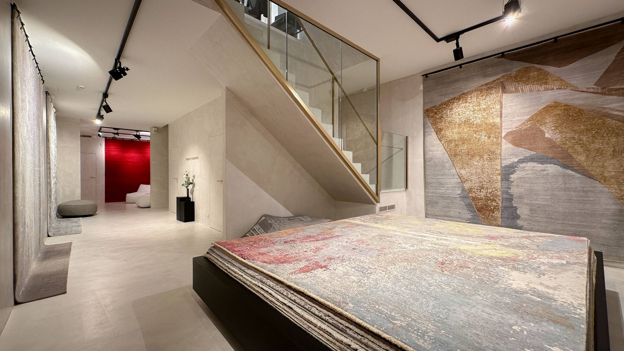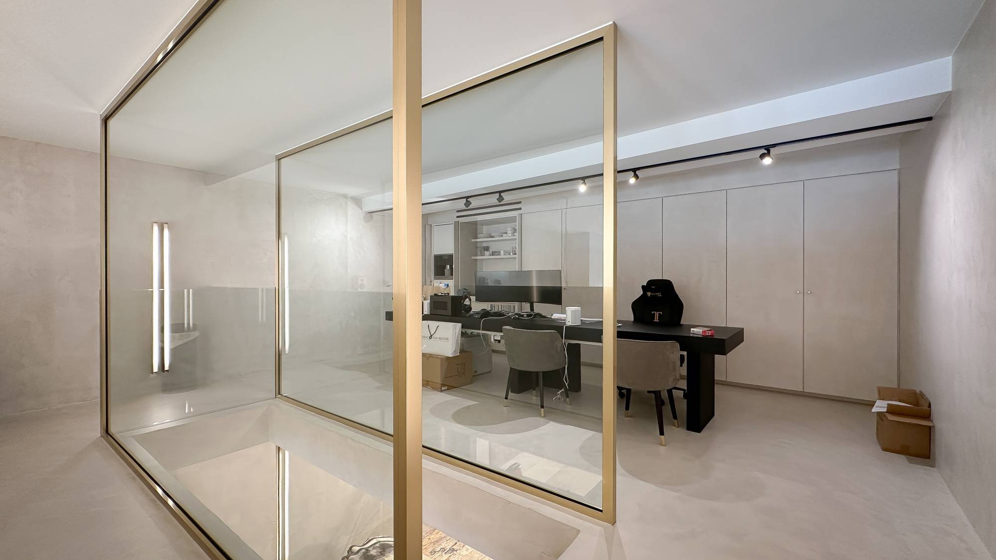 Grand rez-de-chaussée avec un escalier menant à la mezzanine, où se trouvent actuellement un espace bureau et une kitchenette luxueusement aménagée. Le sous-sol, de la même taille que le rez-de-chaussée, est également accessible par l'escalier dans la boutique.