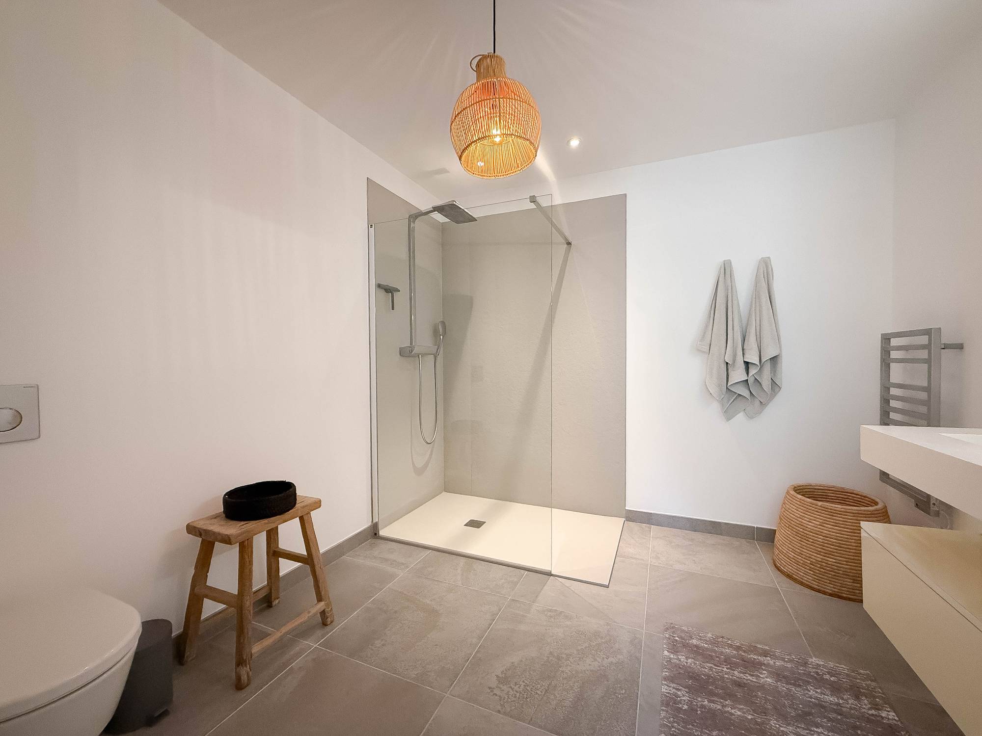 Dès l’entrée, vous serez séduit par les volumes généreux et la luminosité des pièces. La spacieuse pièce de vie comprend un salon élégant ouvert sur l’extérieur ainsi qu’une cuisine équipée contemporaine. L’espace nuit se compose de trois belles chambres, chacune bénéficiant d’un accès direct à la terrasse et de nombreux rangements intégrés. La suite principale dispose d’une vaste salle de douche avec doubles vasques et toilettes, tandis que les deux autres chambres profitent chacune de leur propre salle d’eau.