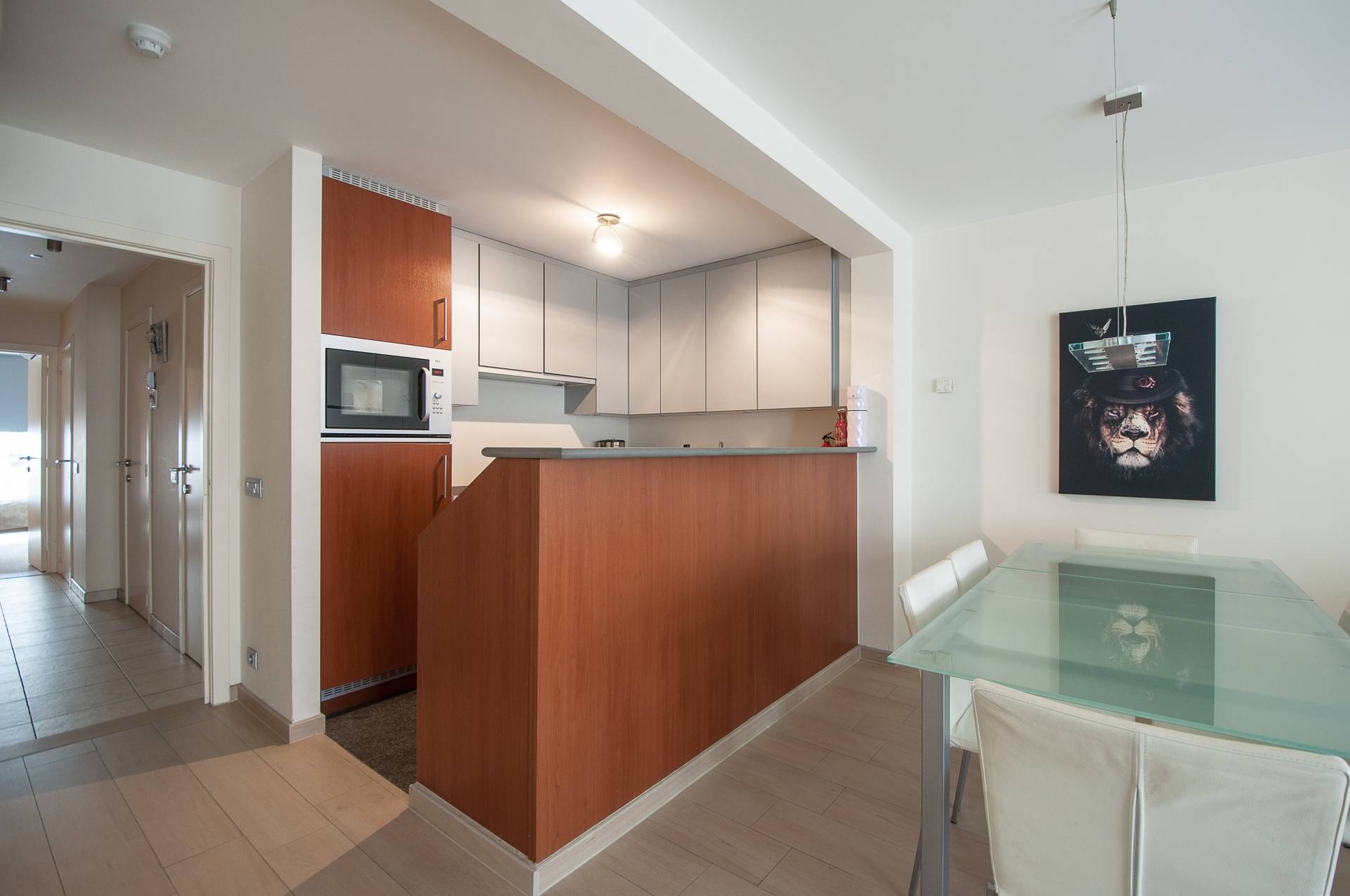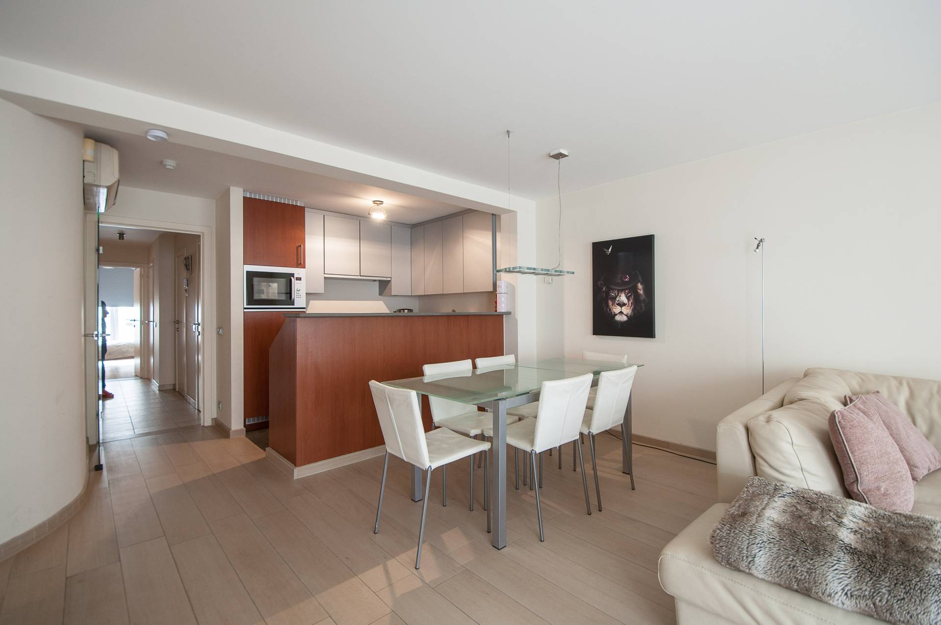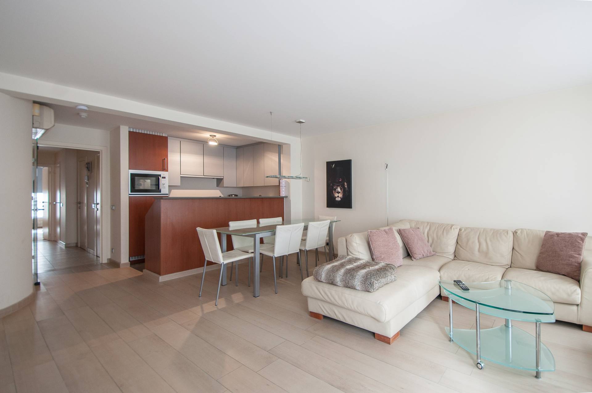 Composition: Hall d'entrée avec toilettes invités. Cuisine ouverte suivie par la salle à manger et ensuite le séjour lumineux qui donne sur une agréable terrasse sur l'Avenue du Litoral. Débarras avec raccordement pour la machine à laver et sèche-linge. Salle de bains avec double lavabo et un bain. À l'arrière se trouve deux chambres à coucher. Dressing. Terrasse à l'arrière. Climatisation et sol carrelé effet parquet, à l'entretien facile!