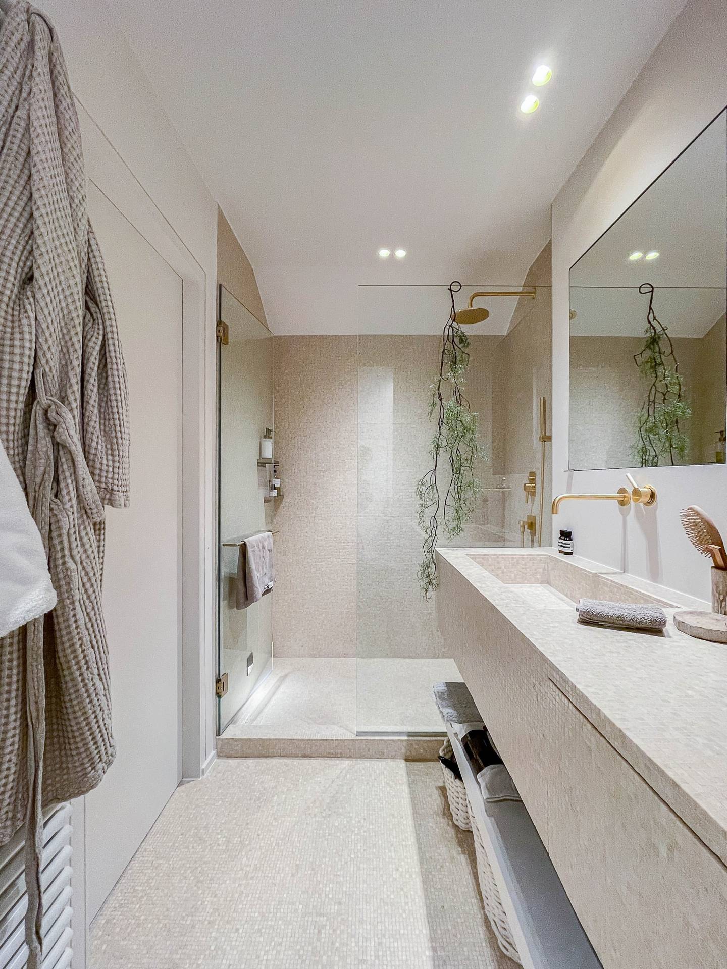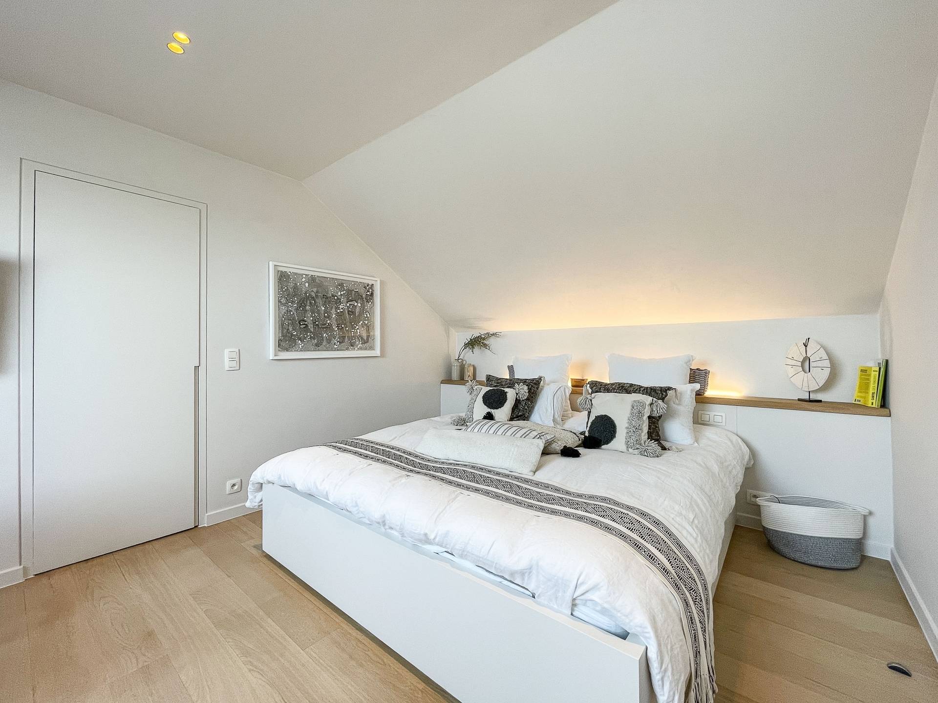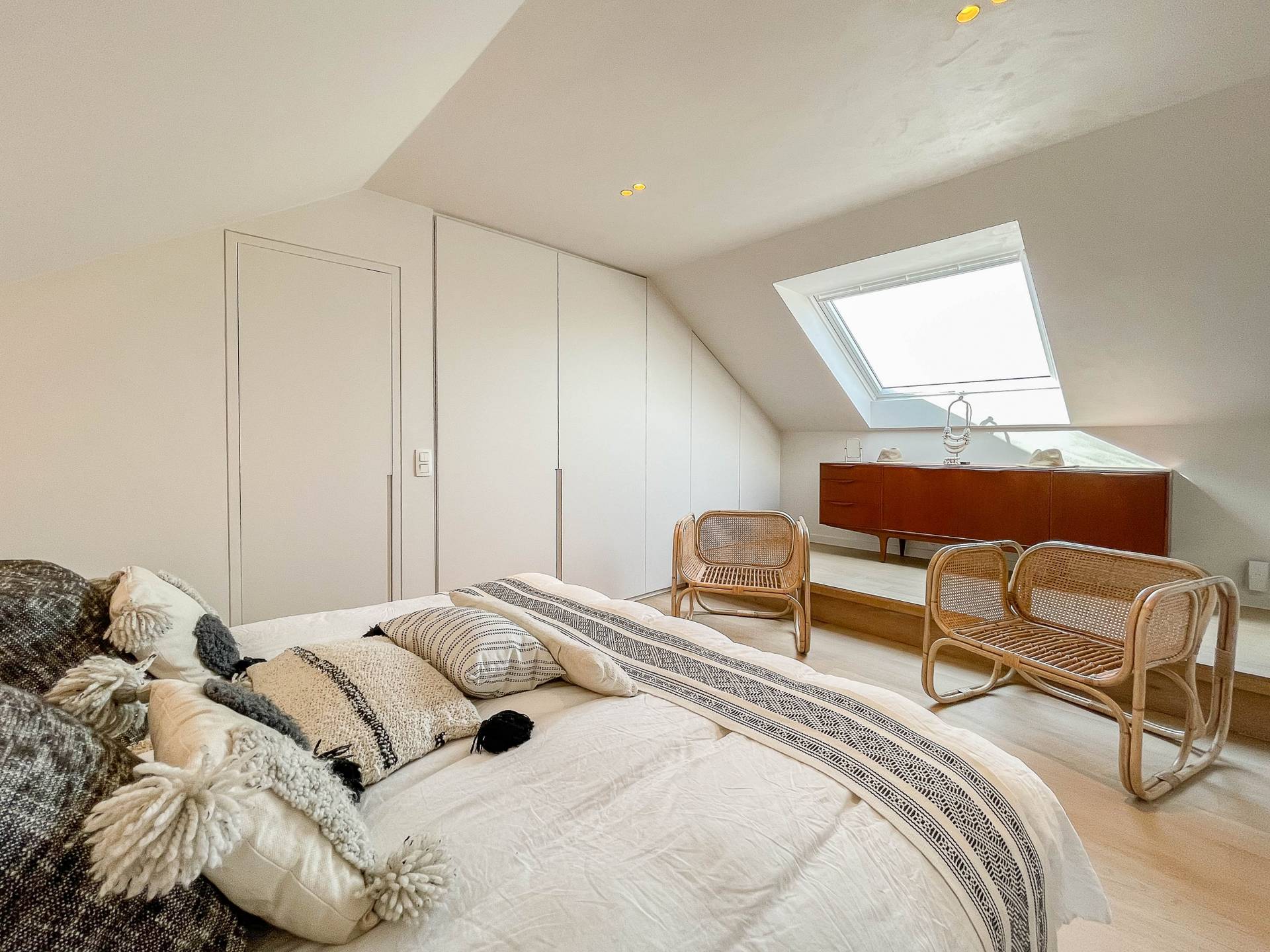 A l'étage supérieur, il y a 1 chambre à coucher spacieuse, aérée, avec beaucoup de placards. Vue ouverte sur le Zoute. Salle de bains luxueuse et achevée avec goût, comprenant douche spacieuse, lavabo et toilette.