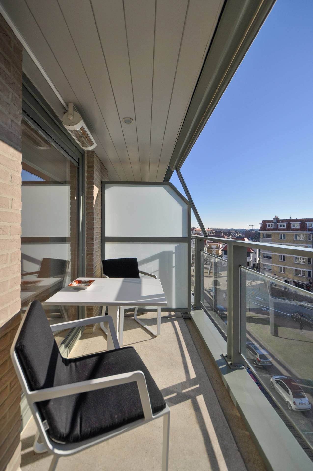Composition: Entrée avec toilette. Salon en parquet avec cuisine ouverte et donnant sur une vaste terrasse avec chauffage et une protection solaire. Local de rangement. Chambre à coucher avec des placards et donnant également sur la terrasse. Salle de douche avec douche et lavabo.