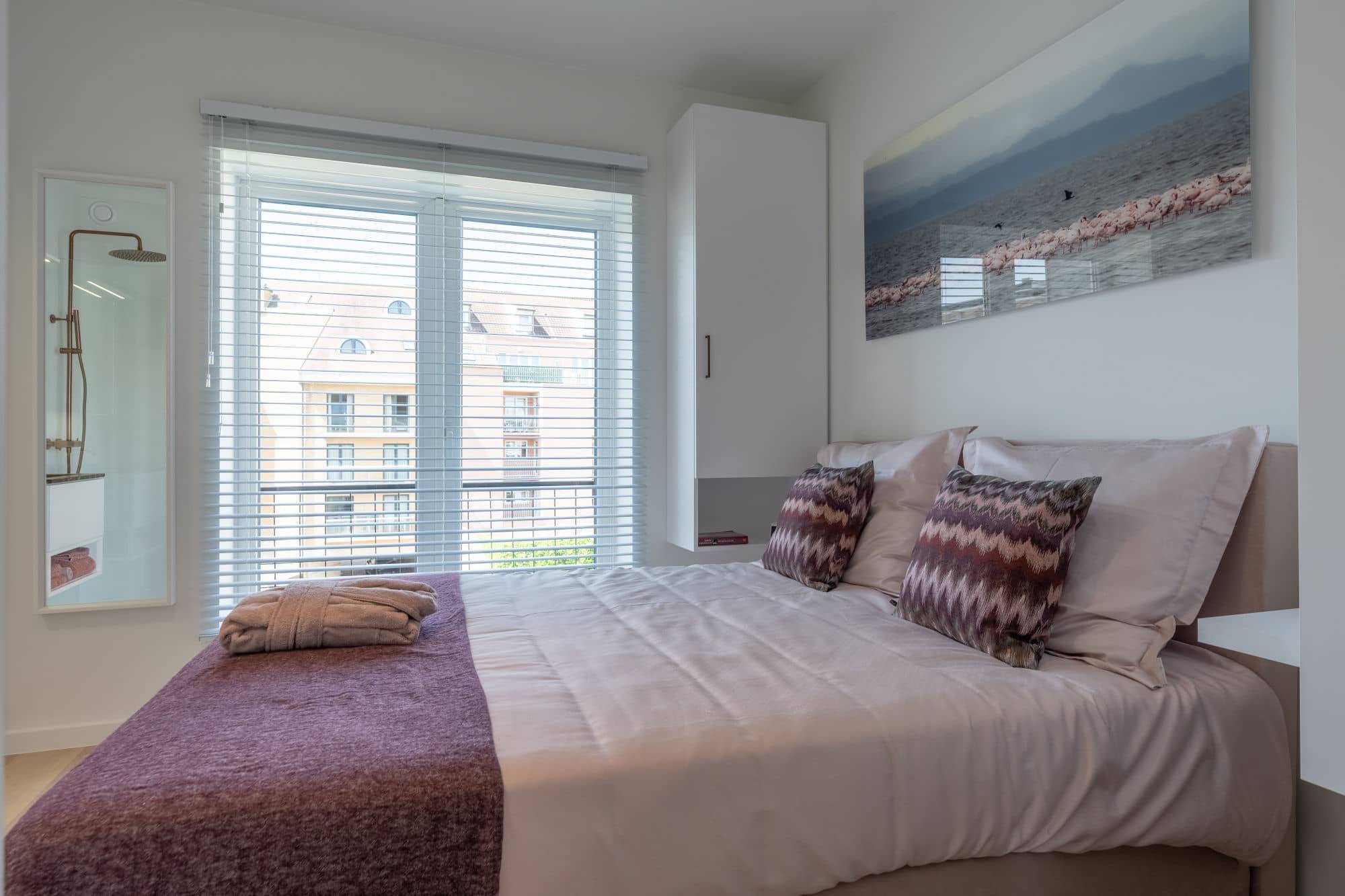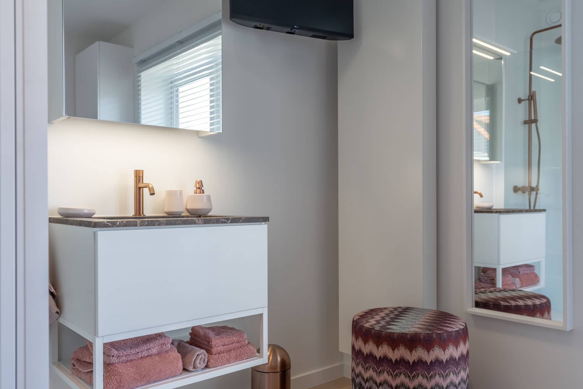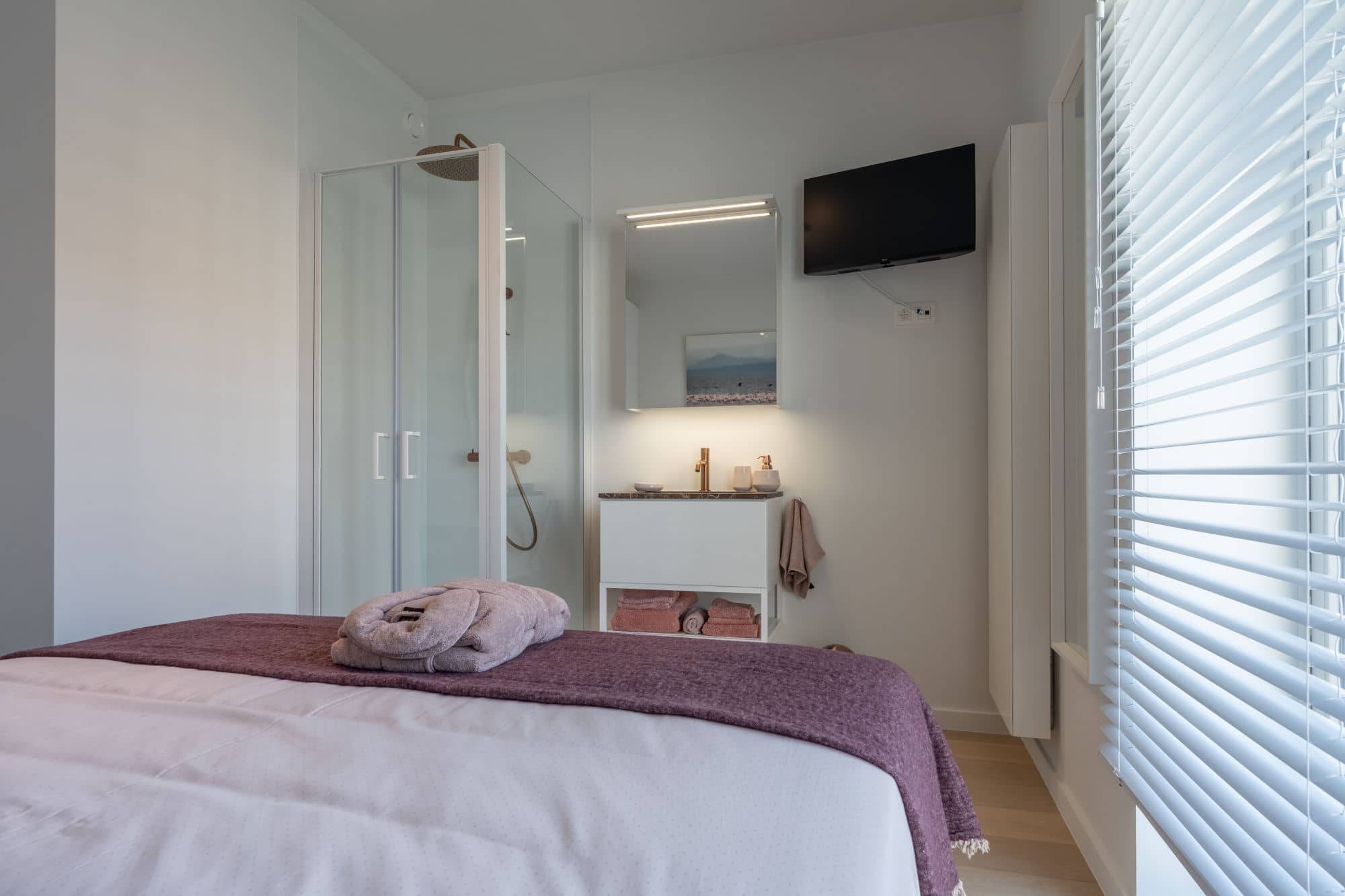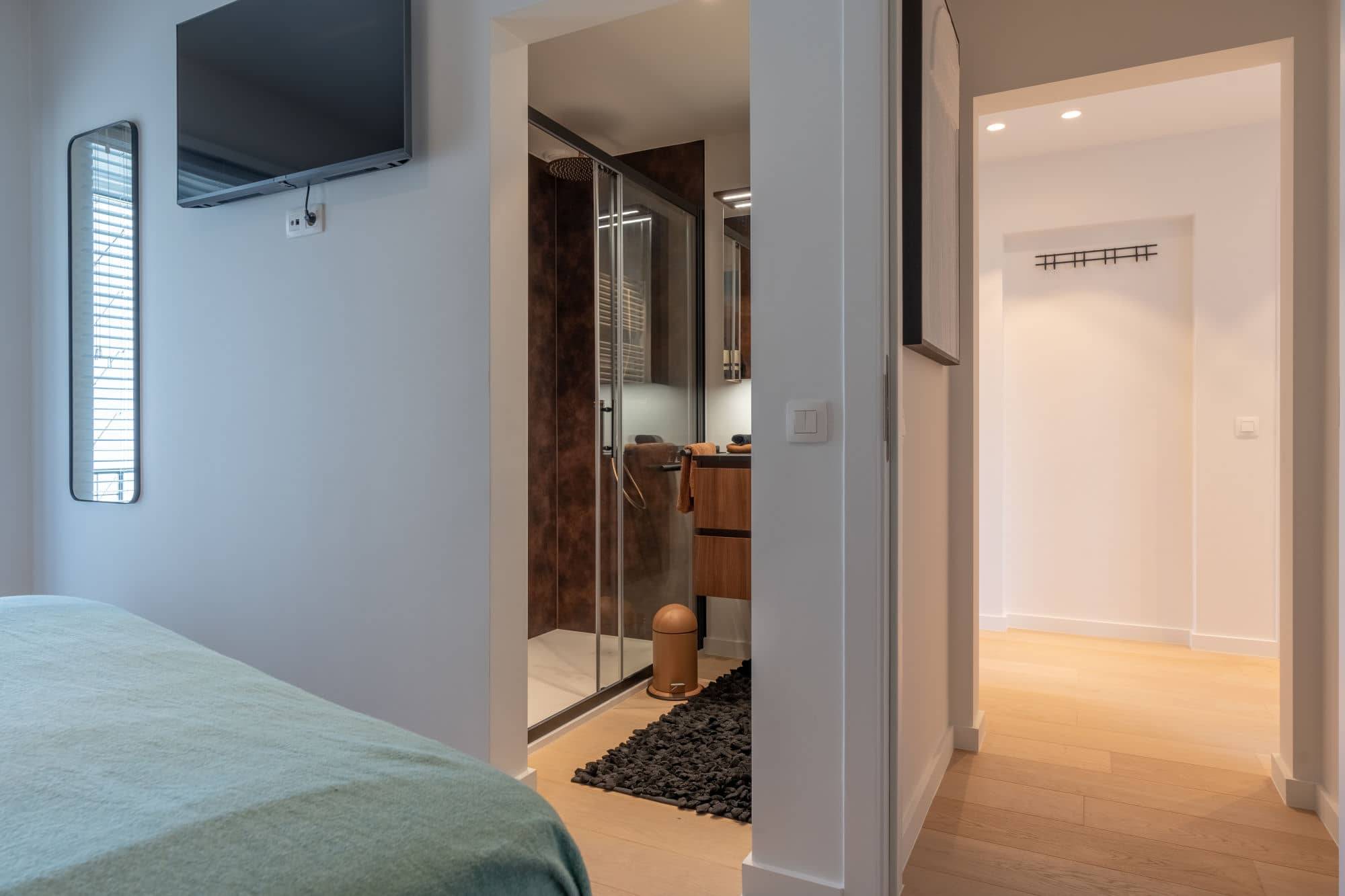 Cet appartement dispose de deux chambres à coucher spacieuses. La suite parentale est dotée d'une salle de bains luxueuse avec une grande douche à l'italienne et un meuble lavabo avec un espace de rangement suffisant. Depuis la suite parentale, vous avez accès à une terrasse ensoleillée où vous pouvez profiter du soleil du soir. La deuxième chambre, également équipée de sa propre douche et de son meuble lavabo, donne accès à la même terrasse ensoleillée.