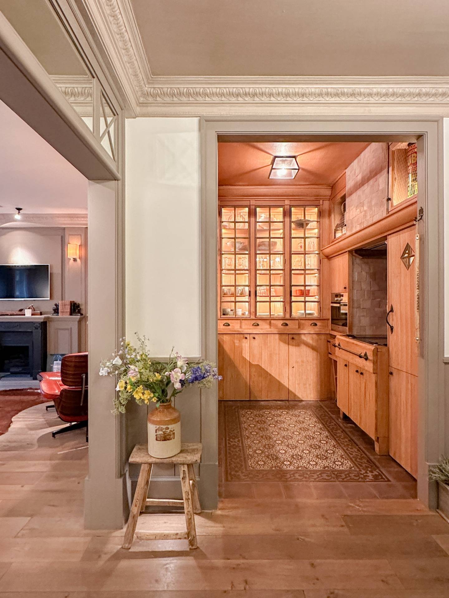 Composition: Hall d'entrée avec vestiaire. Salle de séjour avec cheminée et lambris, donnant sur une terrasse confortable et ensoleillée. Cuisine pratique, équipée d'appareils électroménagers Miele. La salle à manger est adjacente.