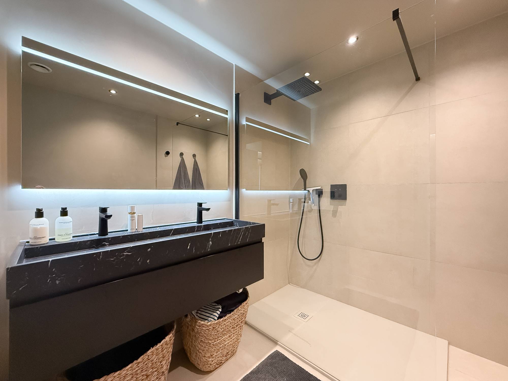 L’appartement comprend 2 chambres complètes avec placards intégrés, toutes deux avec accès direct à la terrasse. La salle de douche, fonctionnelle et raffinée, complète l’ensemble.