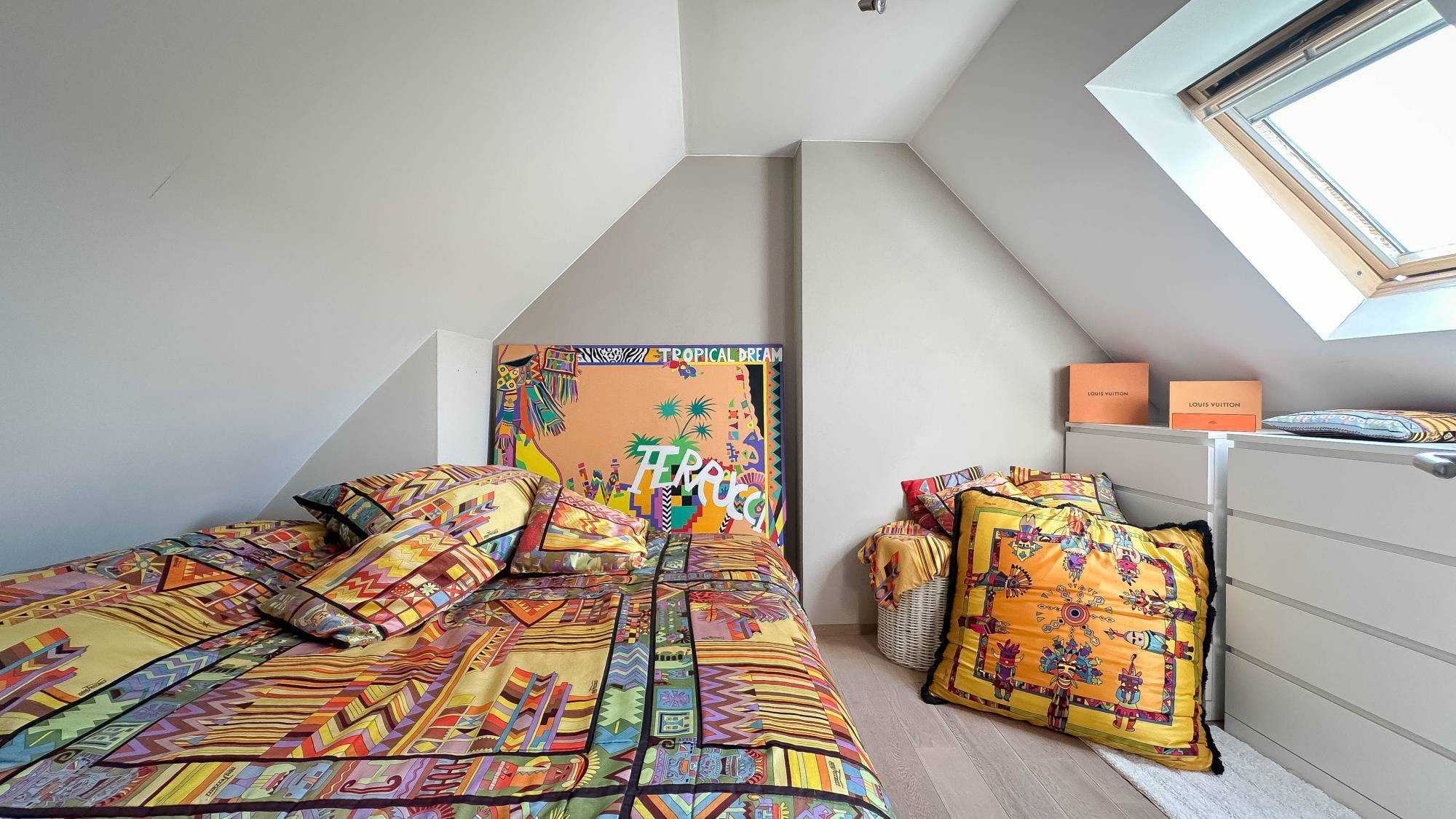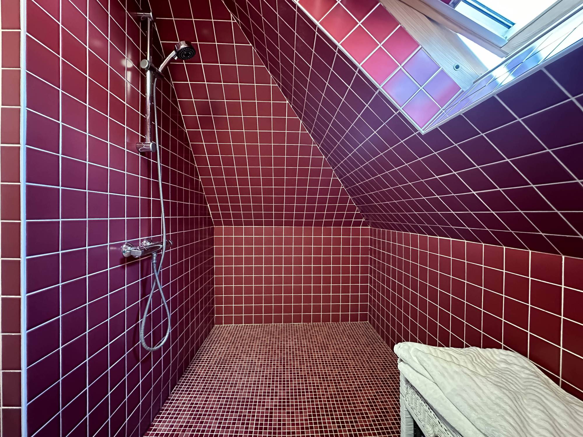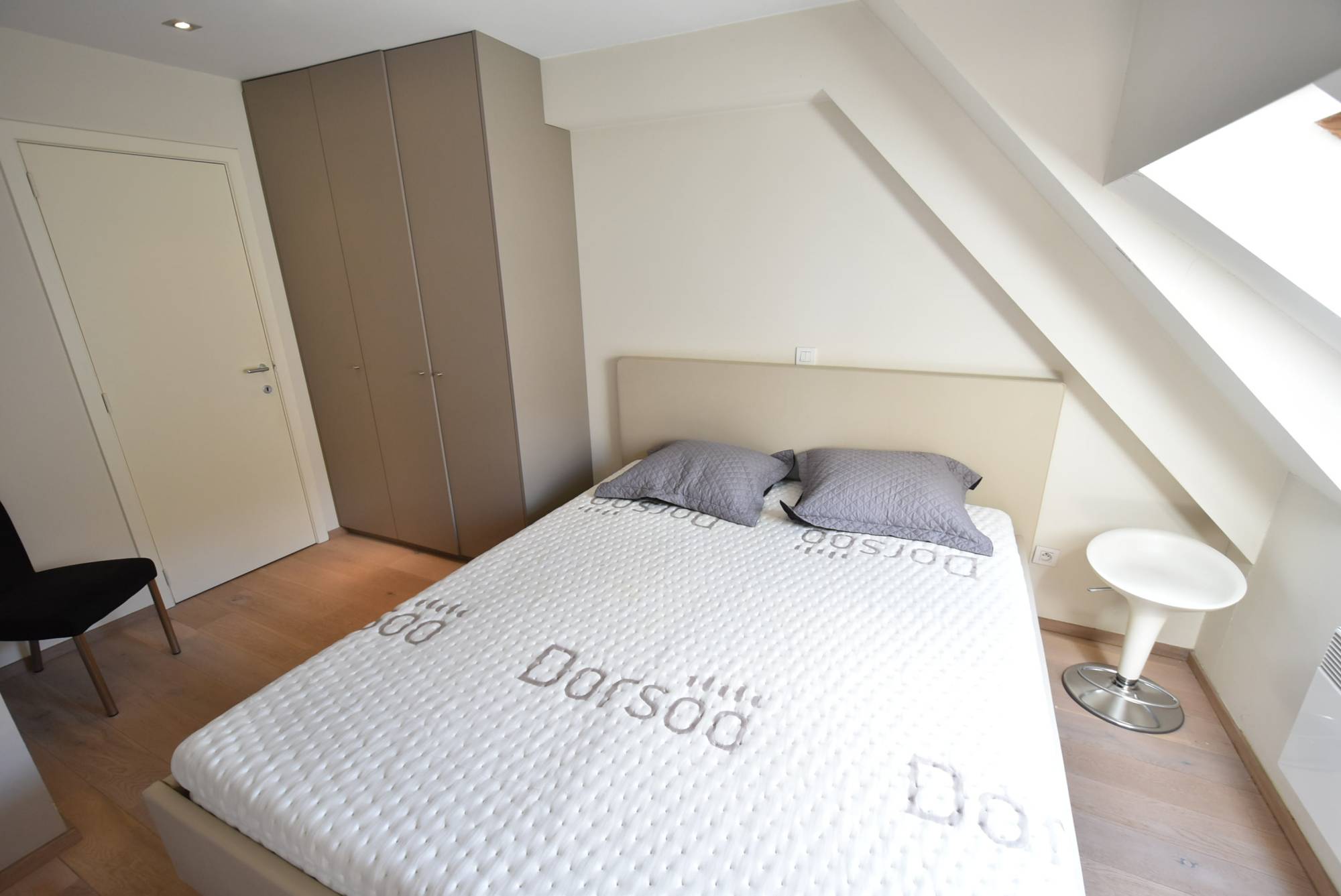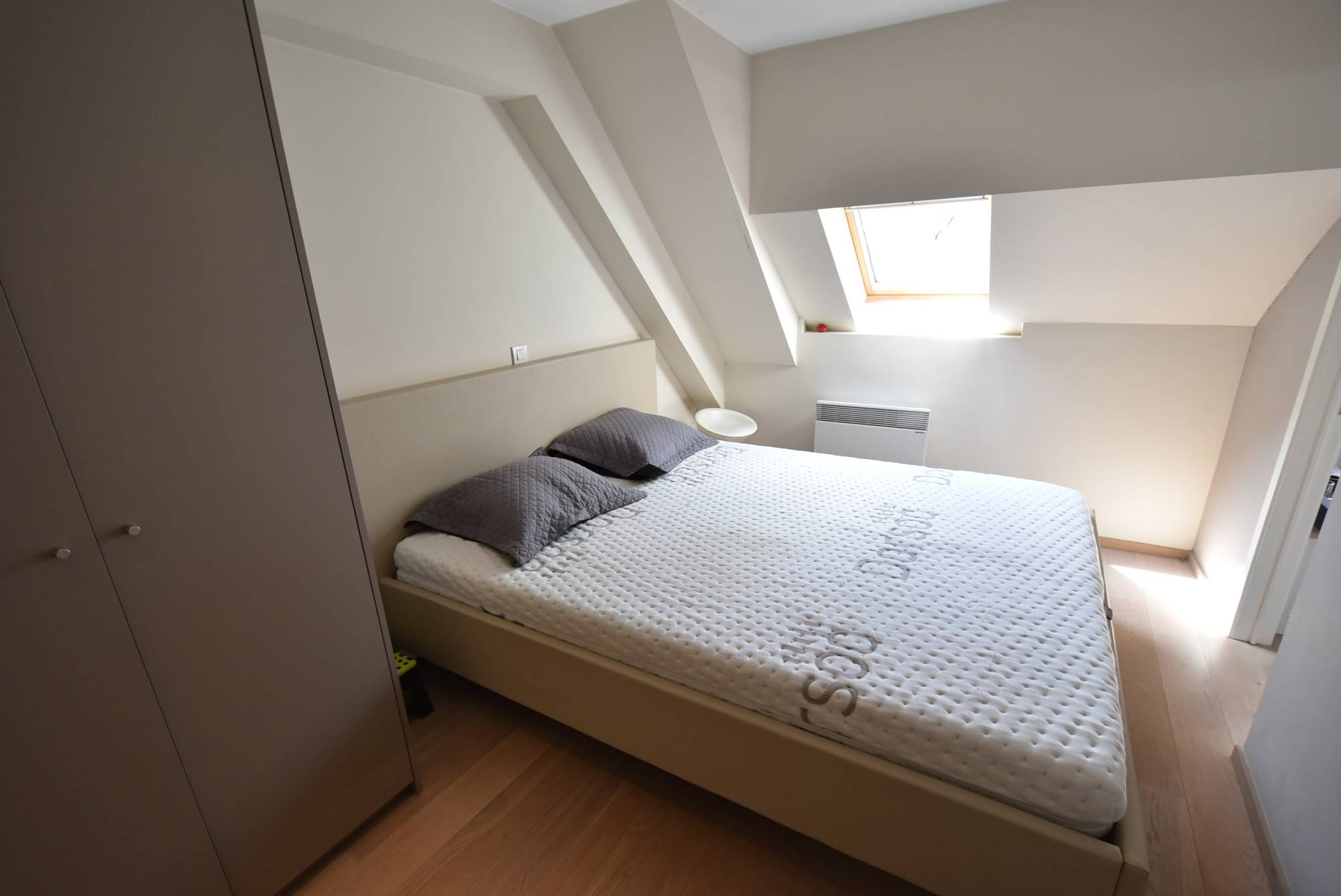 L'étage supérieur abrite une deuxième chambre, dotée d'une élégante salle de douche avec douche à l'italienne et lavabo, ainsi que de placards encastrés supplémentaires pour un confort optimal.