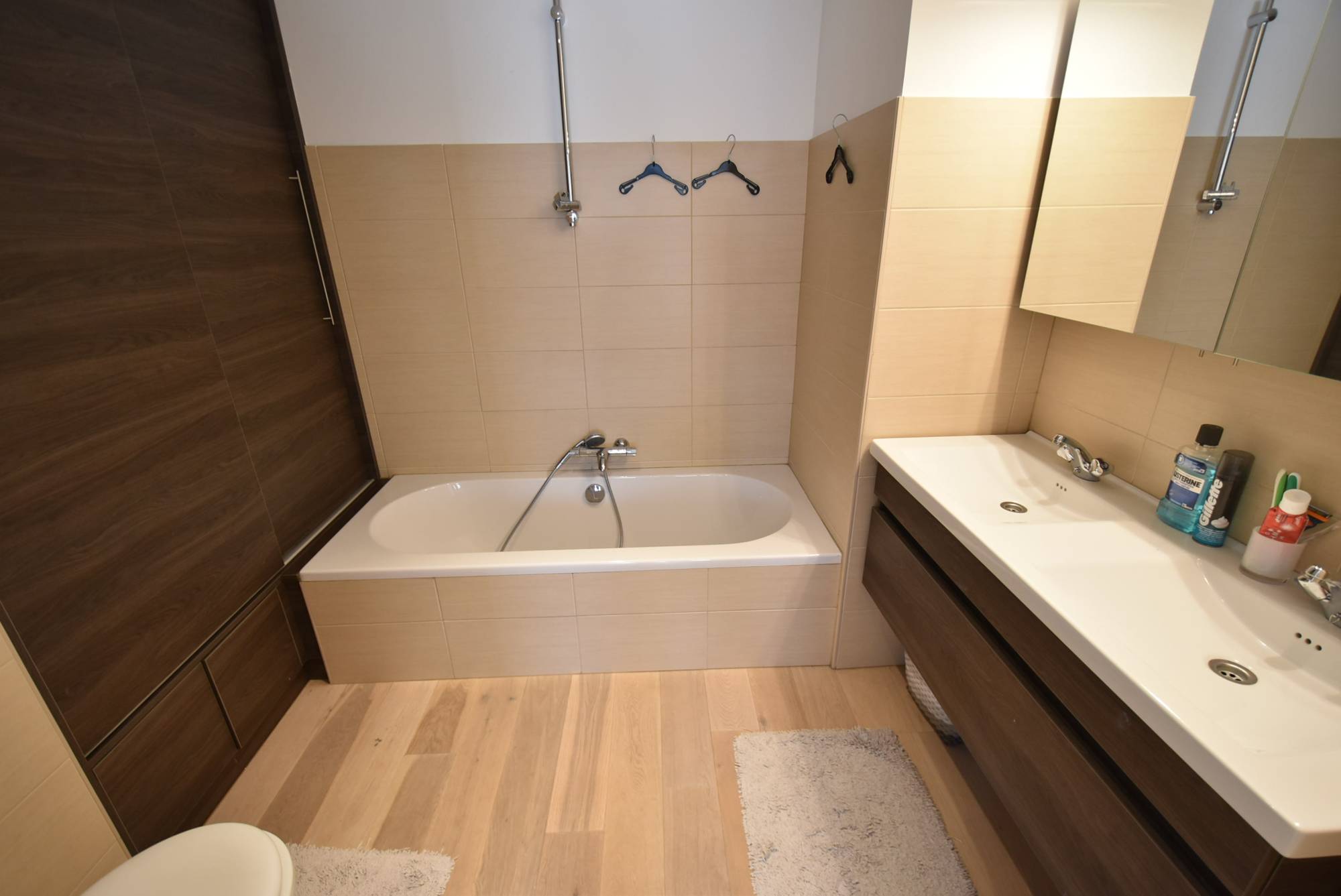 En entrant dans l'appartement, vous êtes accueilli dans un hall d'entrée avec toilettes invités. Le salon lumineux offre une ambiance chaleureuse et s'étend harmonieusement vers un coin repas convivial. La cuisine moderne ouverte est entièrement équipée avec tout le confort nécessaire et donne accès à une buanderie pratique. Les deux terrasses ensoleillées invitent à la détente et à profiter du soleil. Au même niveau, vous trouverez une chambre spacieuse avec des placards encastrés et une luxueuse salle de bains attenante.