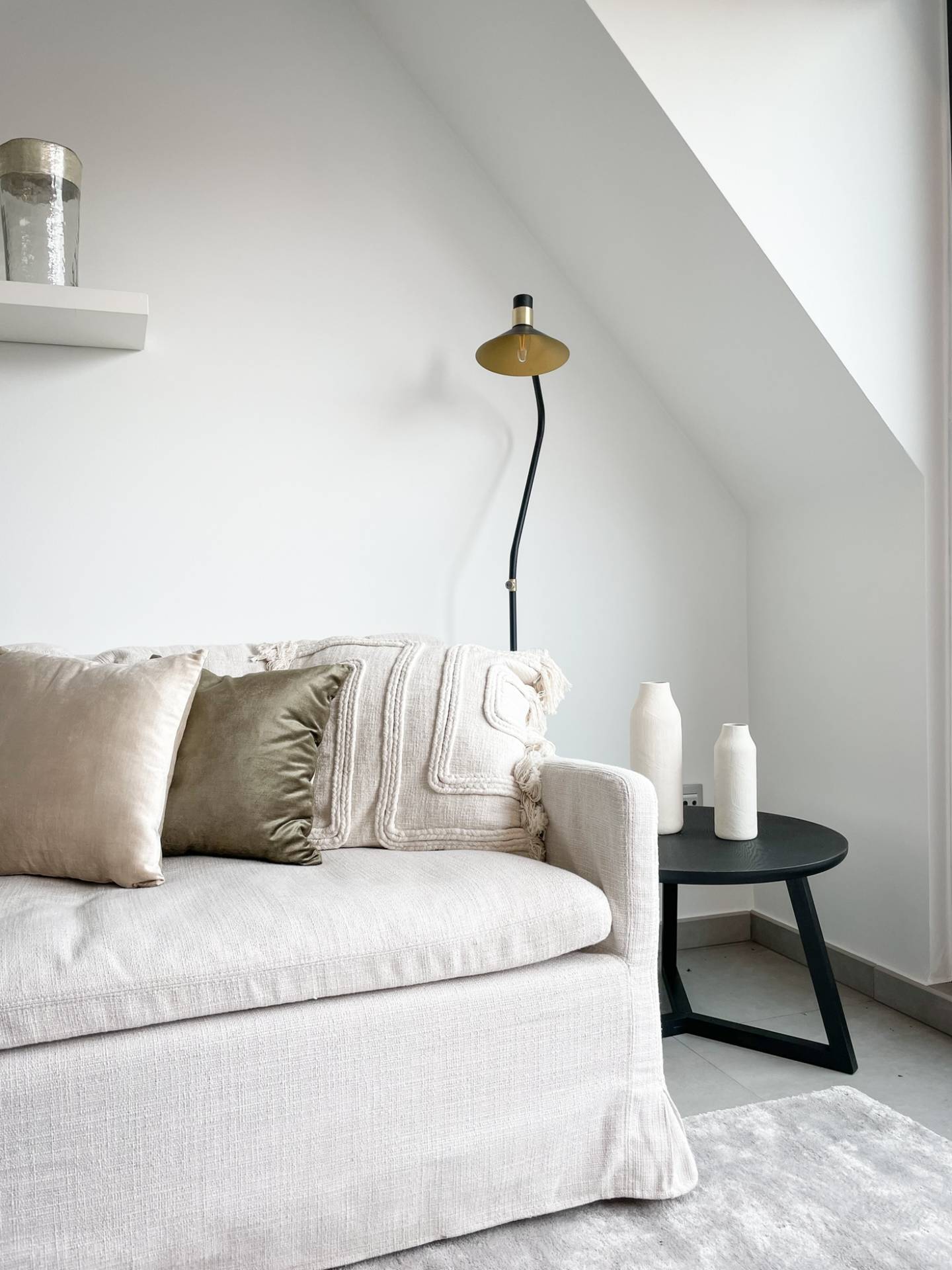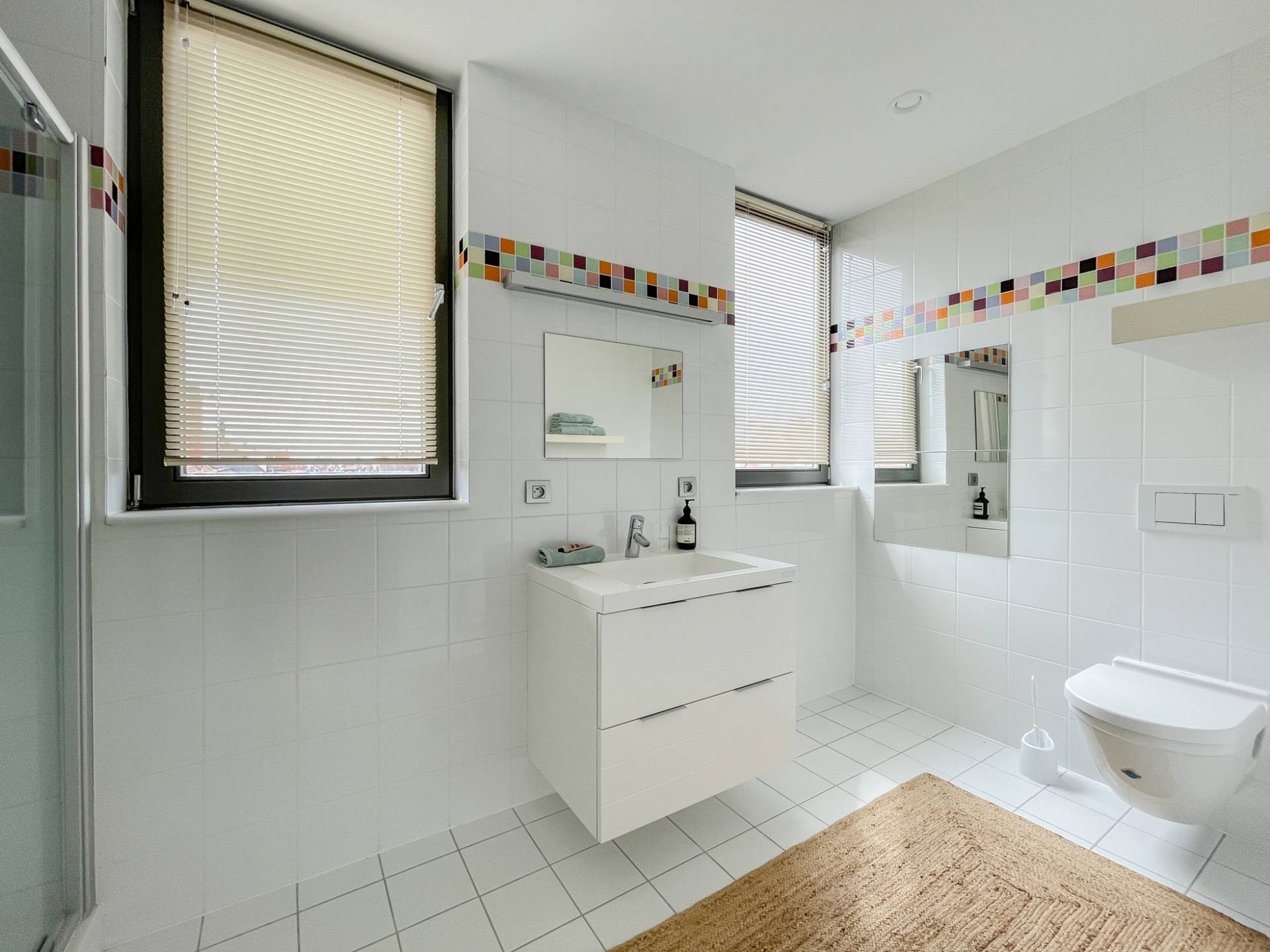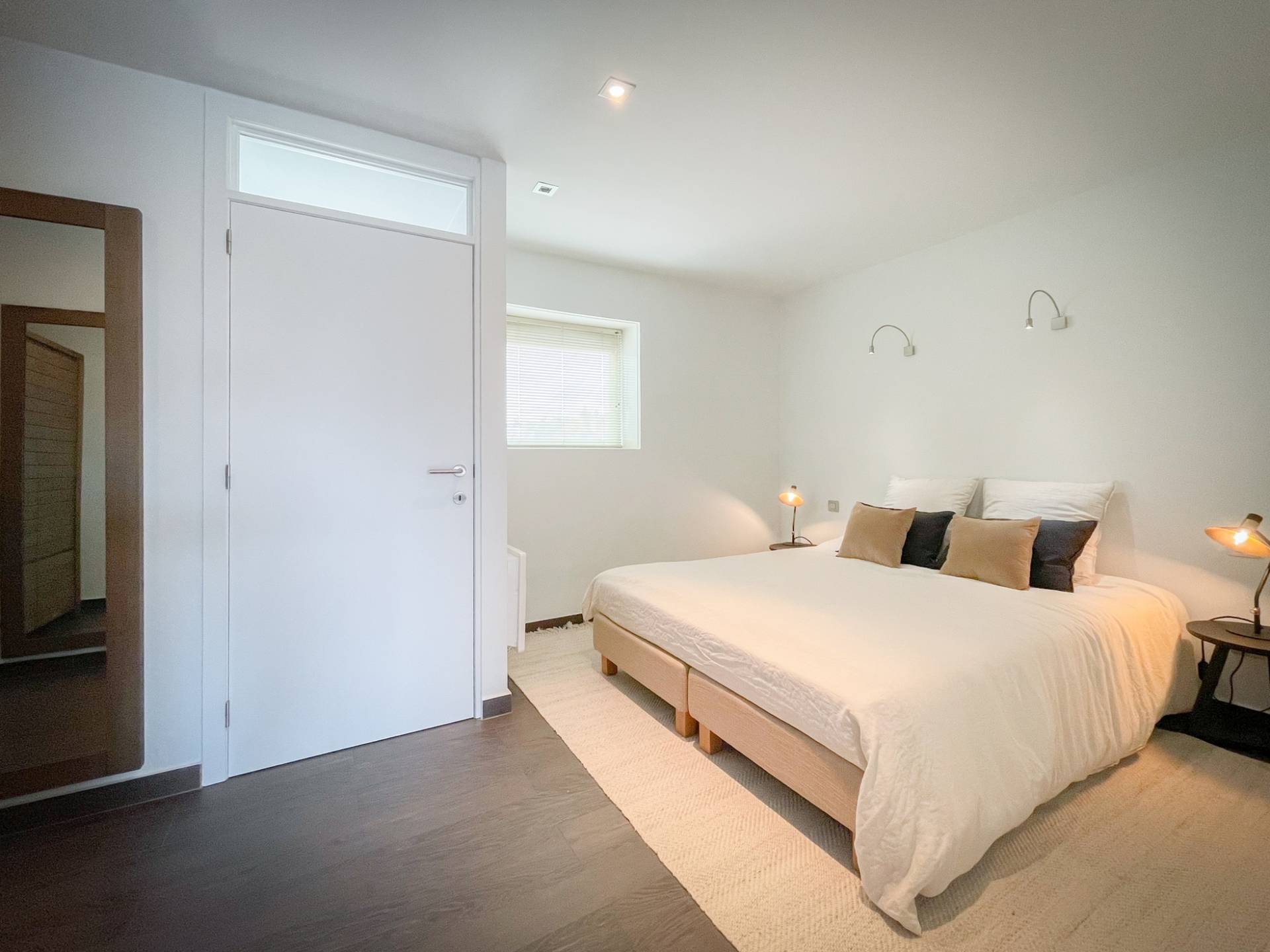 Composition: Hall d'entrée avec toilettes invités. Cuisine ouverte équipée de tout le confort avec coin repas, suivie du salon donnant sur l'agréable terrasse. Au même niveau, se trouve la chambre à coucher principale avec un espace supplémentaire pour une armoire/dressing. Salle de bains attenante avec double lavabo. Débarras avec raccordement pour machine à laver.