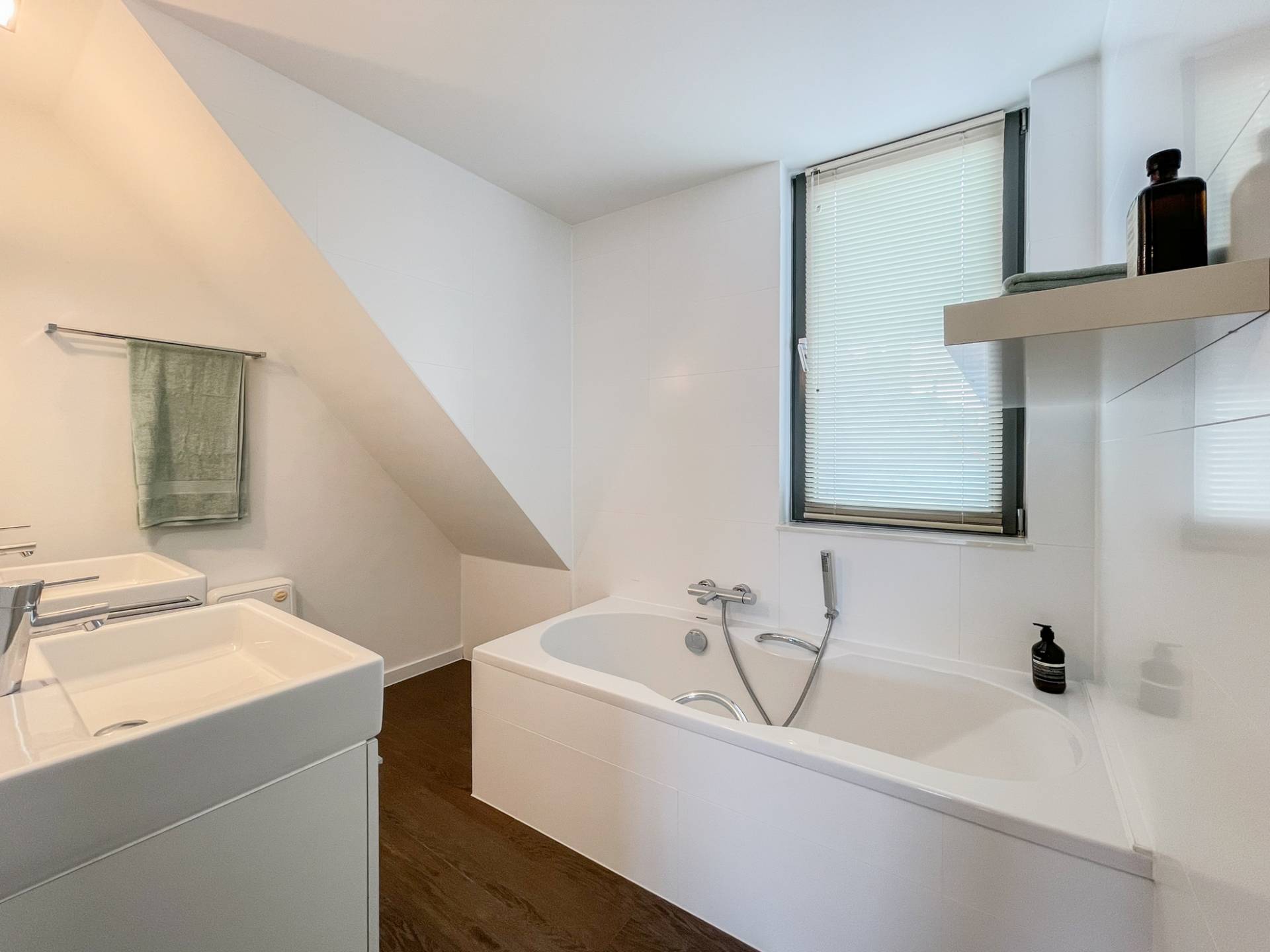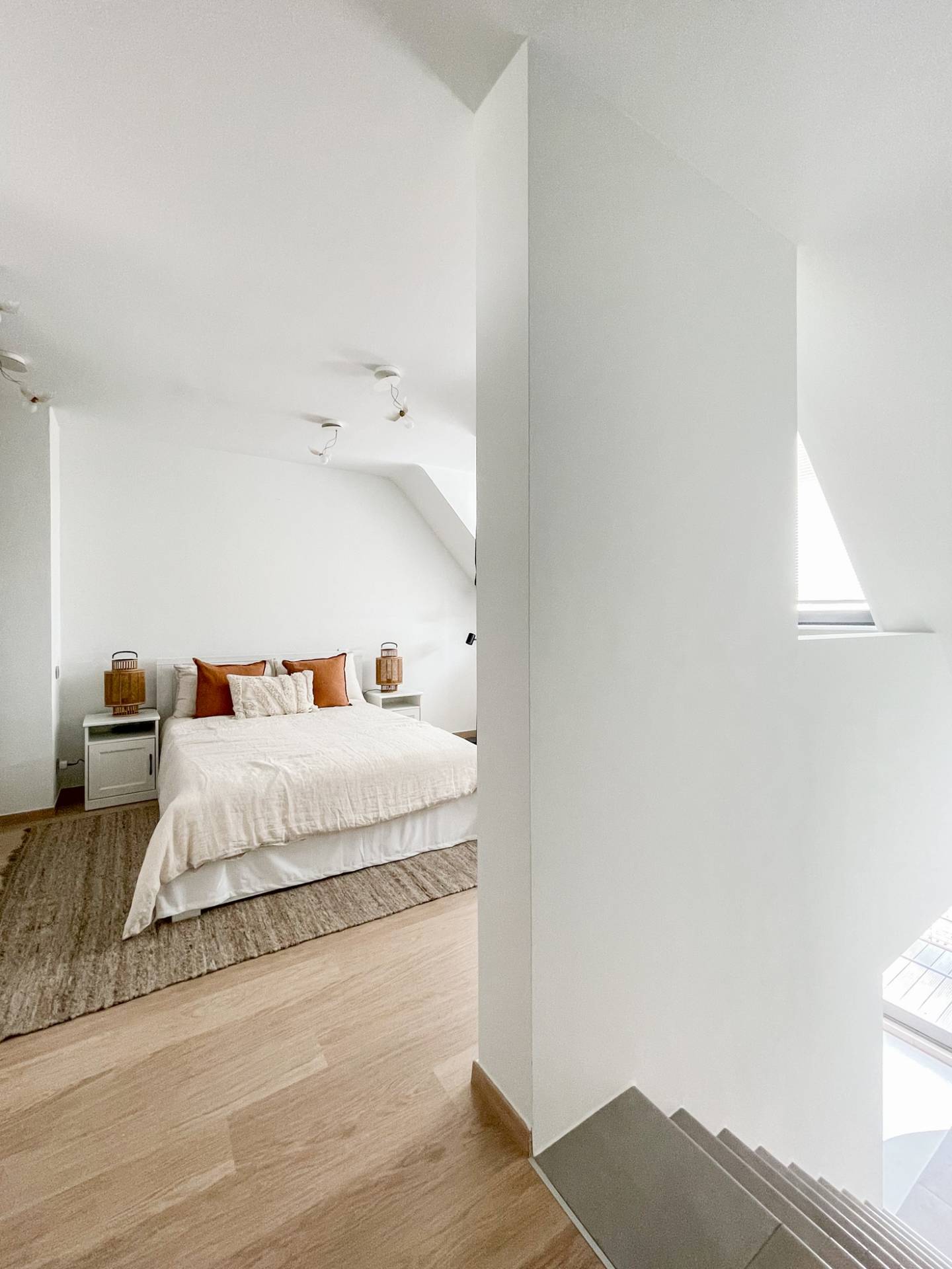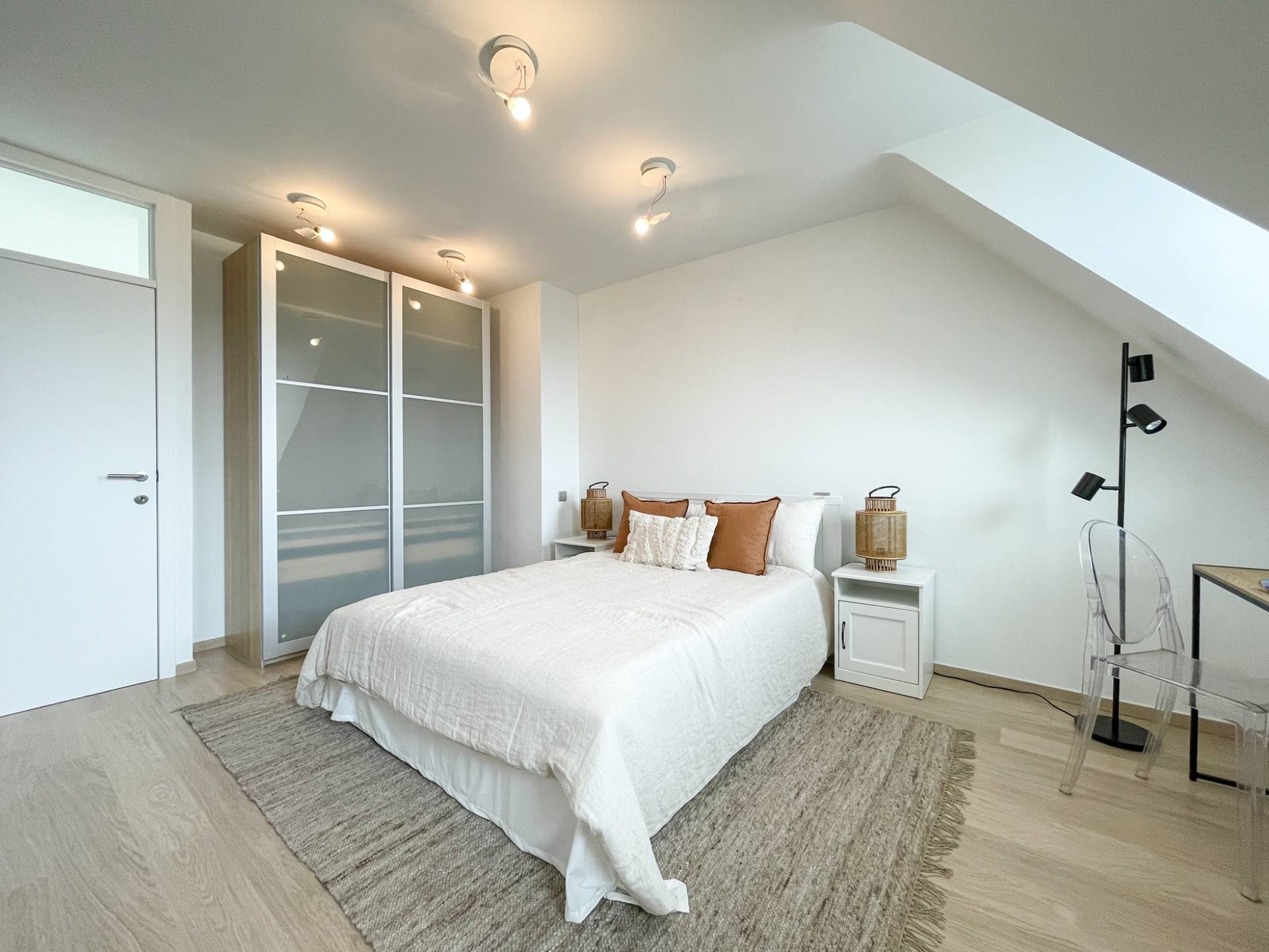 À l'étage supérieur se trouve une deuxième chambre, très spacieuse avec une salle de douche et des toilettes attenantes. Cette 2ème chambre fait 19m2 et peut donc être utilisée comme un espace multifonctionnel selon vos besoins.