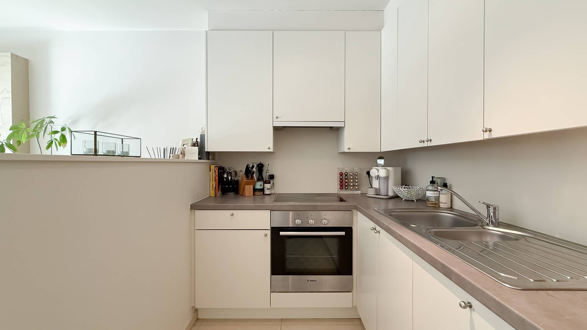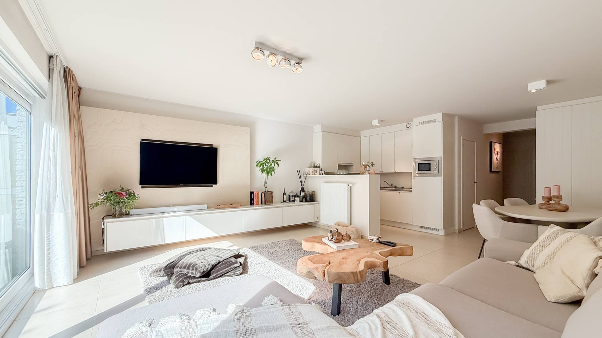 L’espace de vie lumineux et spacieux constitue le cœur du logement, avec une cuisine ouverte entièrement équipée qui s’intègre harmonieusement au coin salon confortable. De grandes baies vitrées laissent entrer la lumière naturelle et offrent une vue sur la terrasse récemment rénovée, exposée plein sud.