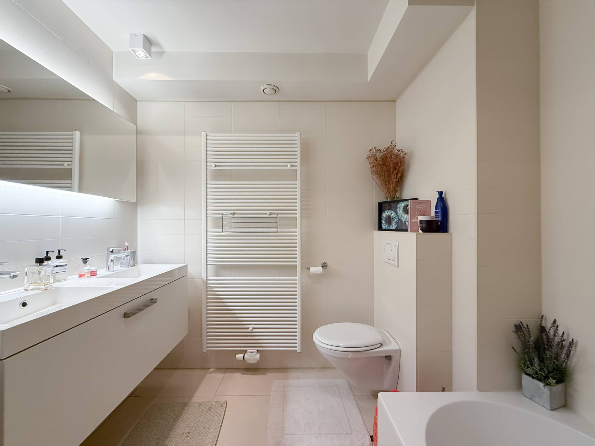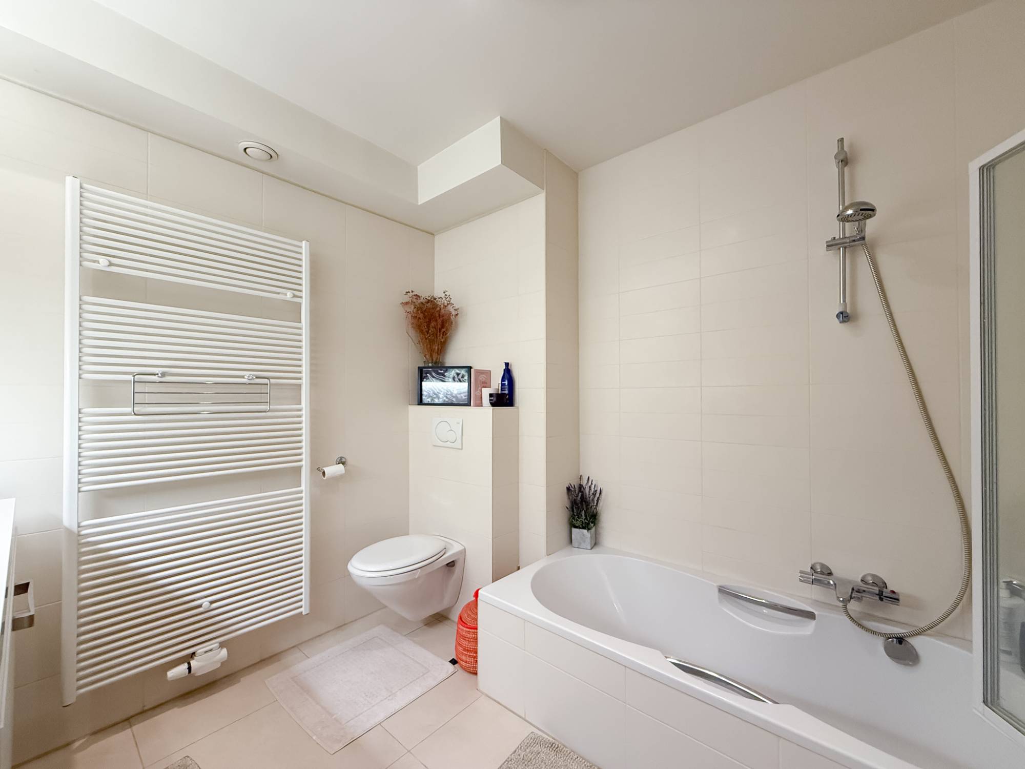 L’appartement comprend deux chambres de belle taille et une salle de bains élégante avec baignoire et douche. Un espace buanderie séparé ajoute une fonctionnalité supplémentaire.
