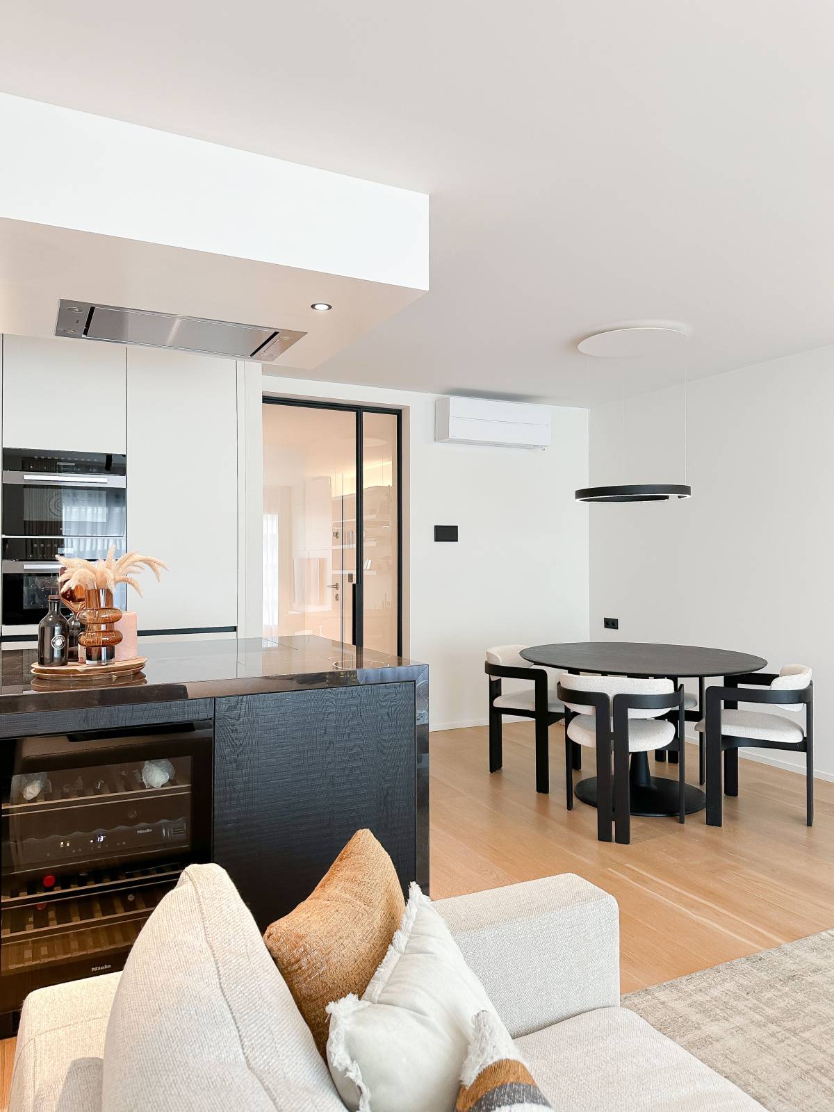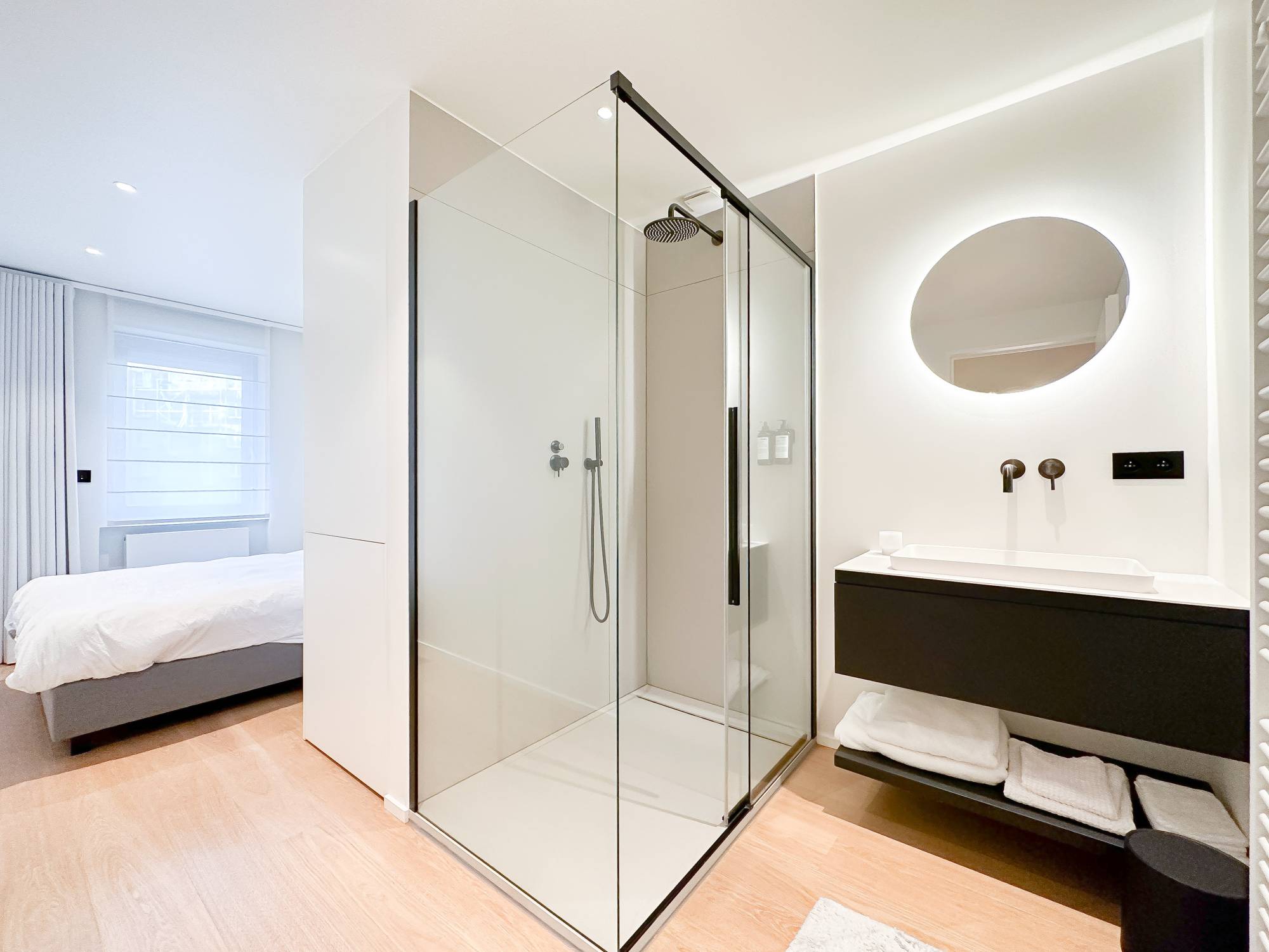 Disposition: Hall d'entrée spacieux avec vestiaire et toilettes invités. Le salon, avec parquet et une cheminée au bioéthanol accueillante, bénéficie d'une belle vue latérale sur la mer. La cuisine ouverte est équipée de tout le confort, avec des appareils Miele haut de gamme, dont un frigo à vin. À l'arrière, on trouve deux chambres complètes, chacune avec sa propre salle de douche et une terrasse orienté sud-ouest.