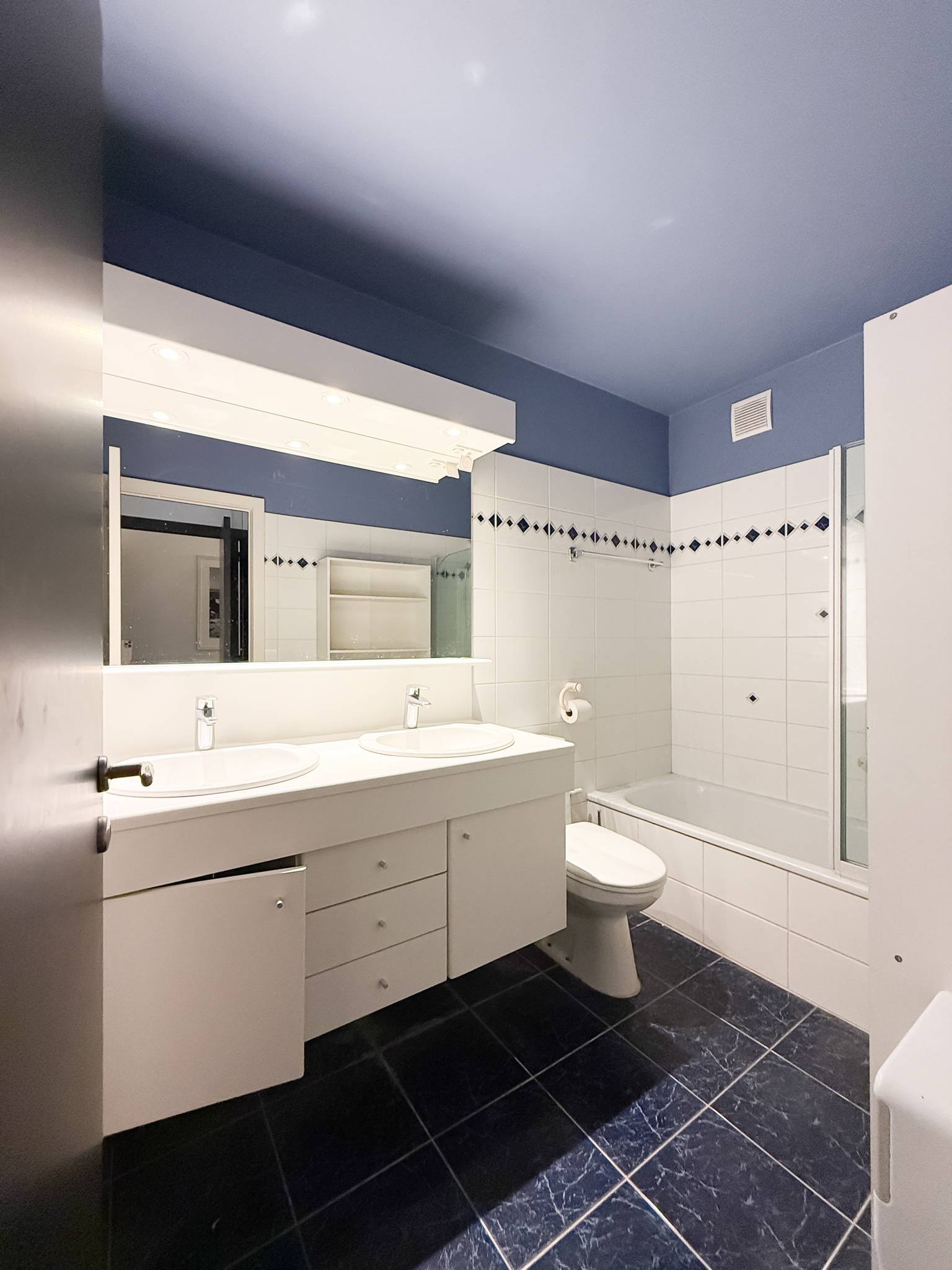 L’appartement dispose de deux chambres à coucher, toutes deux donnant accès à une terrasse à l’arrière. Il comprend également une salle de bains avec double lavabo, baignoire et toilette, ainsi qu’une salle de douche avec douche et lavabo.