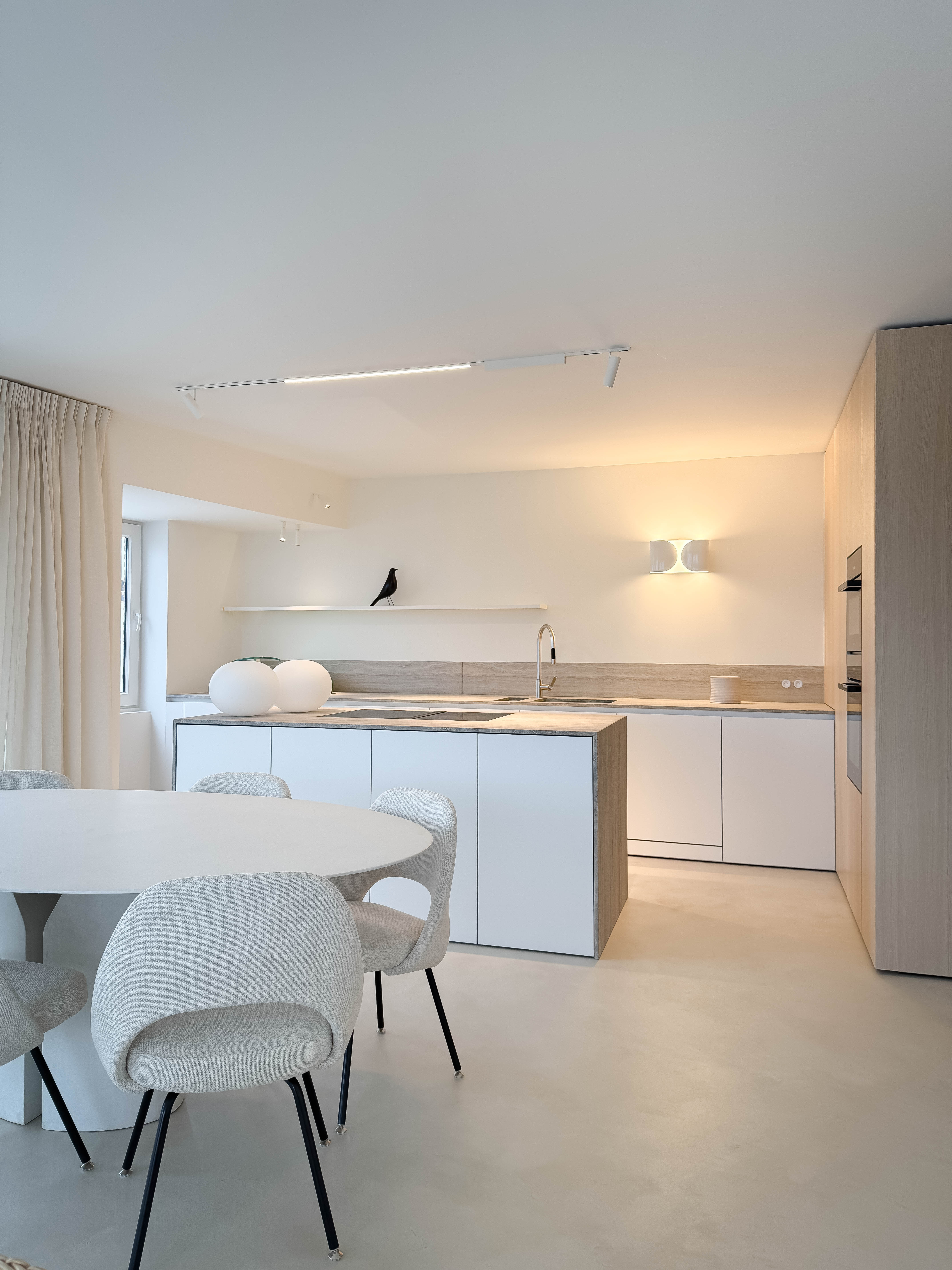 Disposition: Hall d'entrée avec toilettes invités et vestiaire. Salon ensoleillé et lumineux, situé à l'angle, avec une terrasse orientée sud et sud-ouest et une magnifique vue sur la mer. Les sols de tout l'appartement sont en béton ciré, ce qui crée une sensation d'espace immense. Coin repas. Cuisine ouverte, entièrement équipée avec des appareils électroménagers Miele et un réfrigérateur à vin intégré.
