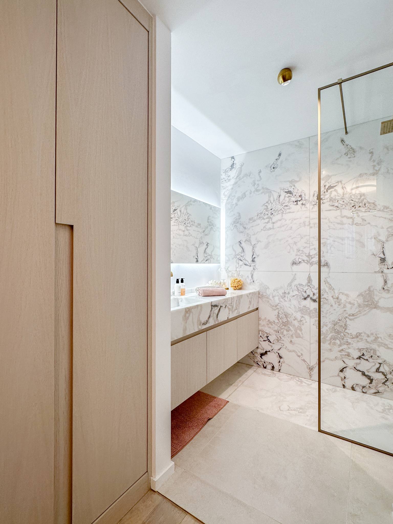 Chambre à coucher principale avec armoires encastrées et salle d'eau attenante avec douche à l'italienne. La deuxième chambre sert actuellement de dressing et chambre d'amis et bénéficie également d'une salle de douche attenante.