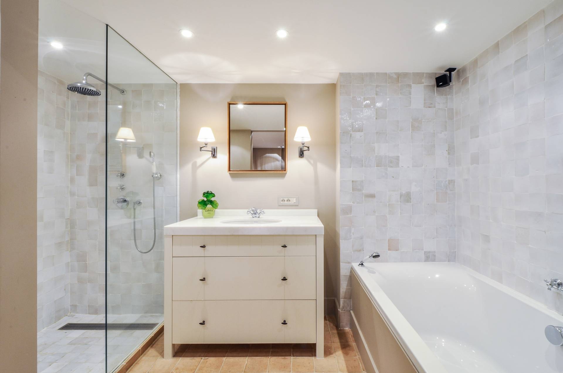 Composition: Hall d'entrée avec vestiaire et toilette. Agréable séjour. Cuisine ouverte (marbre blanc). Belle terrasse ensoleillée plein sud avec vue ouverte sur les villas et l'avenue du Littoral. Chambre à coucher luxueuse avec dressing et superbe salle de bains avec toilette, lavabo, baignoire et douche. 2ème Chambre à coucher avec sa salle de douche.