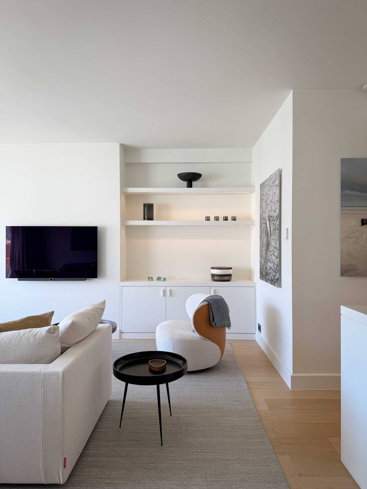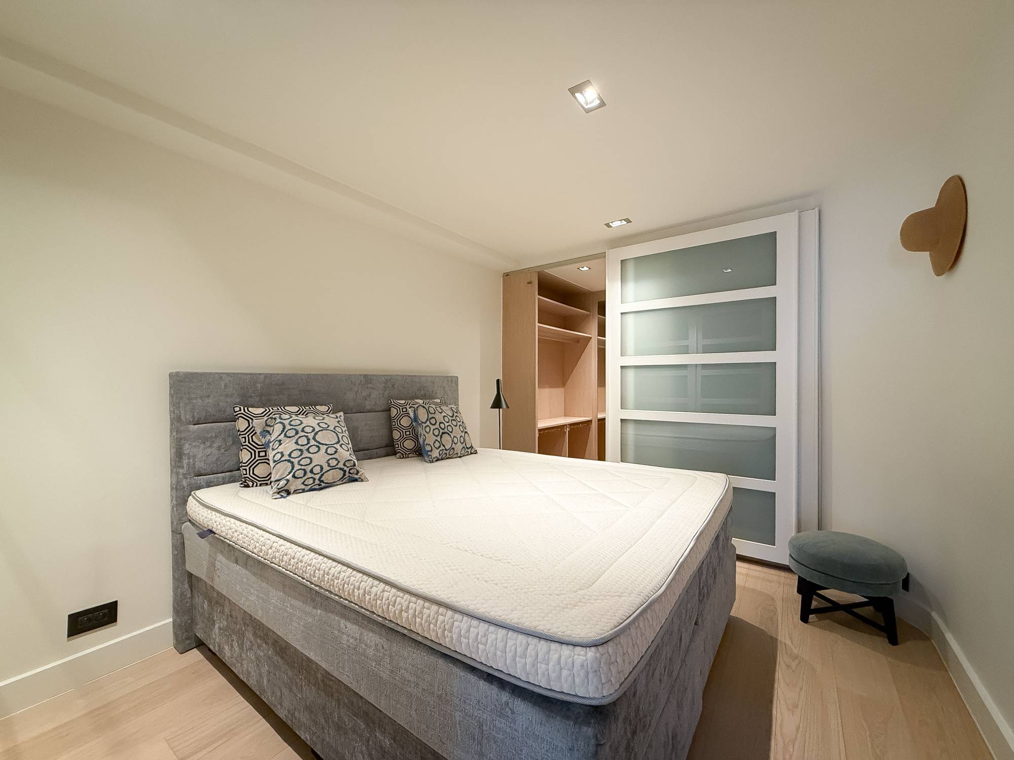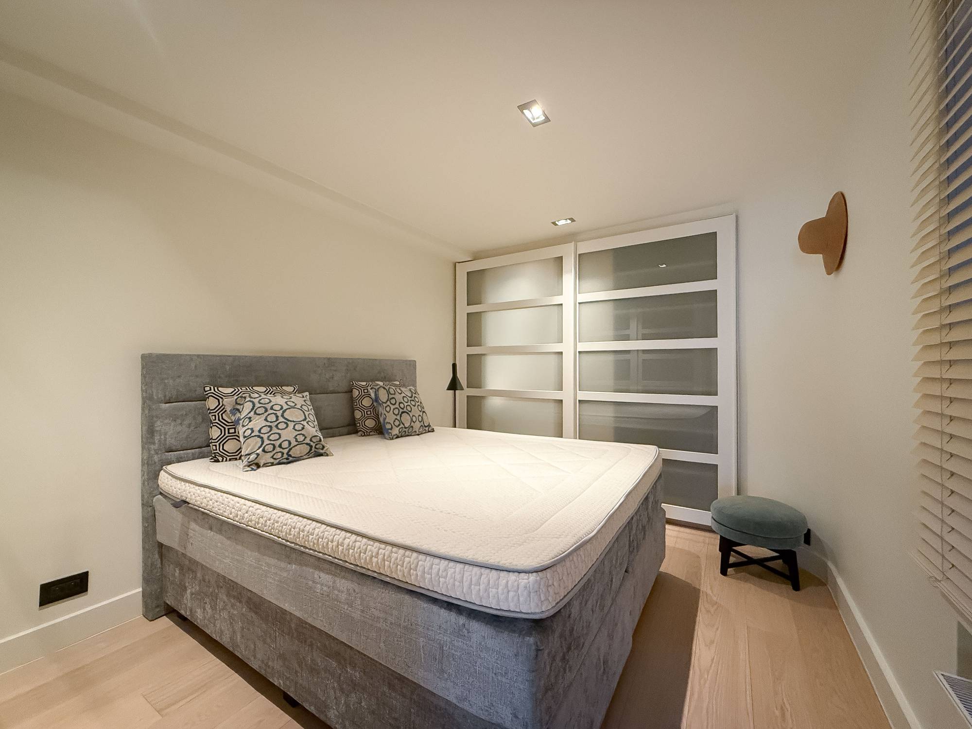 Le hall d’entrée spacieux avec toilette invités vous mène vers un séjour baigné de lumière et un coin repas avec vue sur la verdure environnante, les boutiques exclusives et les résidences-villas du Zoute. L’espace de vie est aménagé avec des meubles élégants de R&R et décoré d’œuvres de Tom Jones. Le patio orienté plein sud sert de terrasse privée, équipé d’un store solaire automatique couvrant toute la largeur de la façade pour une ombre agréable à la demande.