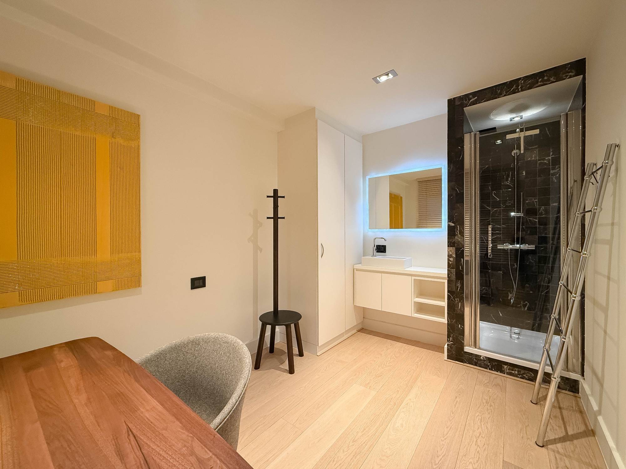 Possibilité de reprise de l’ensemble du mobilier R&R, des œuvres de Tom Jones et Bart Verheyen, ainsi que de tout l’ameublement de la chambre (Swiss Sense).