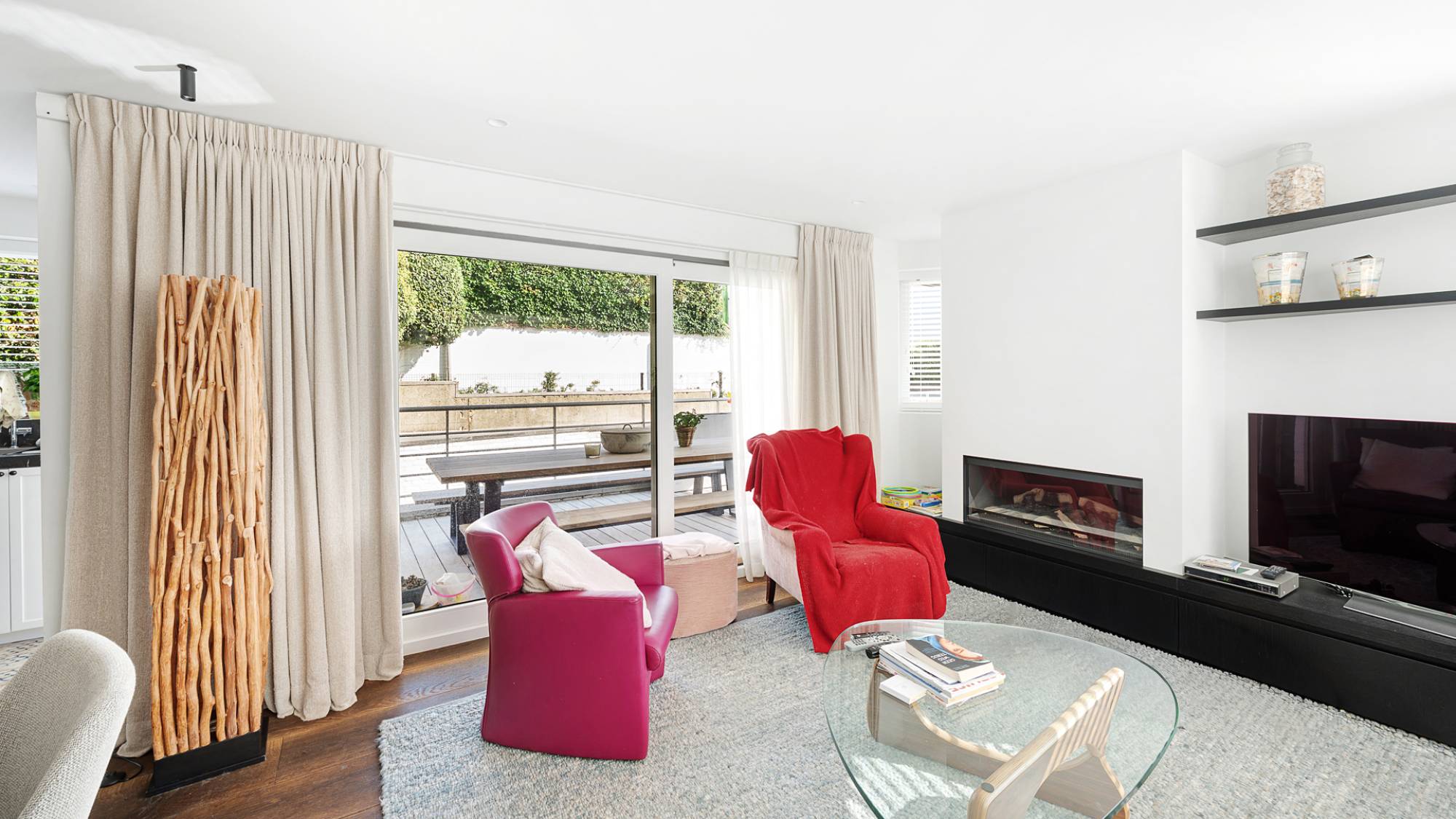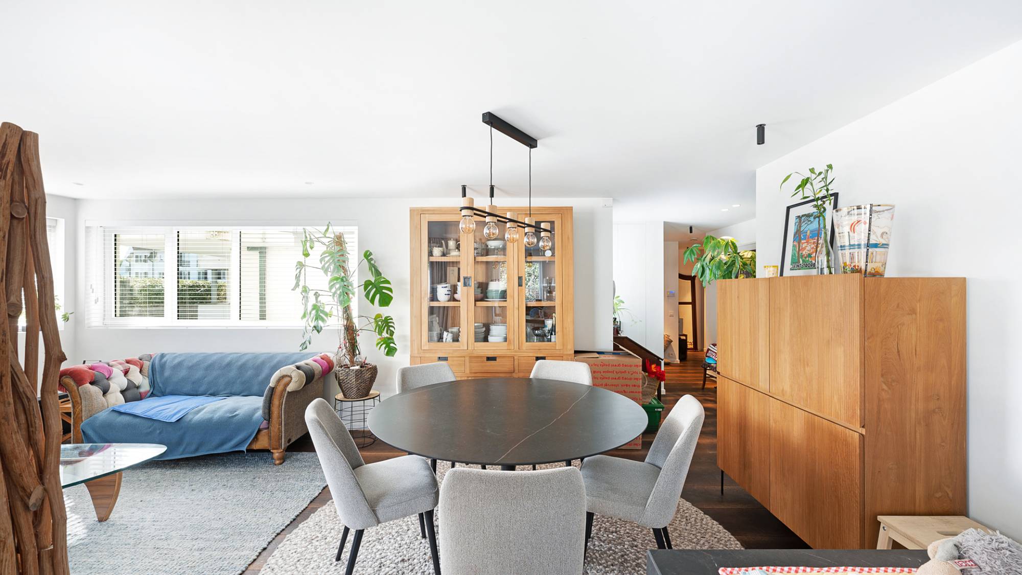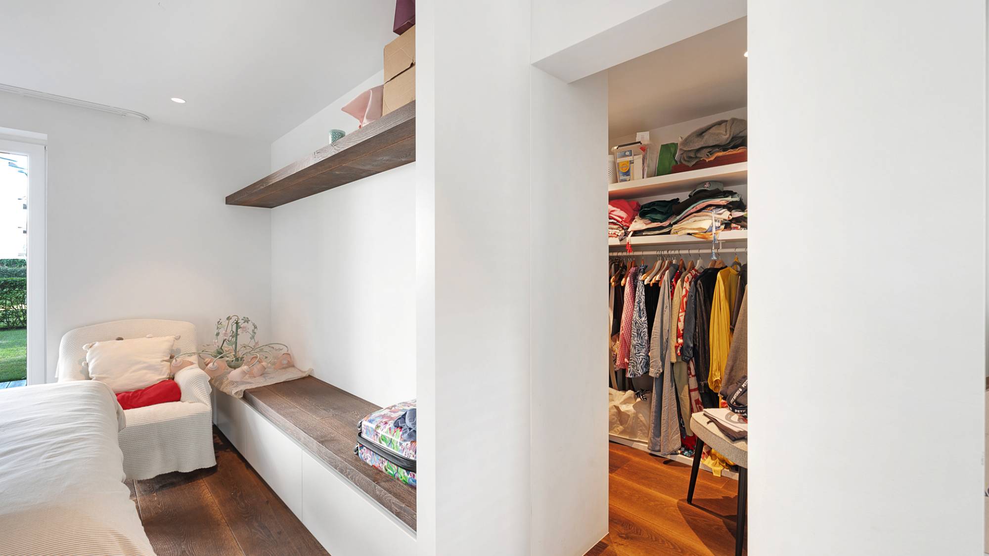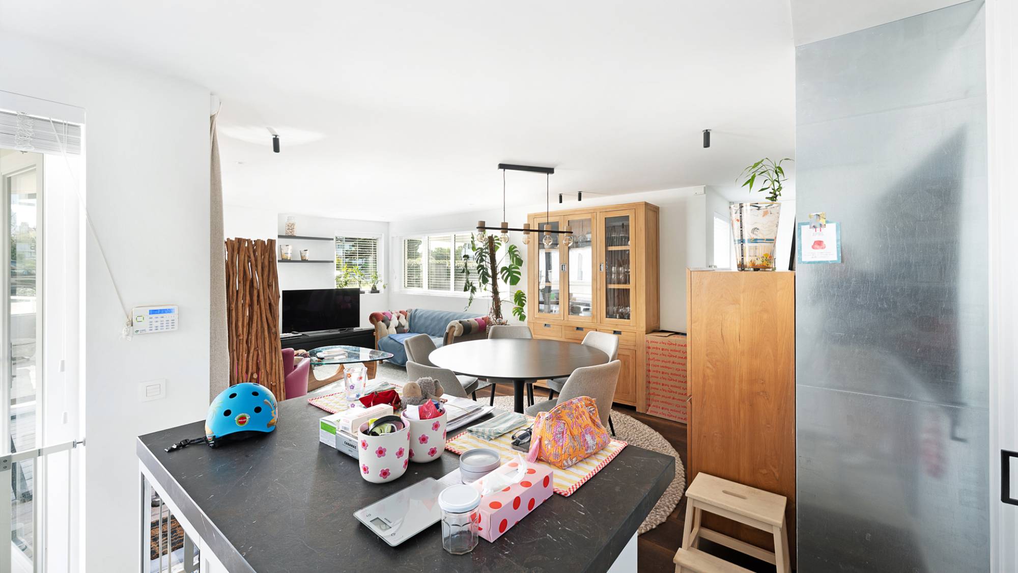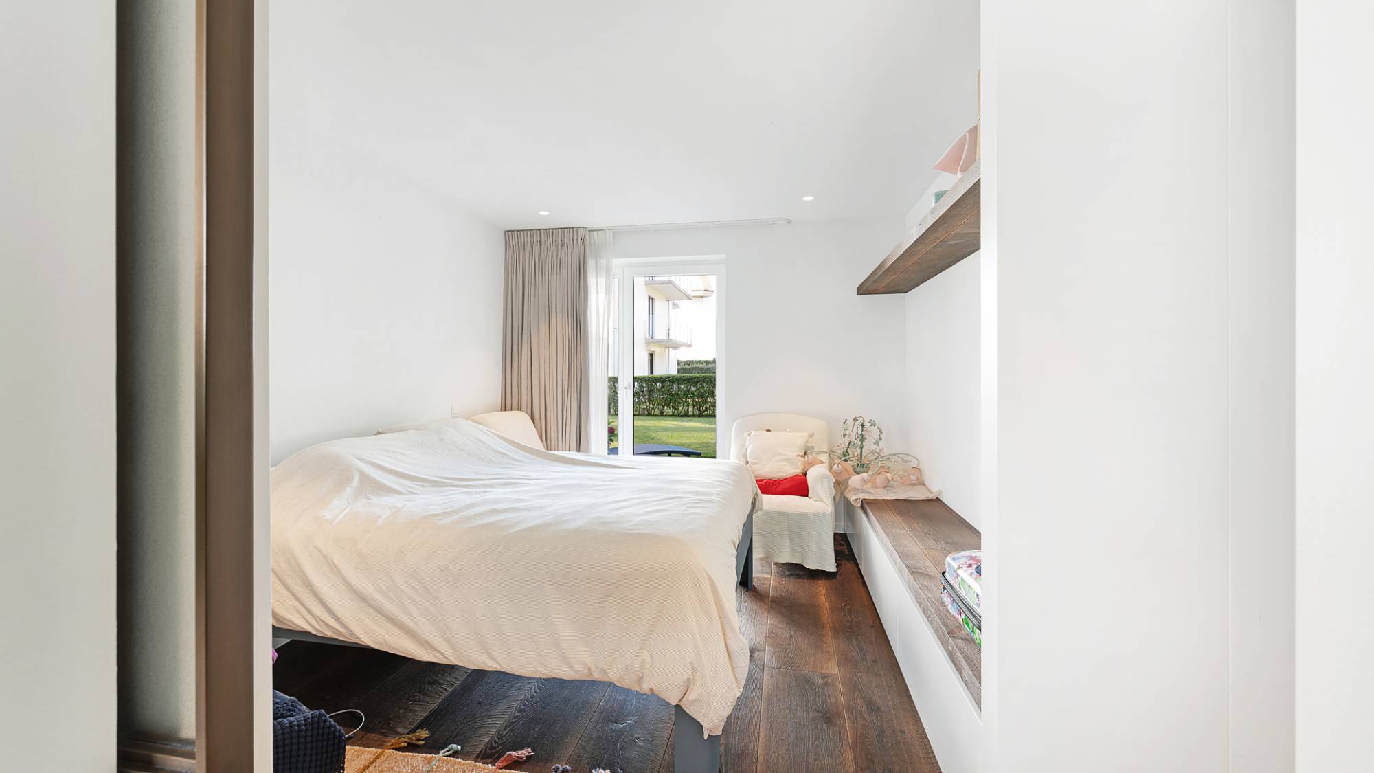 Le séjour spacieux et lumineux, agrémenté d’un foyer électrique décoratif, s’ouvre sur un agréable espace salle à manger et une terrasse donnant sur le jardin ensoleillé. La cuisine ouverte, équipée d’appareils Gaggenau, allie esthétique et fonctionnalité. L’appartement comprend une suite parentale avec dressing, une seconde chambre aménagée avec mobilier sur mesure, ainsi qu’une salle de bains raffinée avec baignoire, double vasque et douche à l’italienne (Dominique Desimpel).