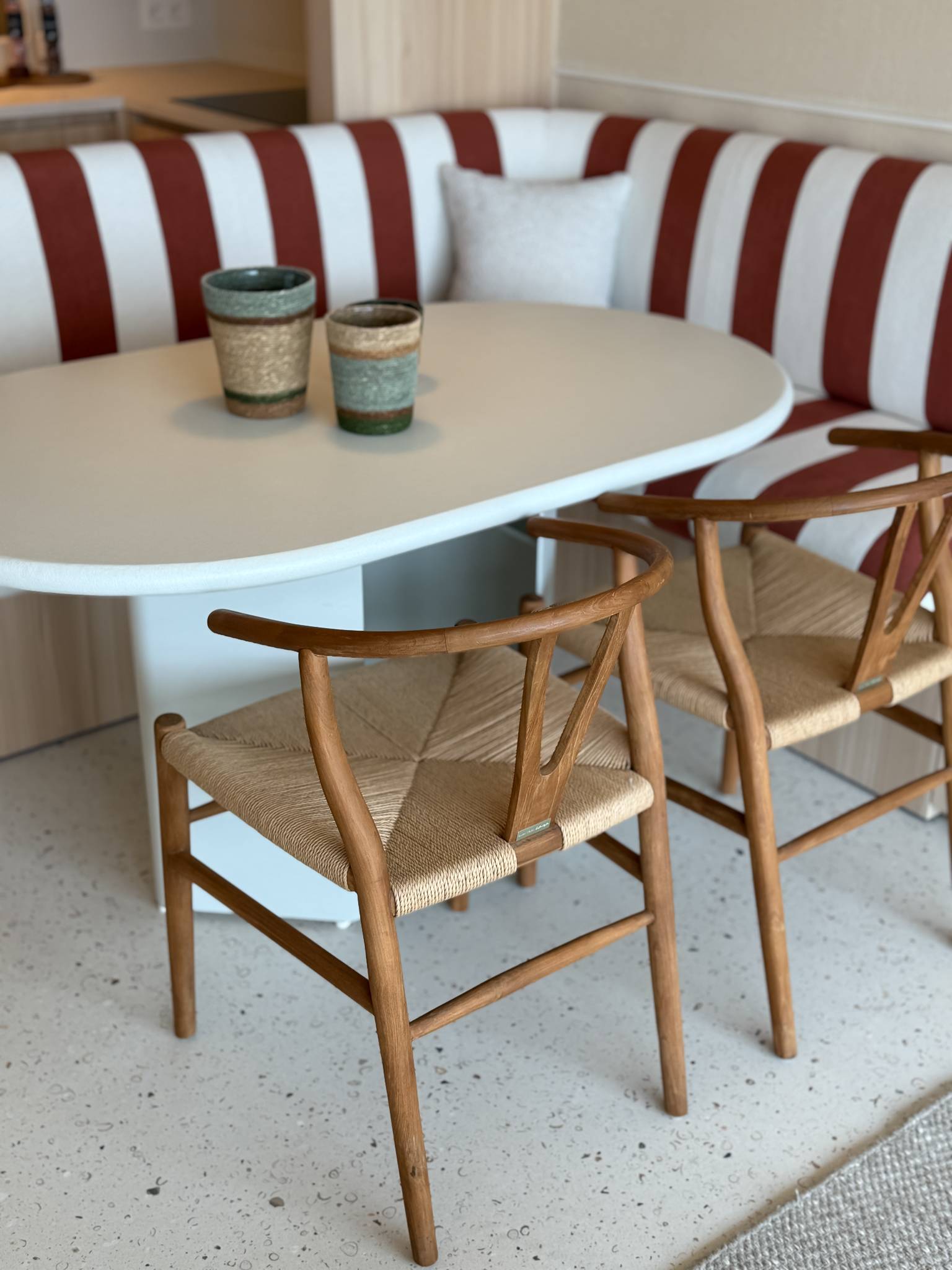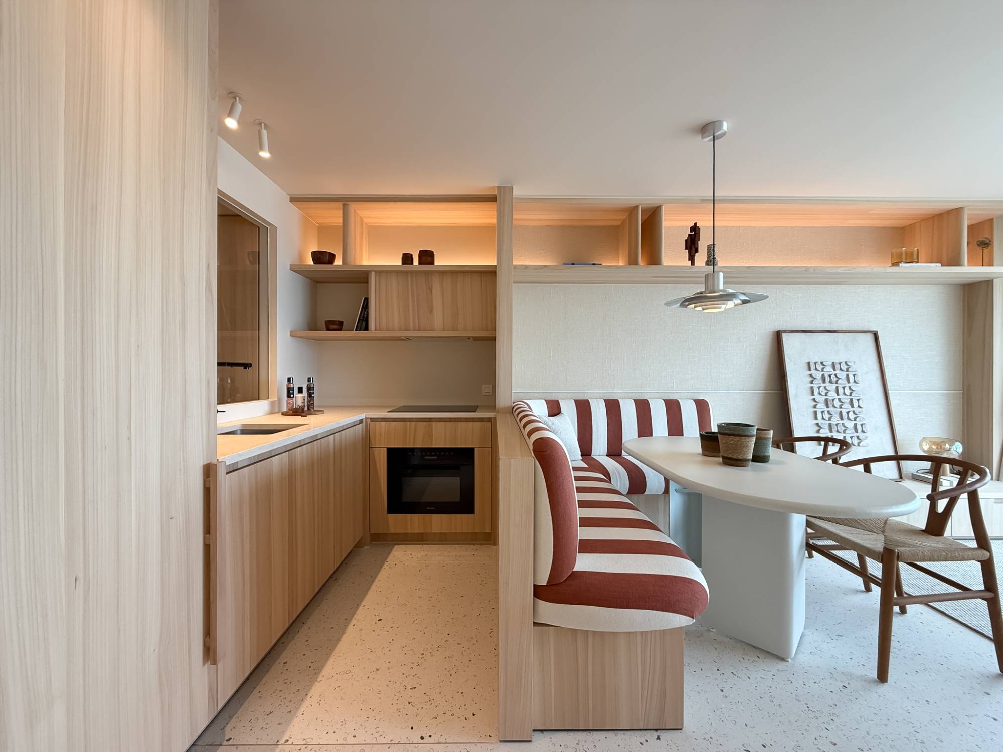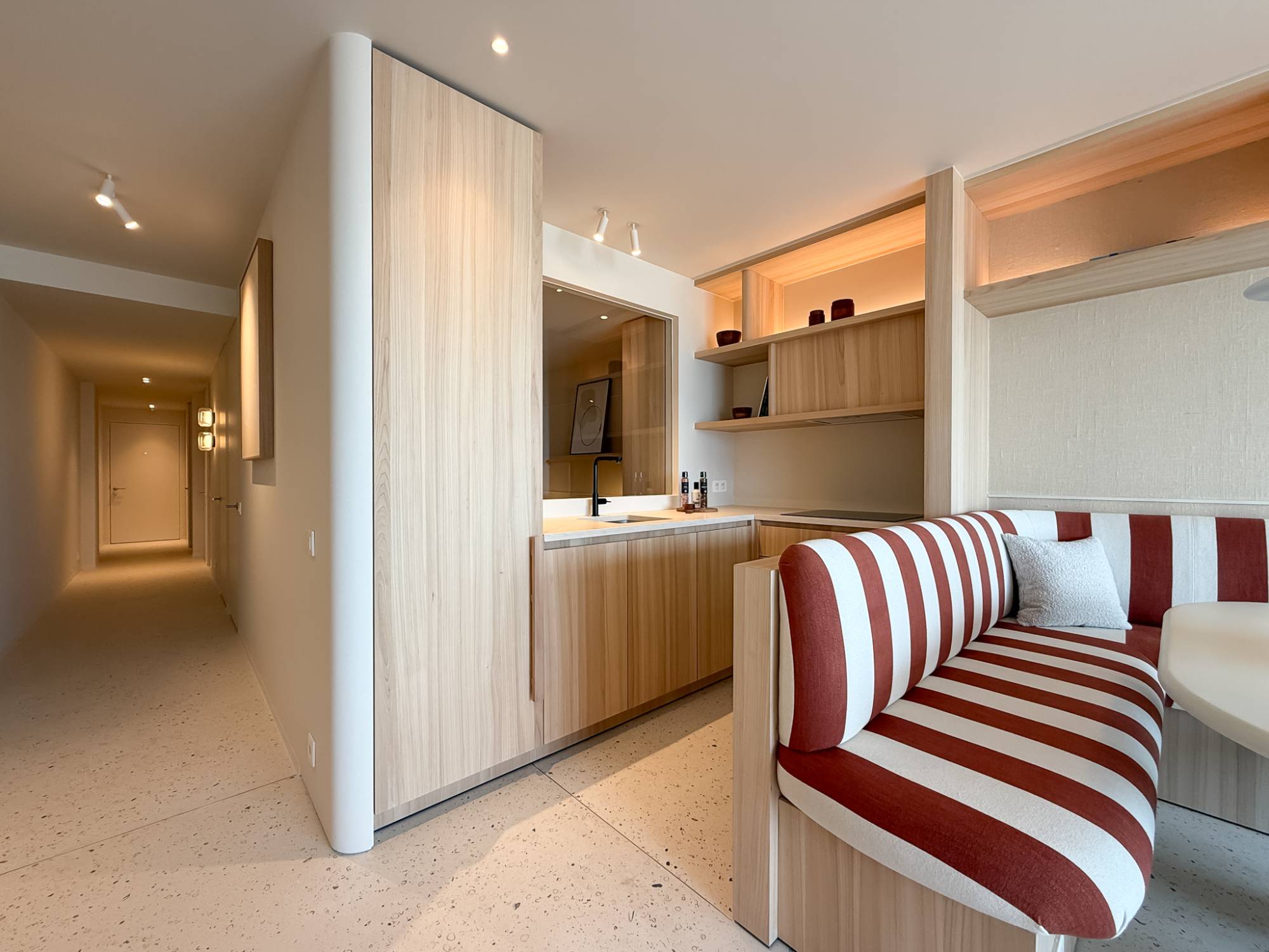 La cuisine ouverte, entièrement équipée et réalisée avec des matériaux haut de gamme, s’intègre parfaitement à l’espace de vie, créant une ambiance moderne et élégante.