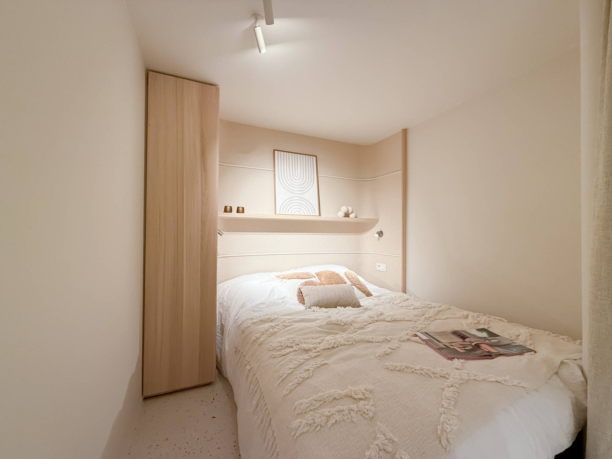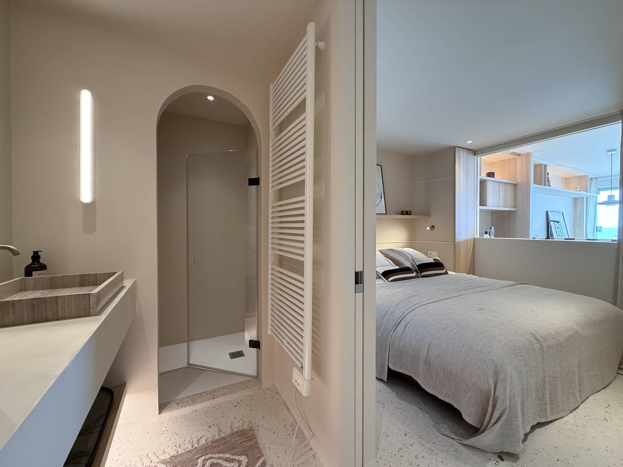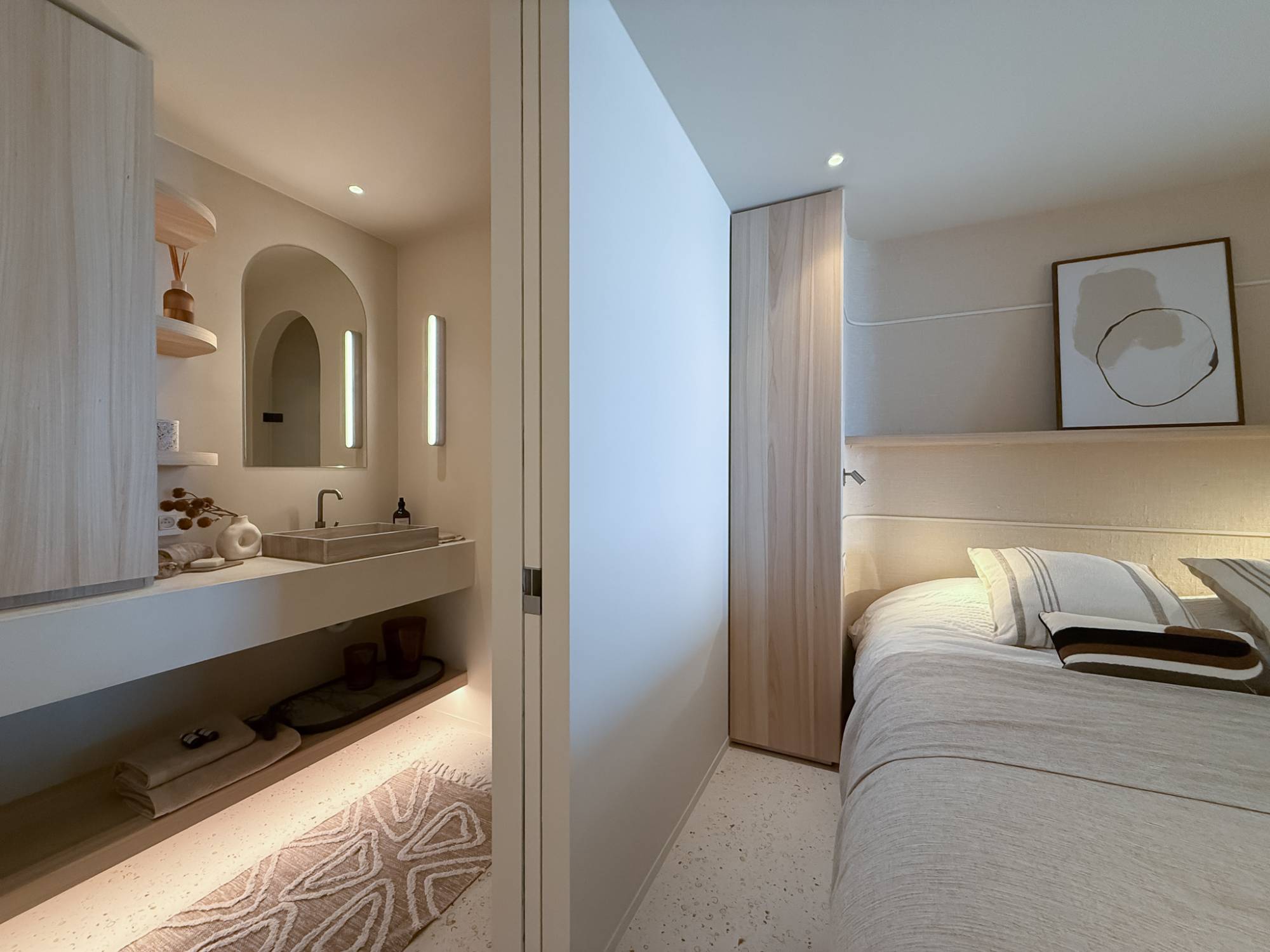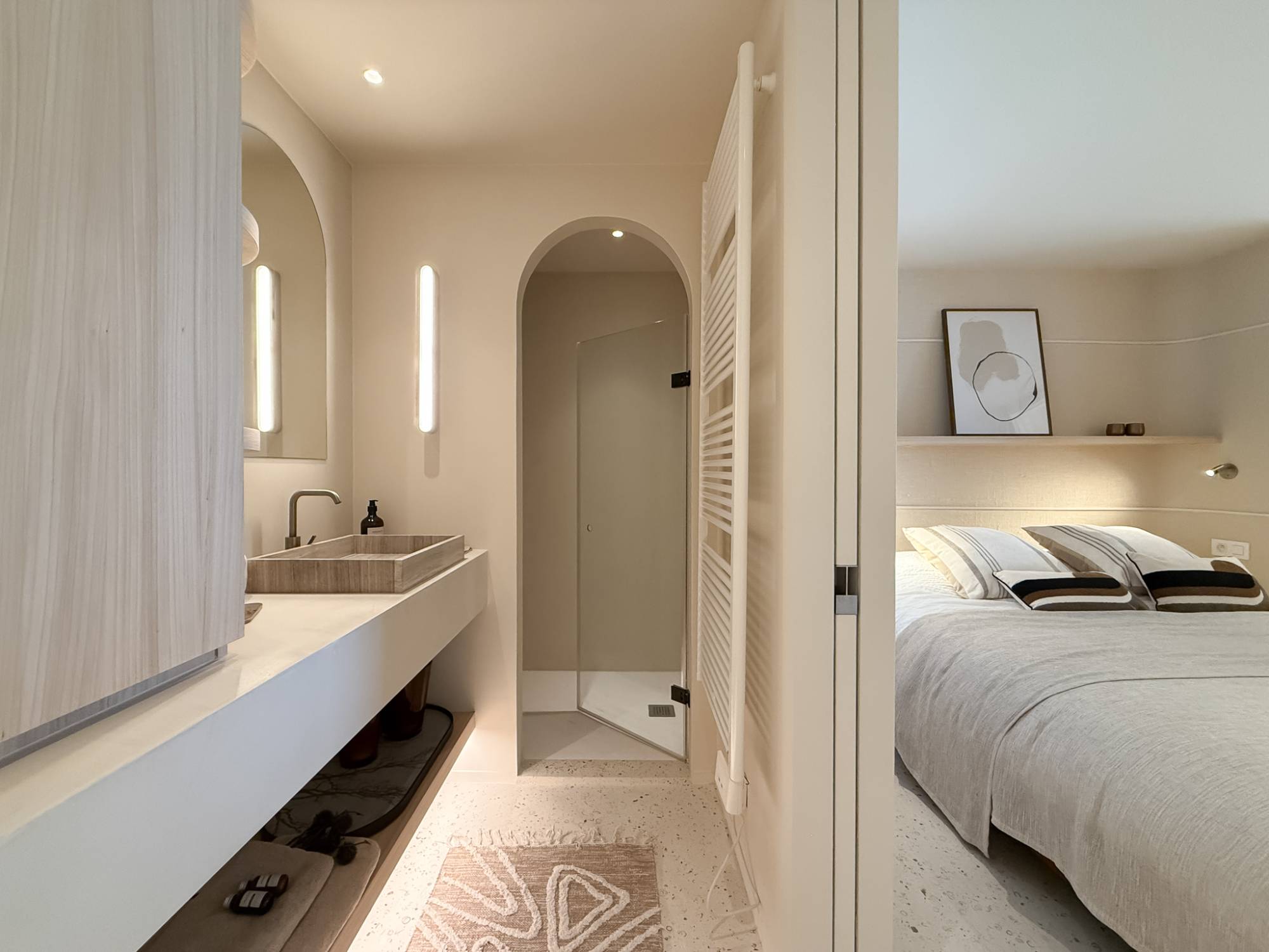 La suite parentale respire le calme, offre une vue sur la mer et dispose d’une salle de bains attenante avec mobilier sur mesure, tandis que la deuxième chambre bénéficie également de pratiques placards intégrés.