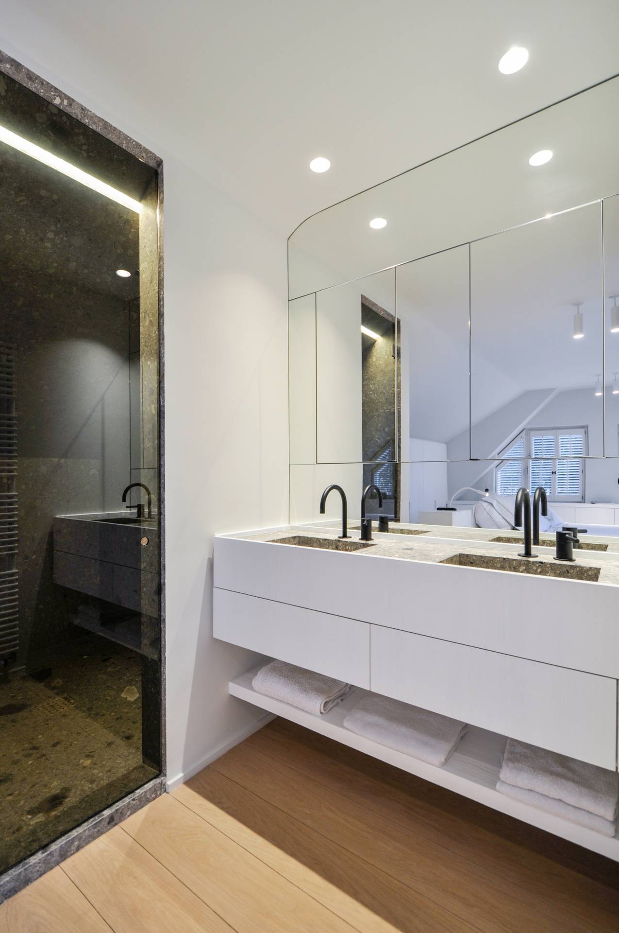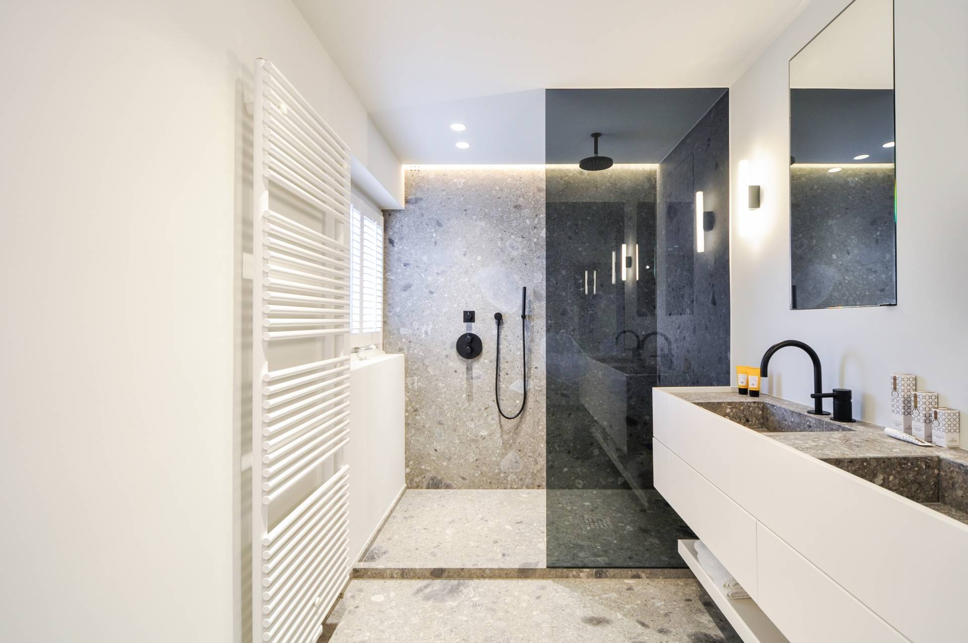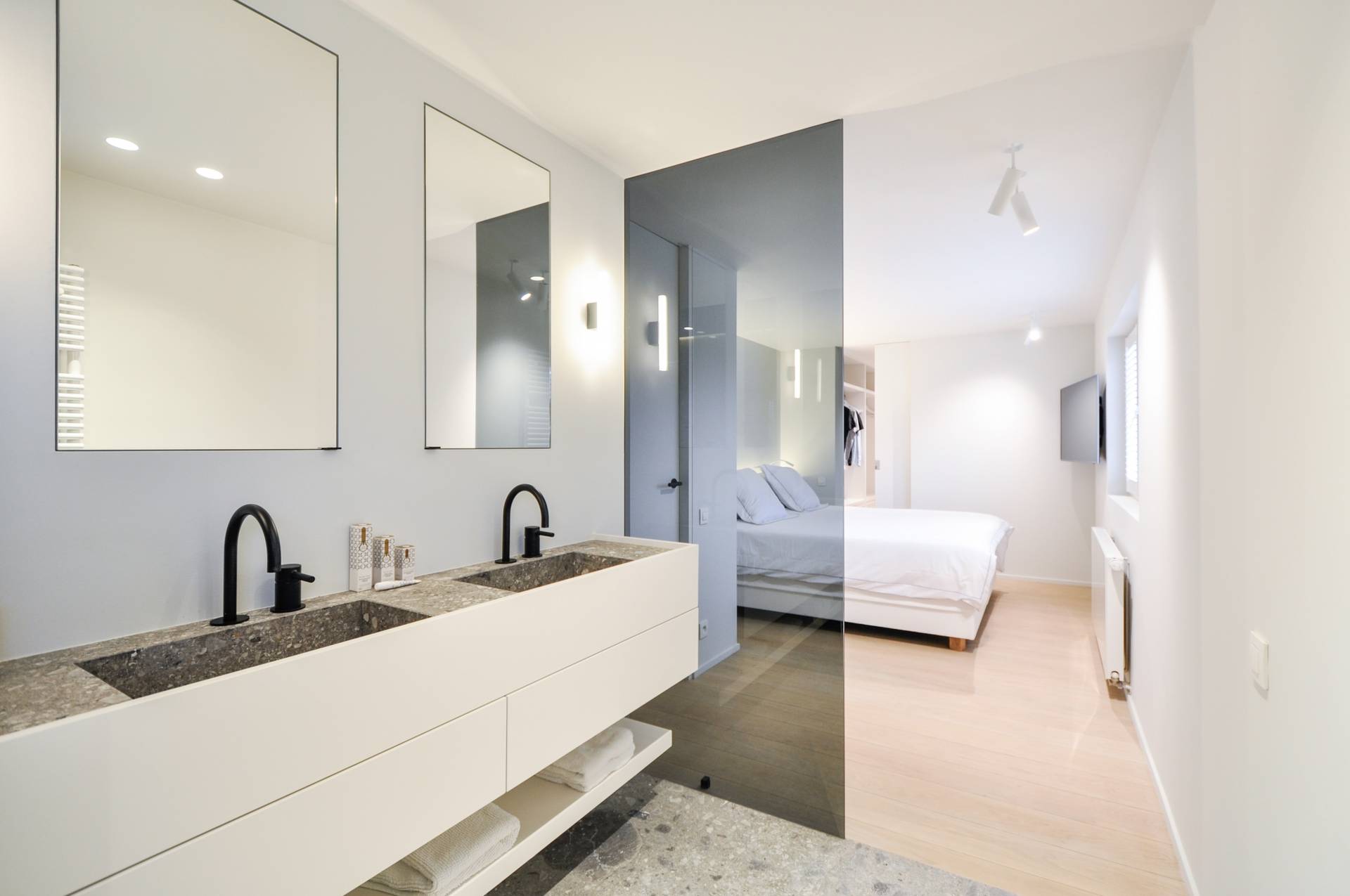 Il y a une belle chambre au même niveau que le salon. Dressing séparé. Salle de douche luxueusement aménagée avec douche à l'italienne spacieuse, double lavabo.