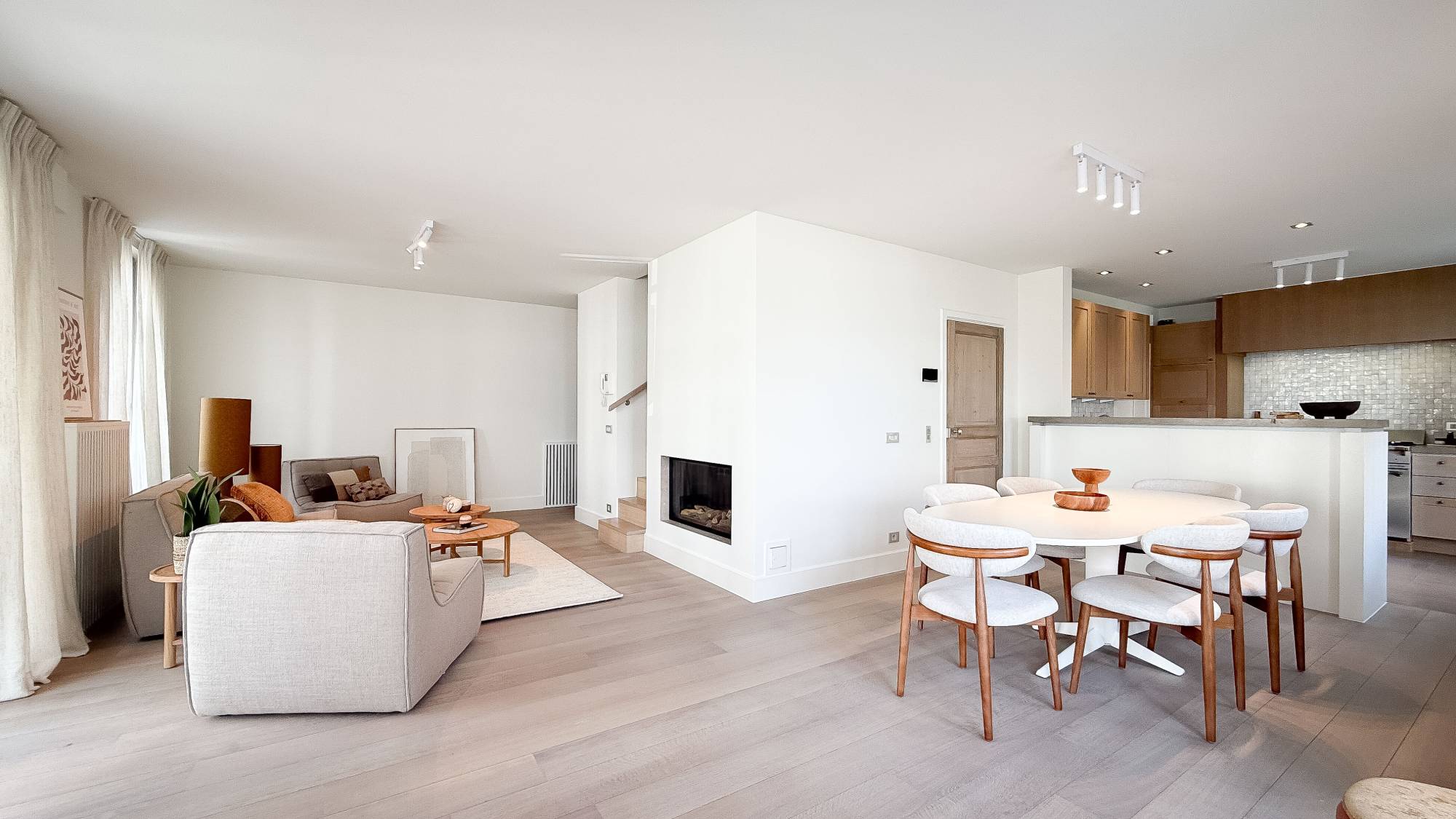 Le hall d’entrée avec vestiaire et toilette invités mène vers un lumineux séjour avec feu ouvert et coin café, donnant accès à une spacieuse terrasse avec vue mer panoramique. La salle à manger s’intègre harmonieusement à la cuisine ouverte moderne, réalisée avec des matériaux de qualité et équipée de tout le confort contemporain.