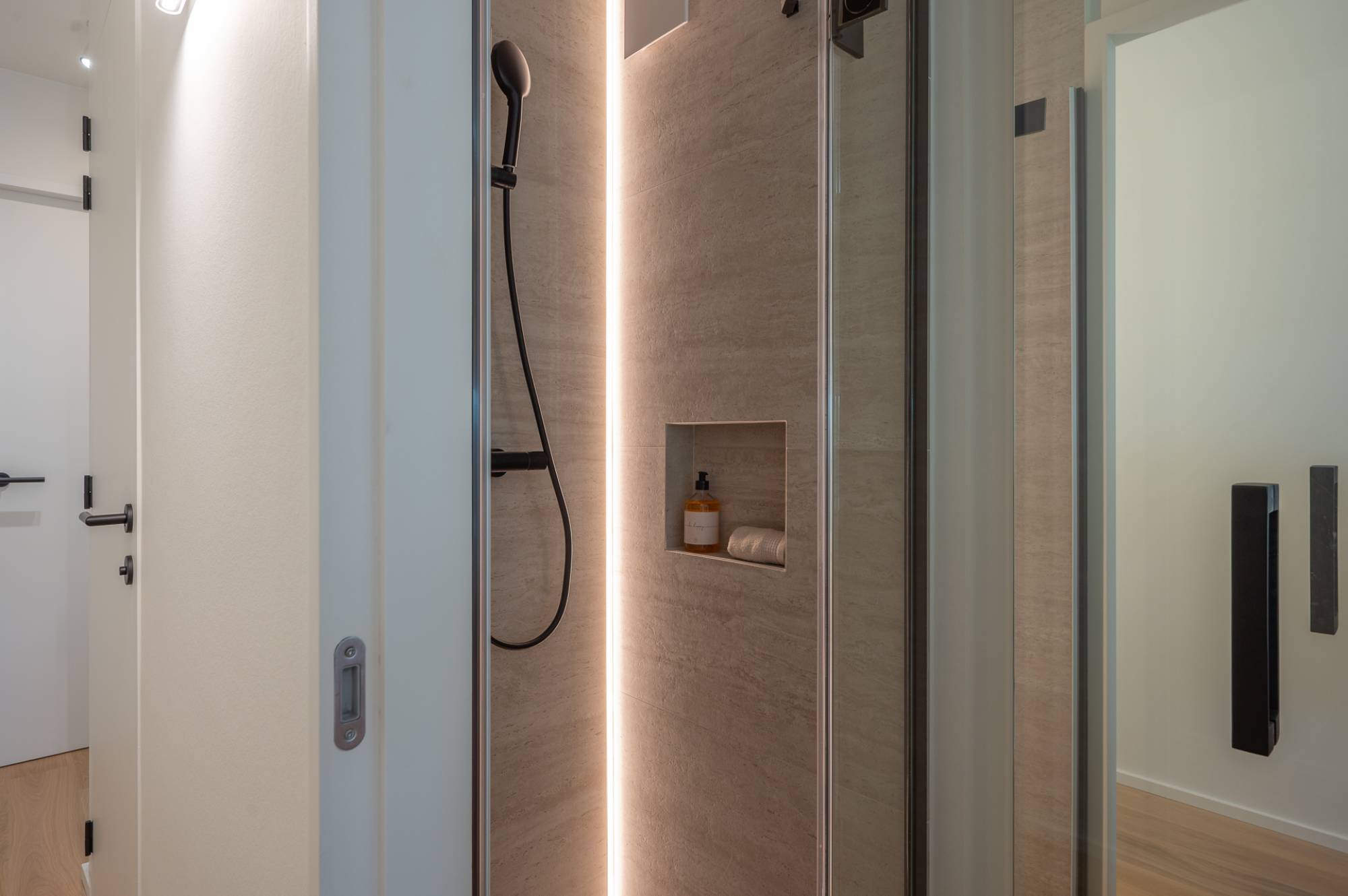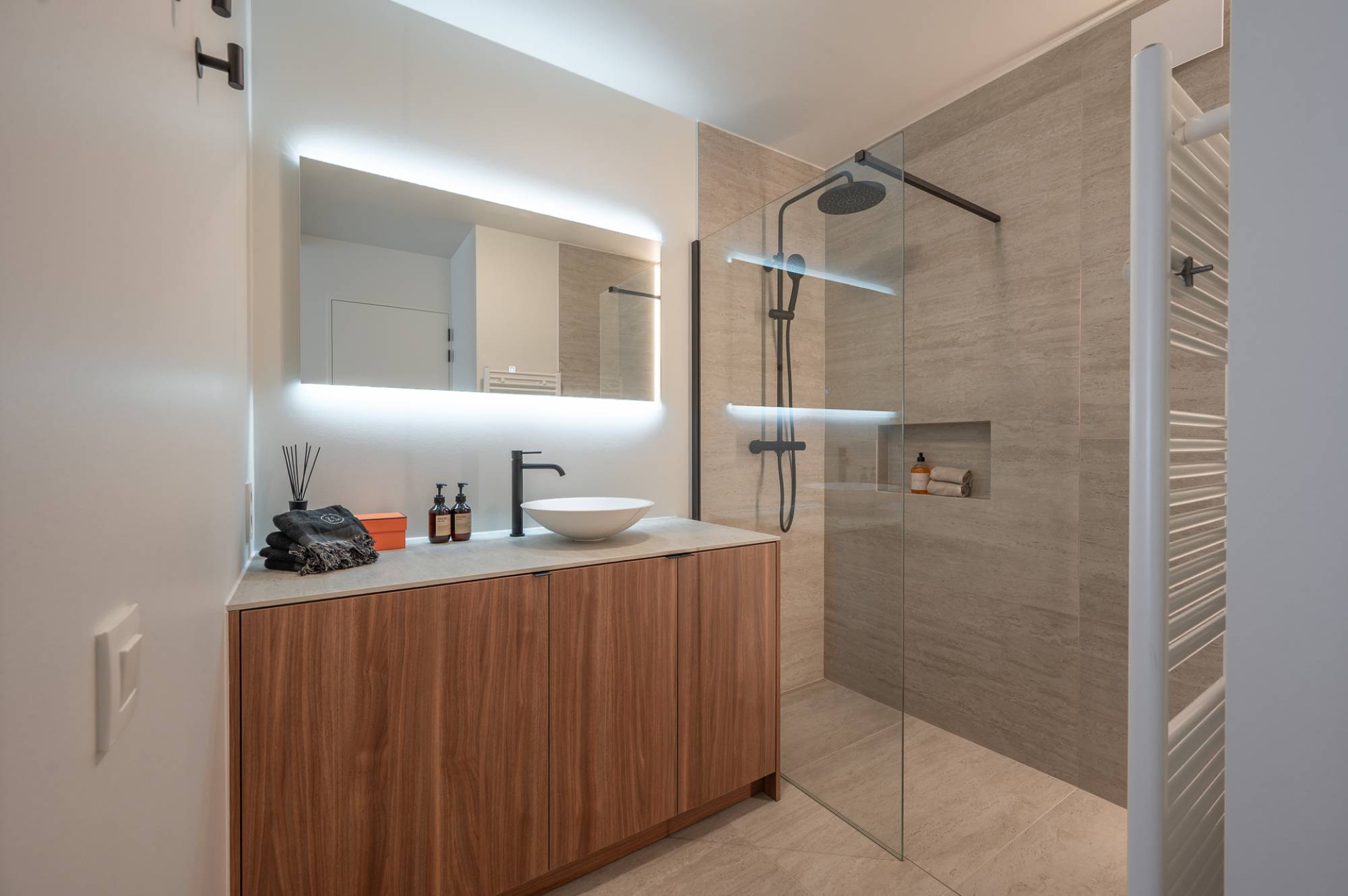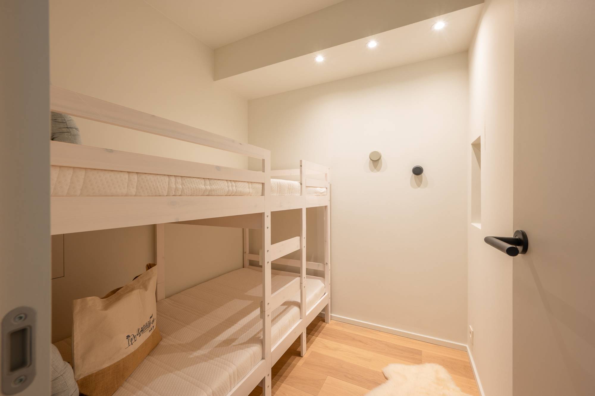 Le hall d’entrée dispose de toilettes invités et d’un vestiaire. À l’arrière, on trouve 2 chambres spacieuses avec armoires encastrées, ainsi que 2 salles de douche modernes. Une troisième chambre plus compacte peut accueillir un lit superposé ou être aménagée en bureau ou pièce polyvalente.
