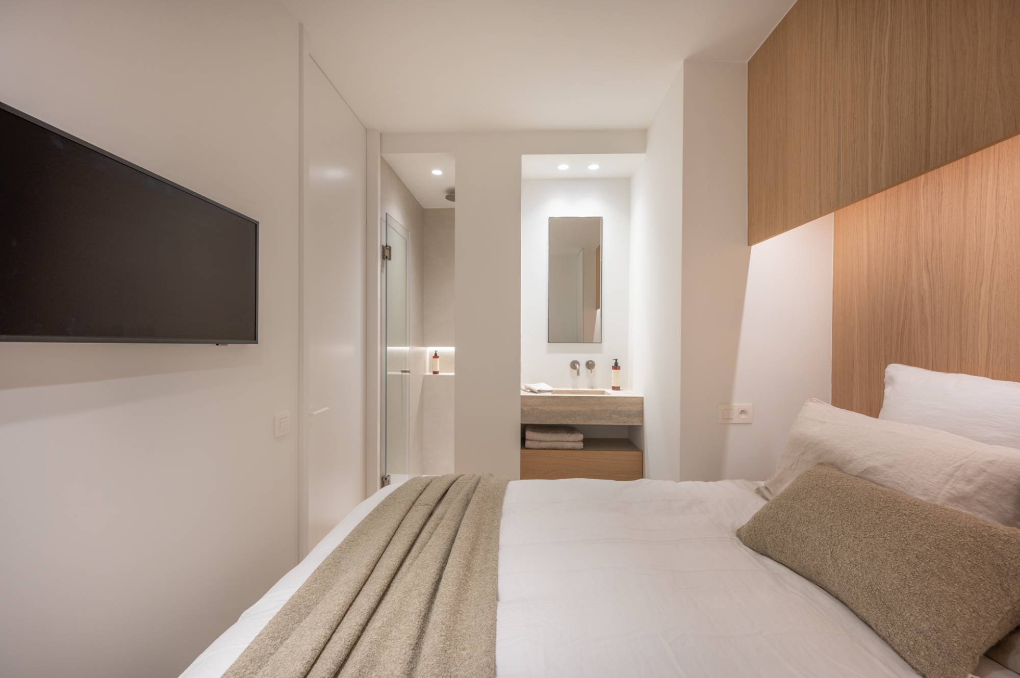 L’appartement dispose de trois chambres à coucher spacieuses, chacune pouvant accueillir un lit double. Deux chambres sont situées à l’arrière et donnent accès à une terrasse. Chaque chambre bénéficie de placards intégrés et de sa propre salle de douche.
