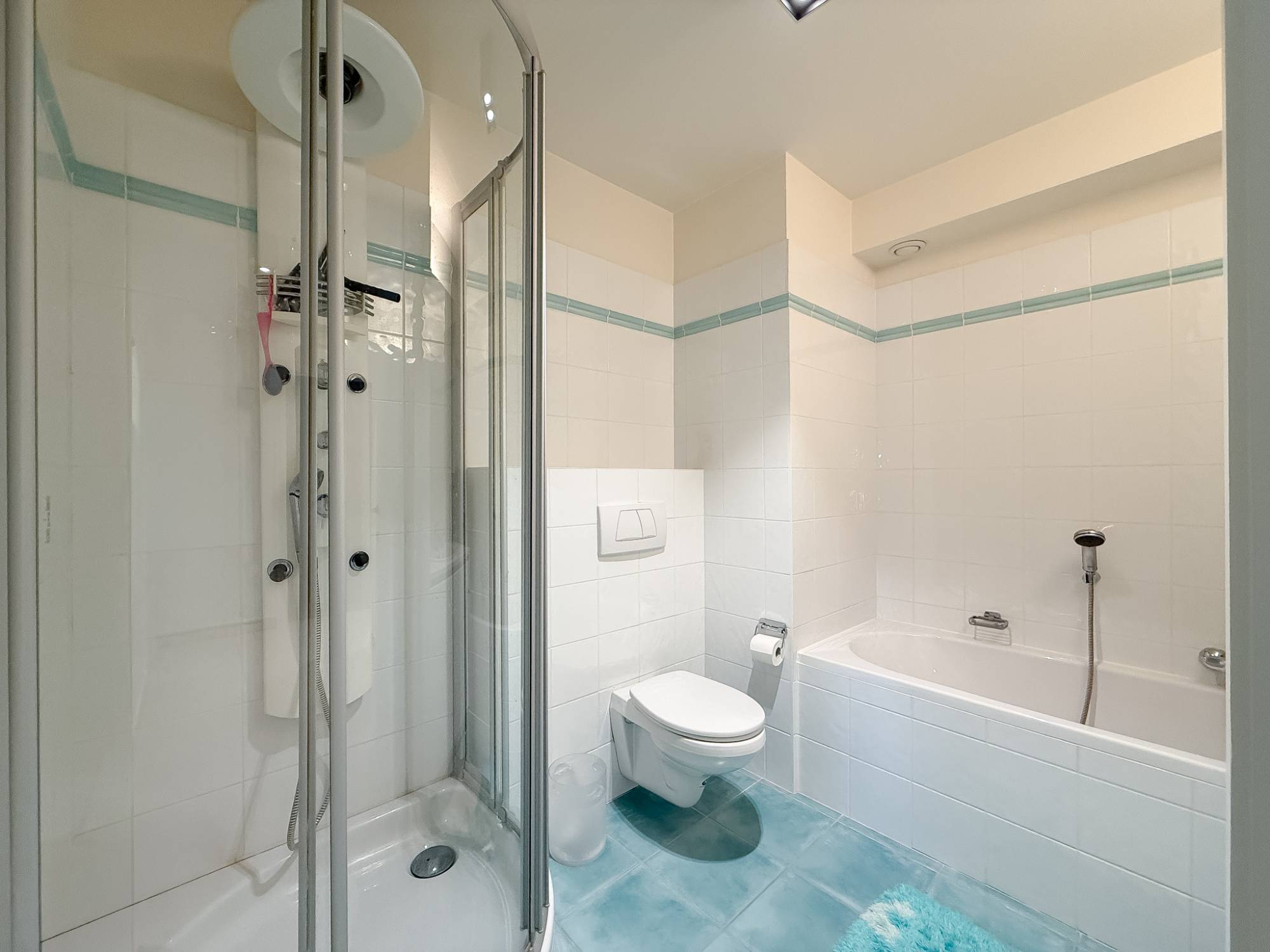 La chambre principale dispose de sa salle de bains privative. Une seconde salle de bains, accessible depuis le hall de nuit, est équipée d’une baignoire, d’une douche, d’un lavabo et de toilettes.
