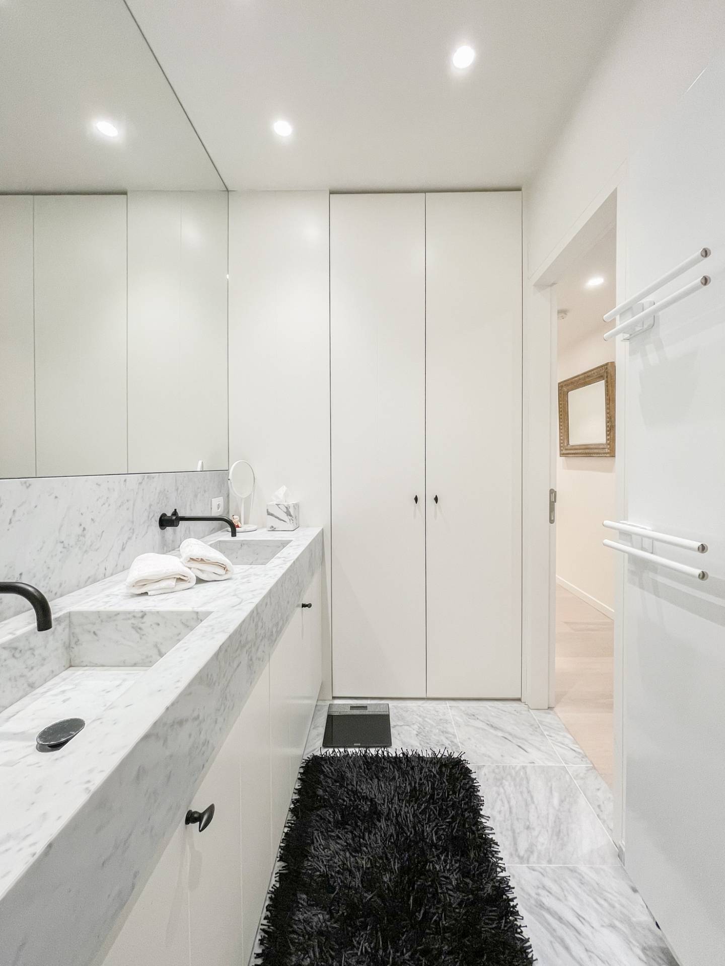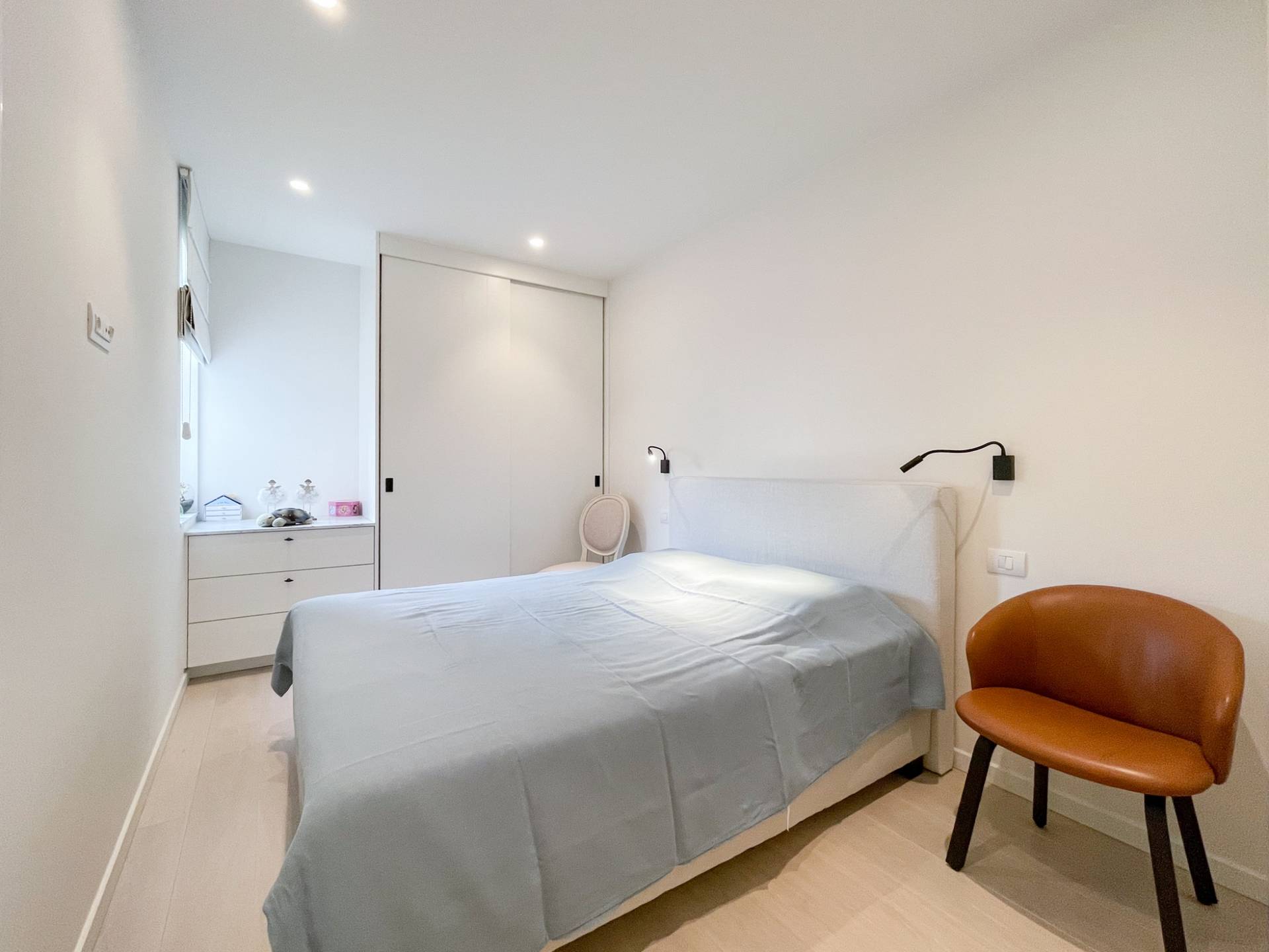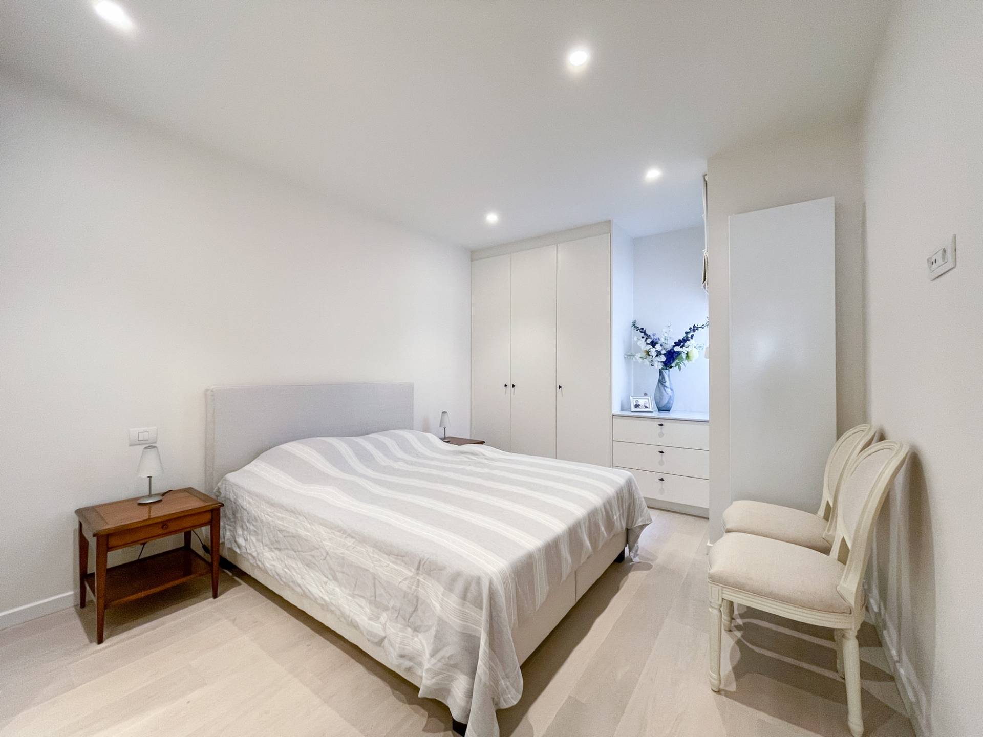 Dans la zone nuit, il y a 3 chambres complètes, toutes équipées de nombreux placards intégrés et de la lumière naturelle. La chambre principale dispose d'une salle de bains luxueusement meublée en pierre naturelle de Carrare, avec baignoire jacuzzi, double vasque et placards de rangement. Les chambres 2 et 3 disposent d'une salle d'eau spacieuse avec une douche spacieuse en mosaïque et double vasque. Toilettes séparées.