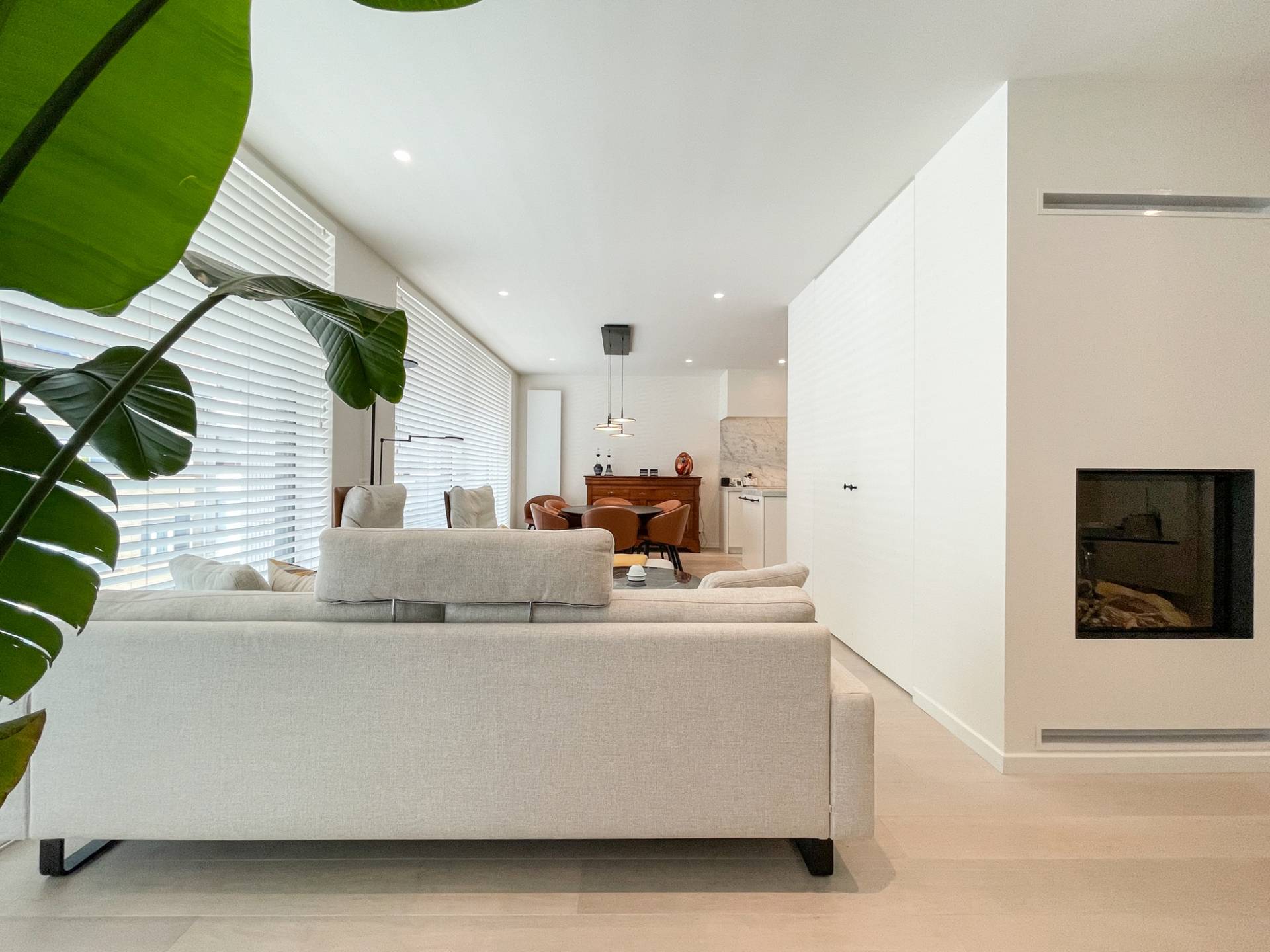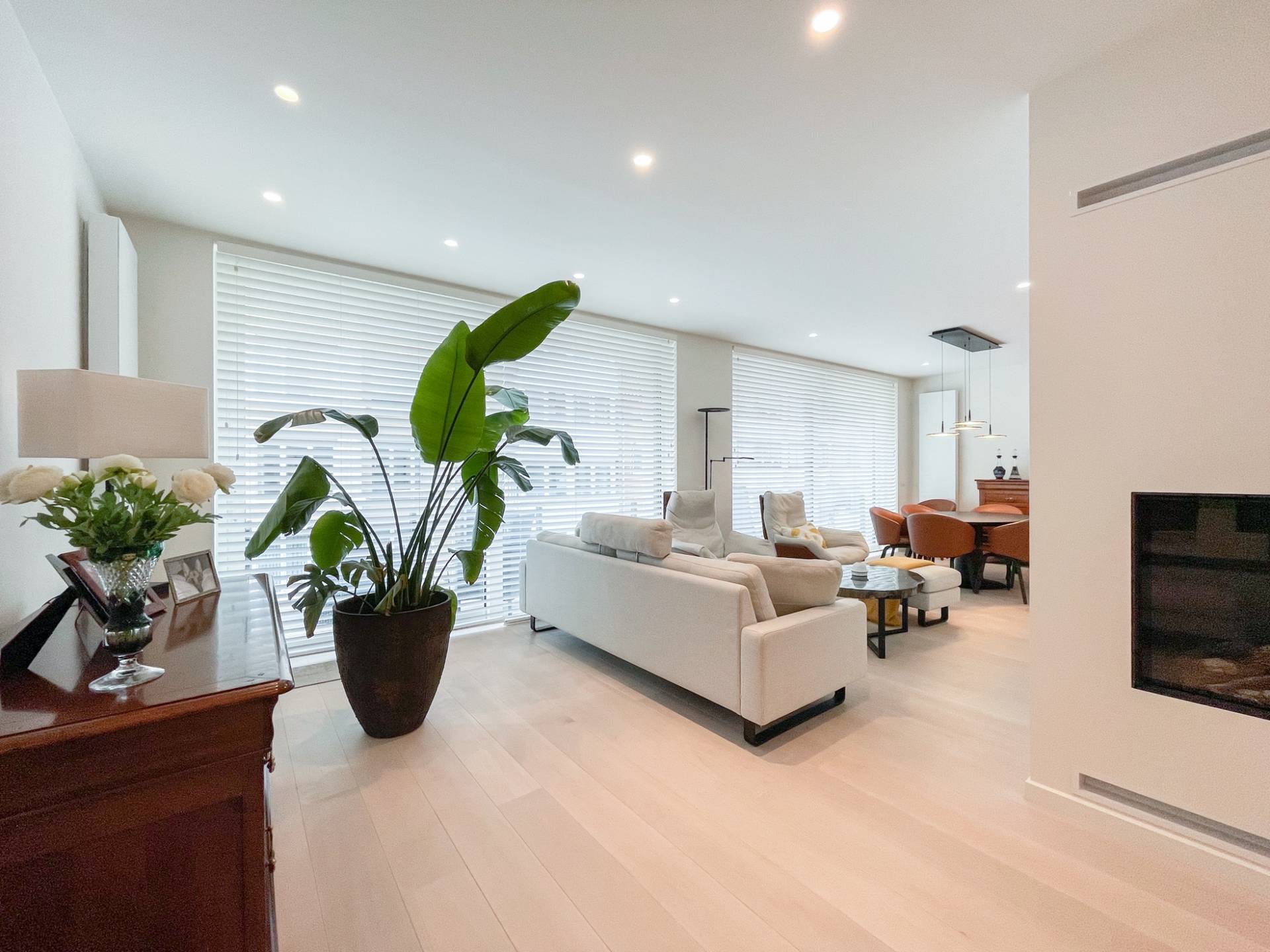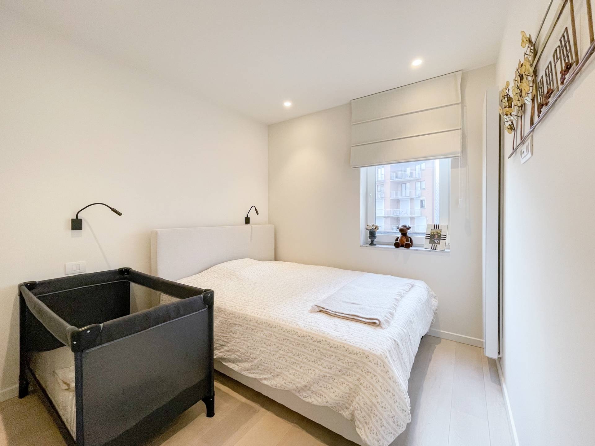 Composition: Hall d'entrée spacieux avec vestiaire, armoire à chaussures et toilettes invités. Salon lumineux avec coin télé intégré et feu ouvert au gaz. Belle et spacieuse cuisine ouverte en marbre de Carrare, équipée de tout le confort moderne (électroménager Miele). Grand débarras séparé avec machine à laver et sèche-linge. Il y a un espace bureau avec placards intégrés. Terrasse ensoleillée sur toute la largeur de l'appartement, avec vue sur l'Avenue Dumortier, et vue sur la Place du Phare.