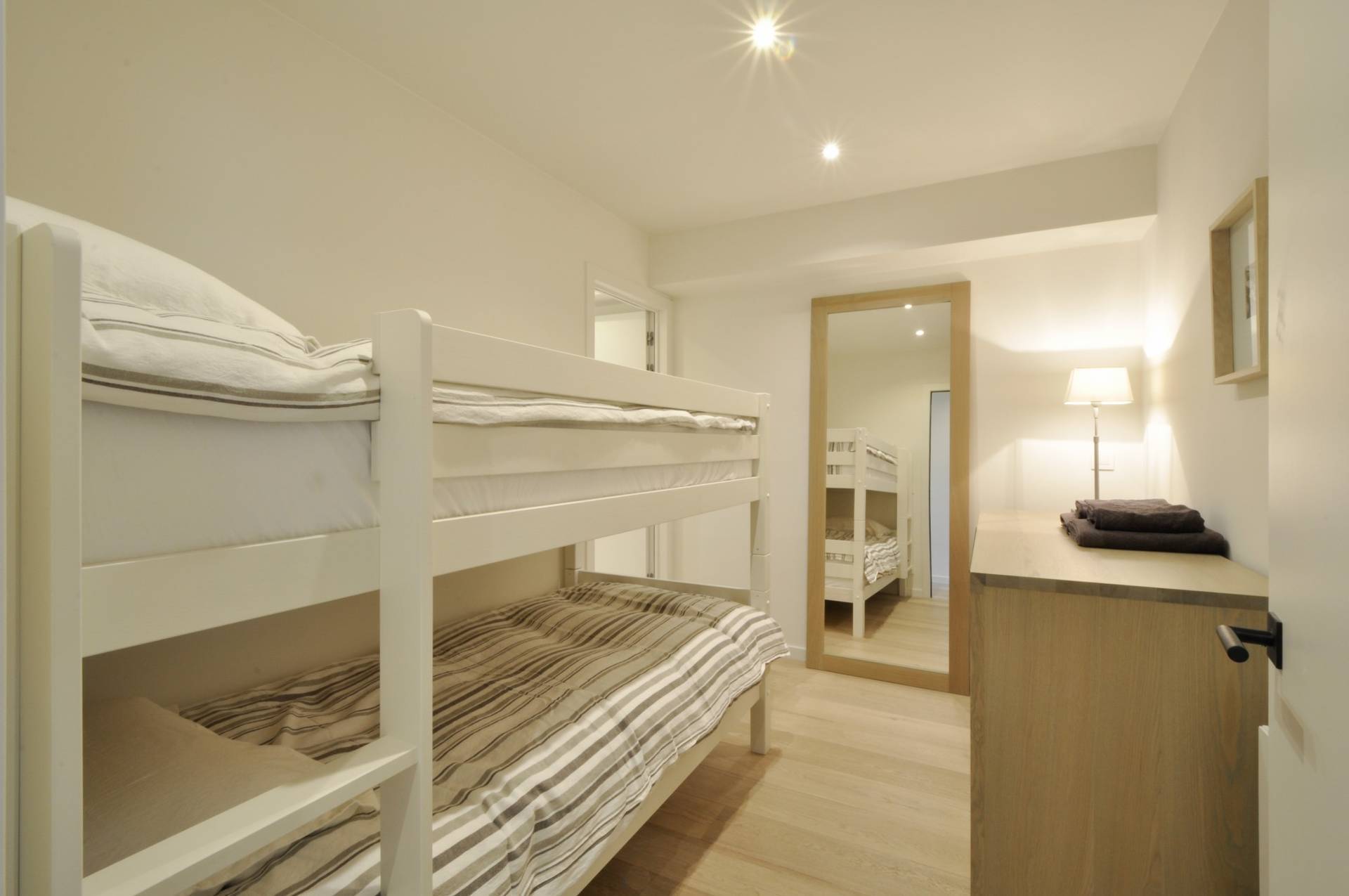 Il y a 3 chambres à coucher. 2 Chambres disposent d'armoires encastrées et donnent sur une terrasse à l'arrière. La 3eme chambre est une chambre avec des lits superposés (ou éventuellement un petit lit double). 1 Salle de bains luxueusement aménagée avec baignoire/douche, toilette et meuble lavabo. 1 Salle de douche avec douche et lavabo.
