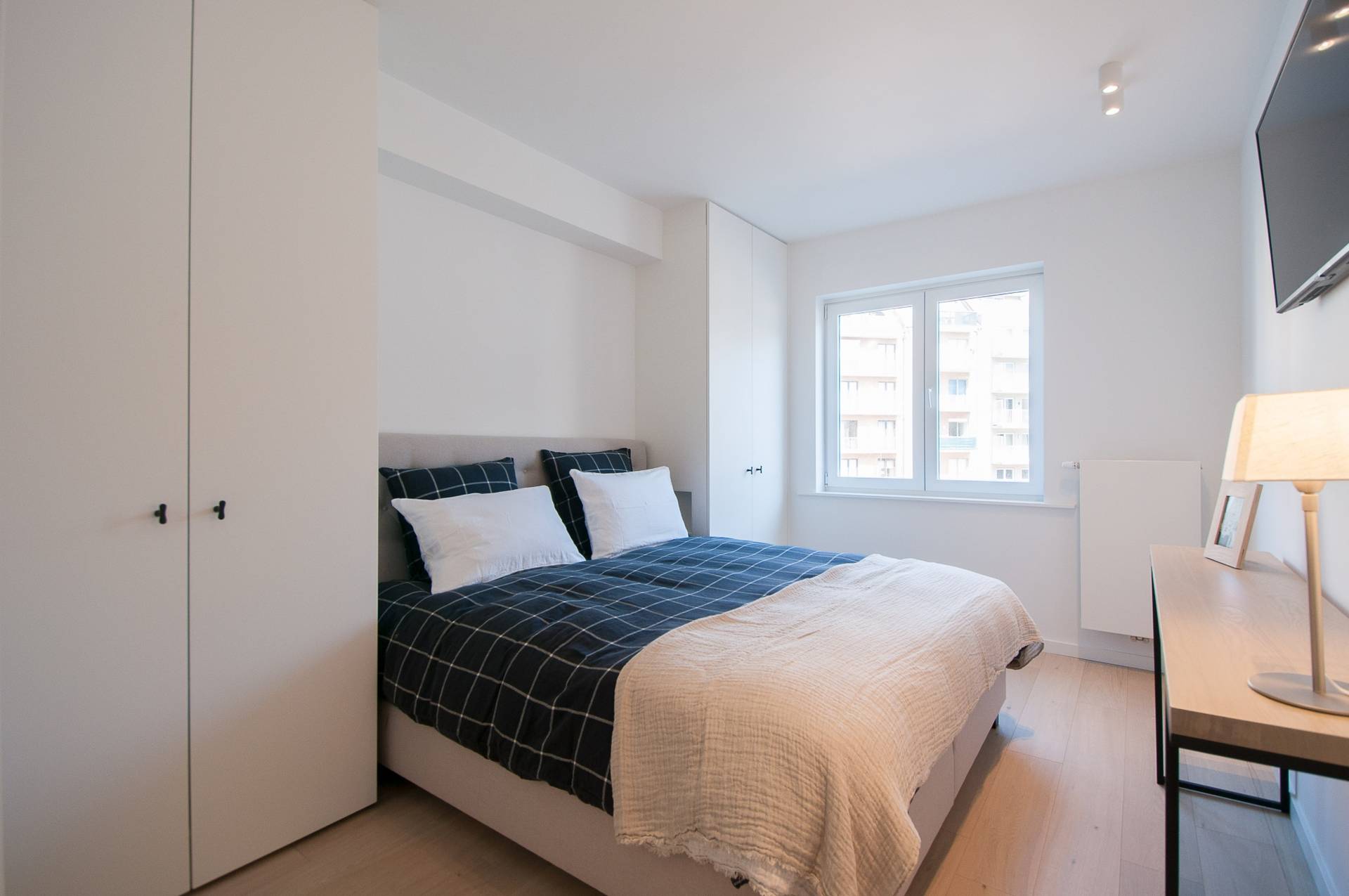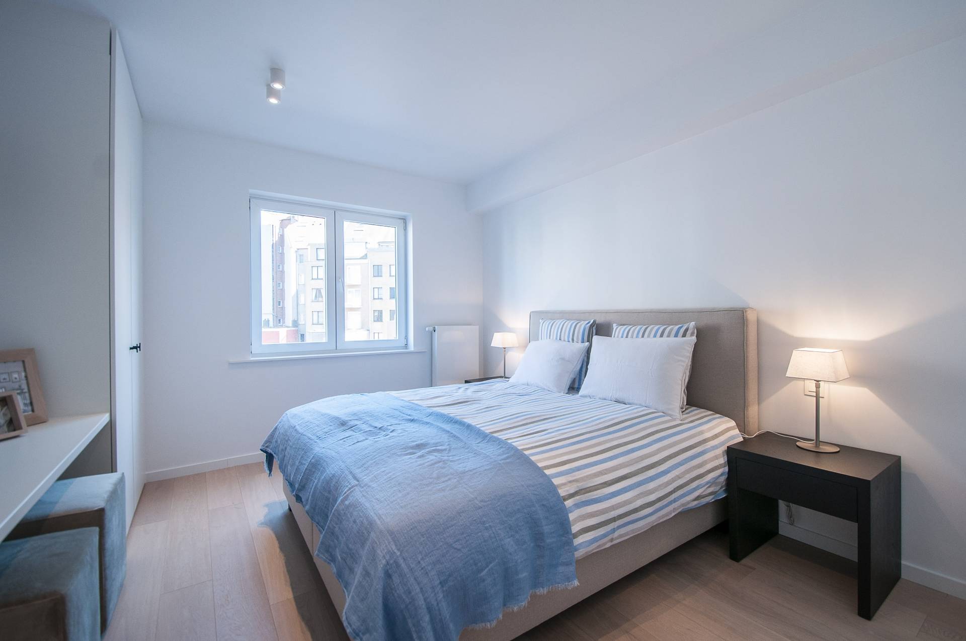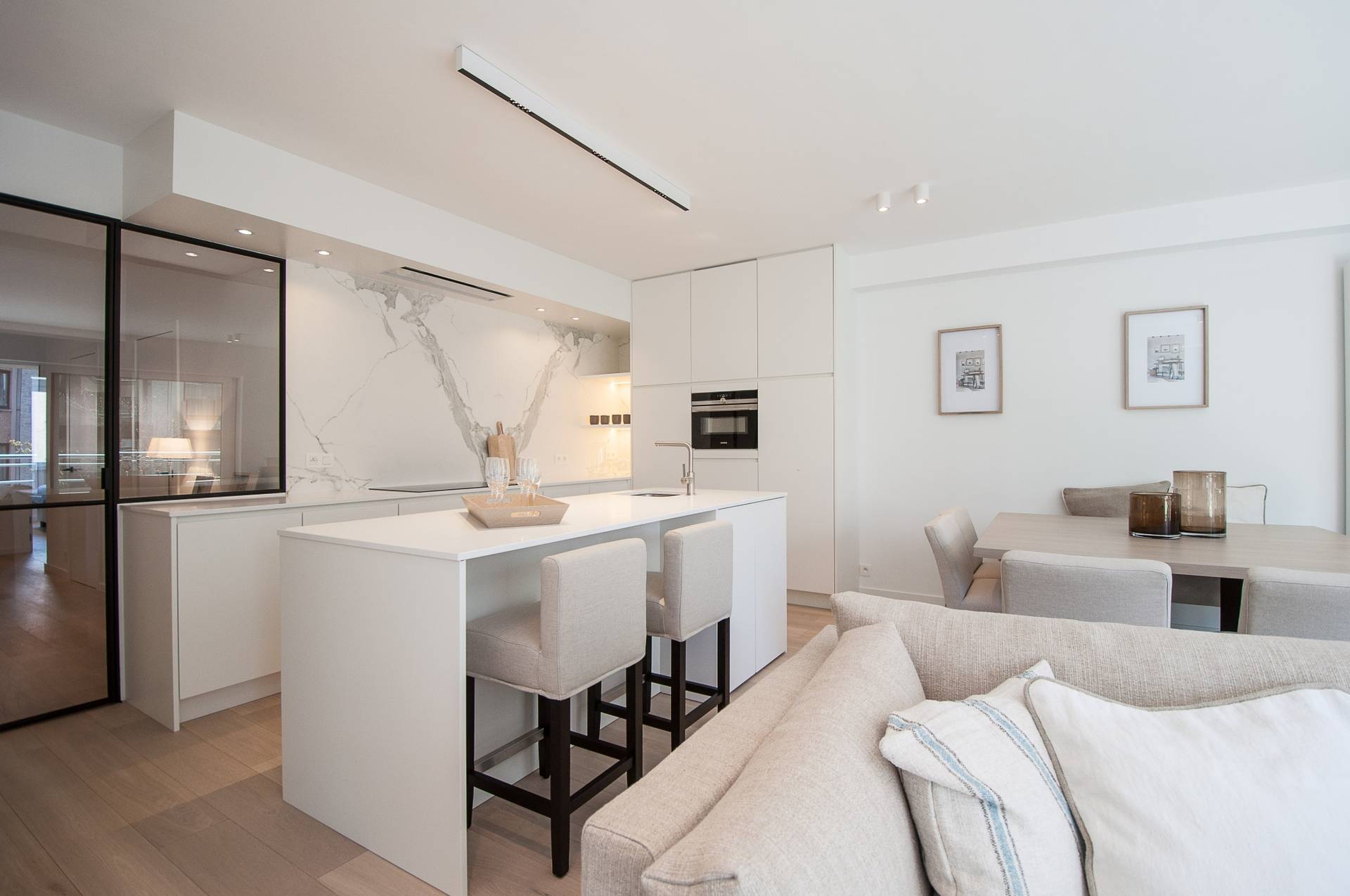Composition: Hall d'entrée avec toilette invités et vestiaire. Séjour ensoleillé, avec une belle largeur de façade de 6,6 m, et avec de grandes baies vitrées coulissantes, ouvrant sur une terrasse sur toute la largeur de l'appartement. Belle vue dégagée sur l'Avenue Lippens. Coin repas. Cuisine ouverte, équipée d'un bel îlot de cuisine et coin petit déjeuner. Débarras séparé avec lave-linge et sèche-linge.