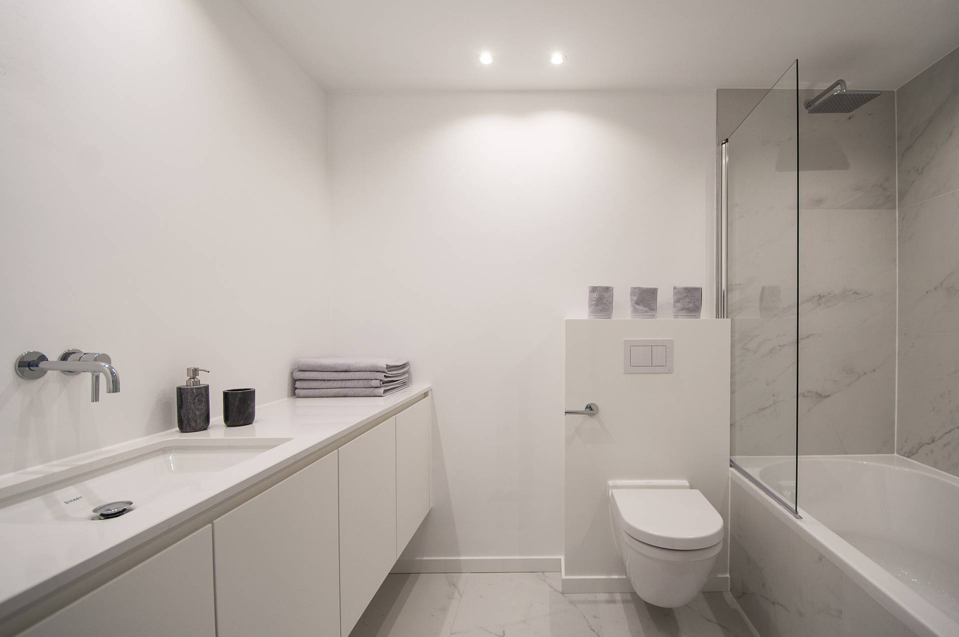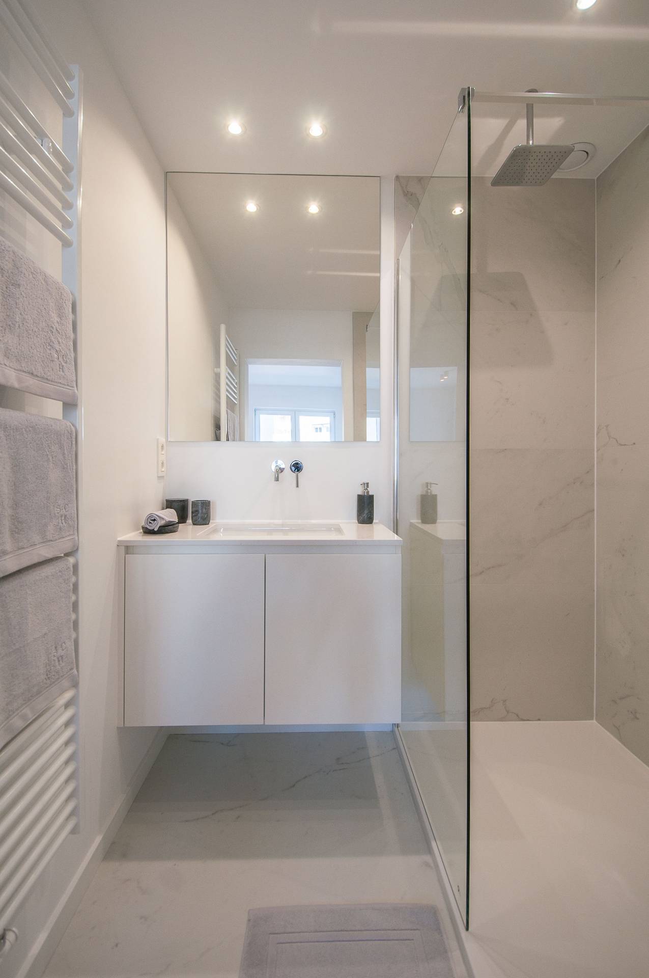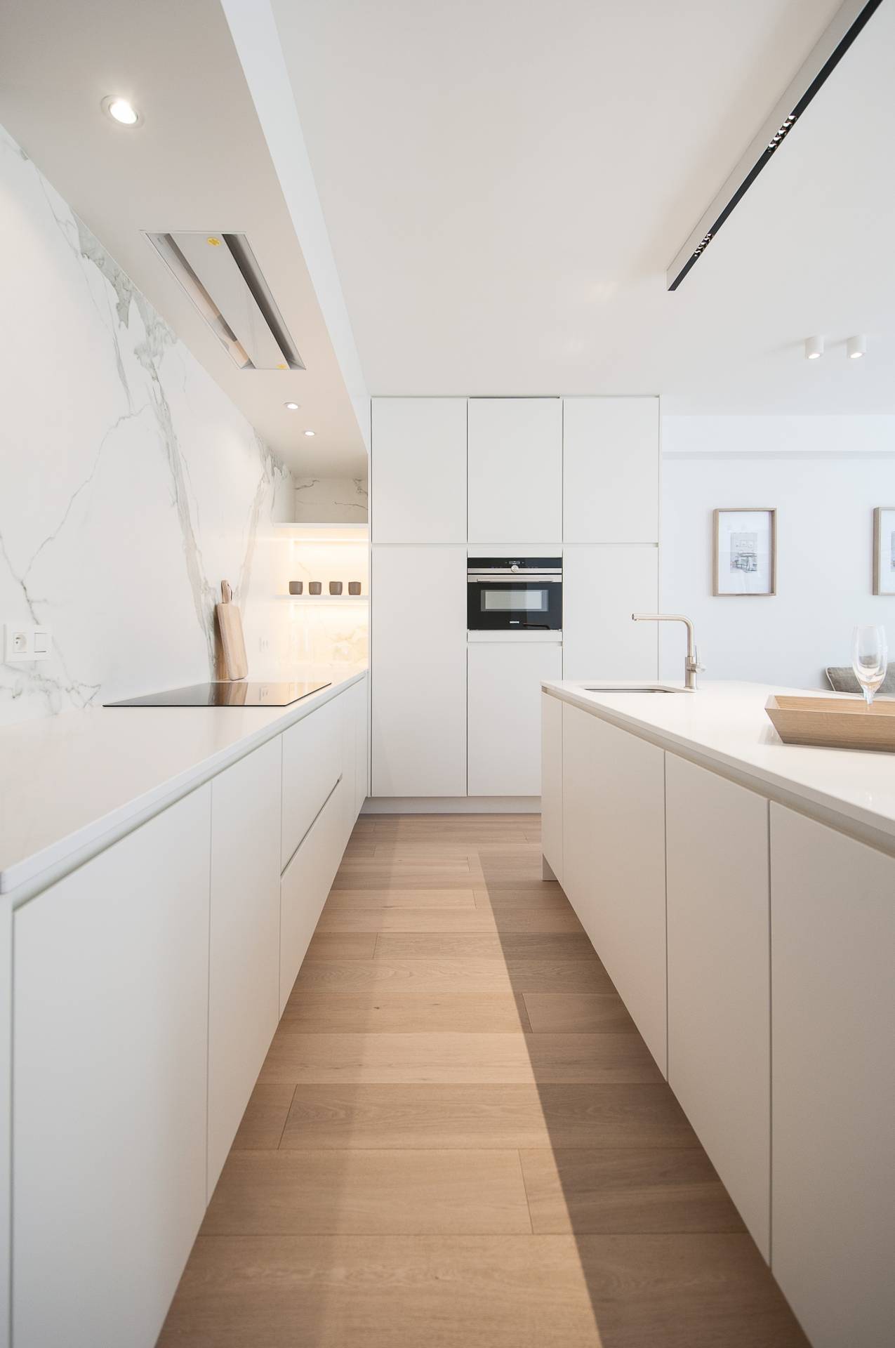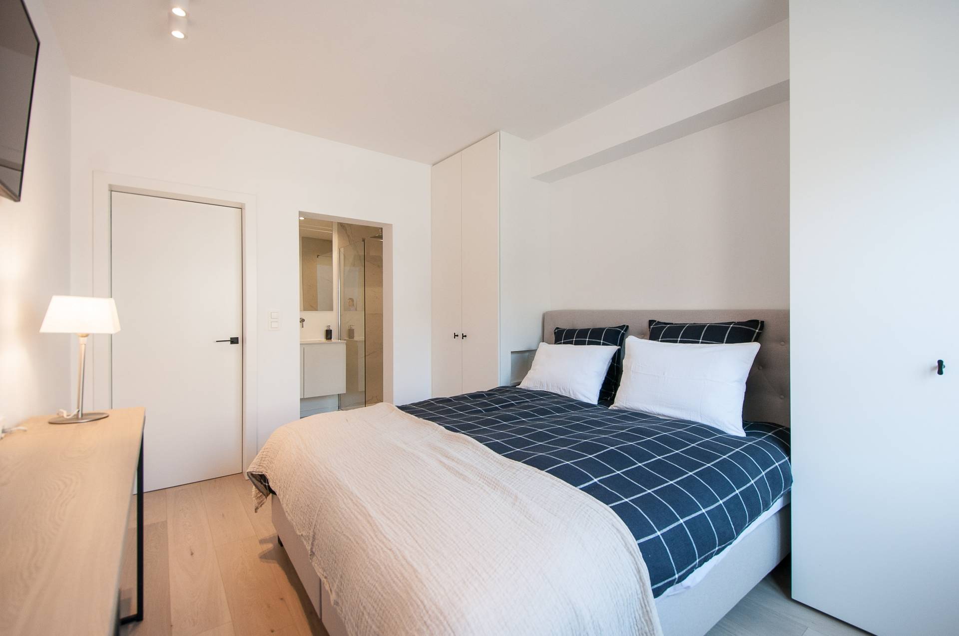 Composition: Hall d'entrée avec toilette invités et vestiaire. Séjour ensoleillé, avec une belle largeur de façade de 6,6 m, et avec de grandes baies vitrées coulissantes, ouvrant sur une terrasse sur toute la largeur de l'appartement. Belle vue dégagée sur l'Avenue Lippens. Coin repas. Cuisine ouverte, équipée d'un bel îlot de cuisine et coin petit déjeuner. Débarras séparé avec lave-linge et sèche-linge.