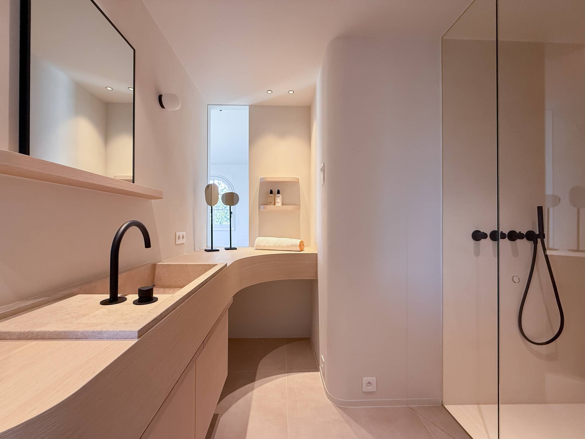 Disposition: hall d'entrée spacieux avec vestiaire et toilettes pour les invités. Le lumineux salon offre un accès direct à une grande terrasse orientée à l'ouest, avec une vue panoramique sur le domaine. La cuisine est entièrement équipée avec des appareils Miele de haute qualité, ce qui la rend idéale pour les amateurs de cuisine.