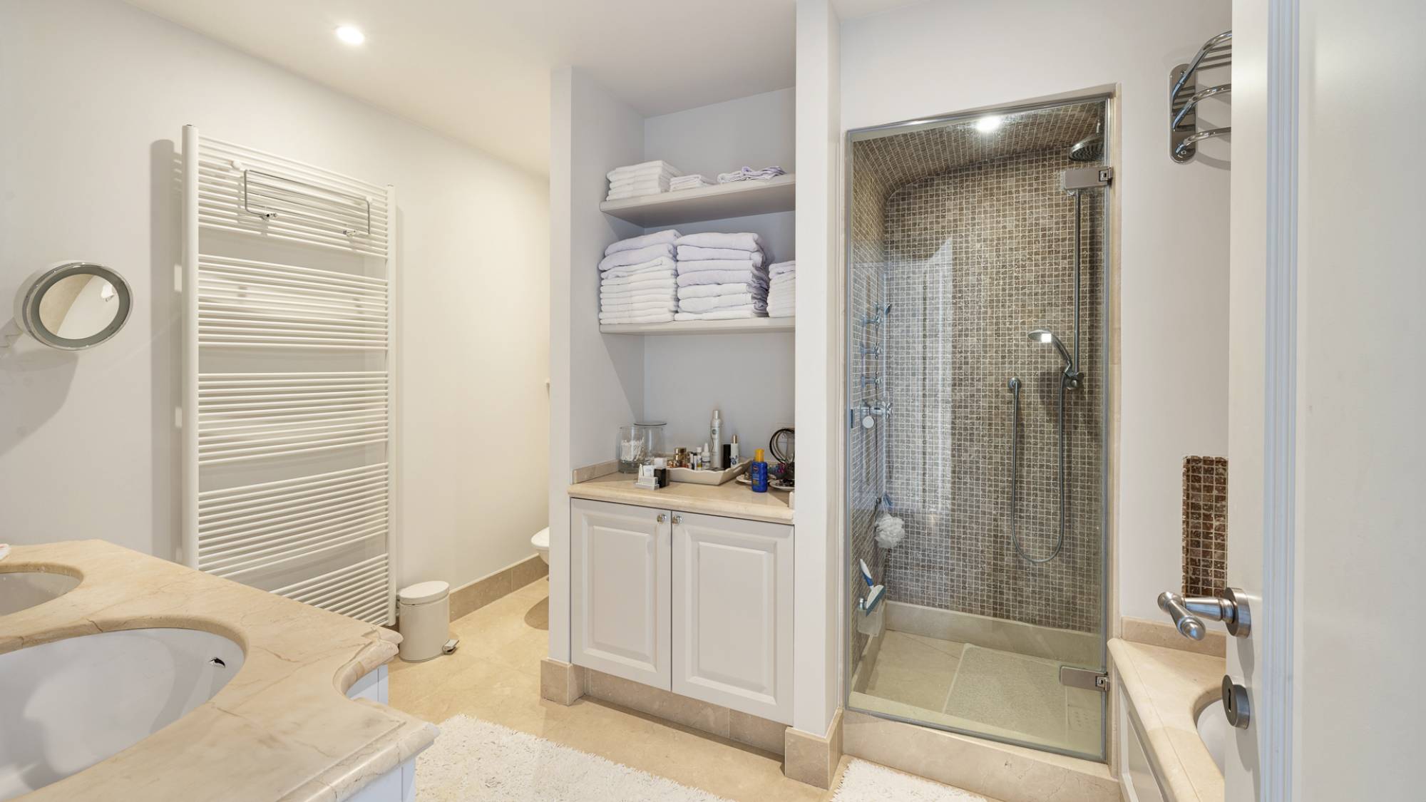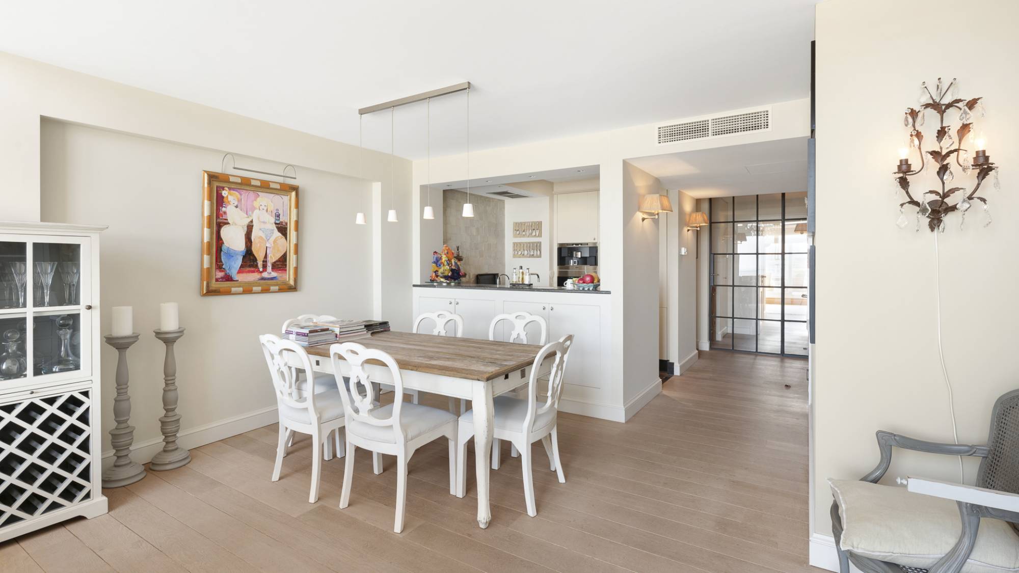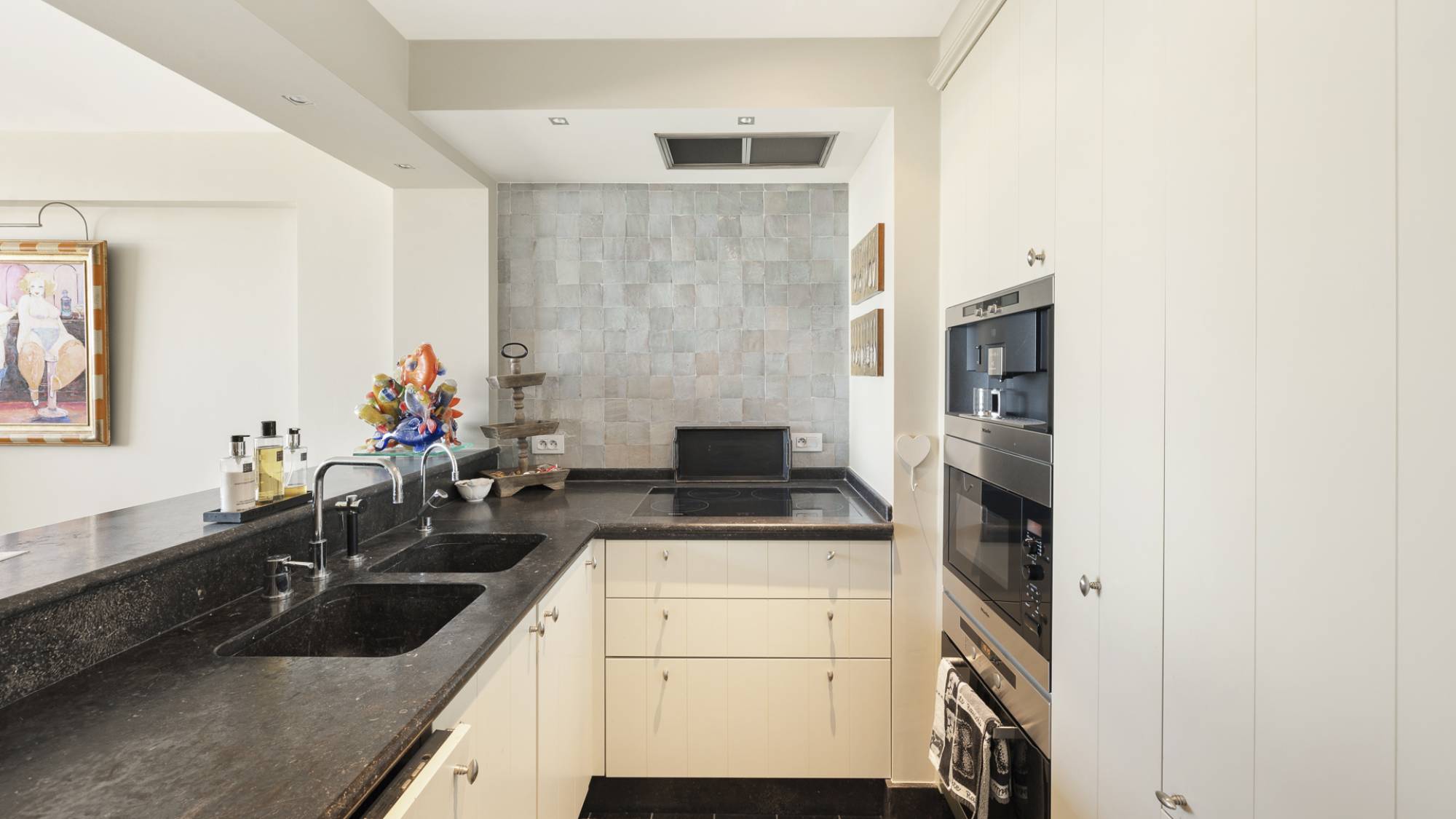 Vous êtes accueilli dans un élégant hall d'entrée avec toilettes invités et espace vestiaire. Le vaste séjour baigné de lumière naturelle grâce aux grandes baies vitrées offre une vue panoramique spectaculaire sur la mer. La terrasse, s'étendant sur toute la largeur de l'appartement, est l'endroit idéal pour profiter de cette vue imprenable. Une salle à manger conviviale et une cuisine ouverte, équipée de tout le confort moderne, complètent cet espace. L’appartement dispose également de deux débarras pratiques.