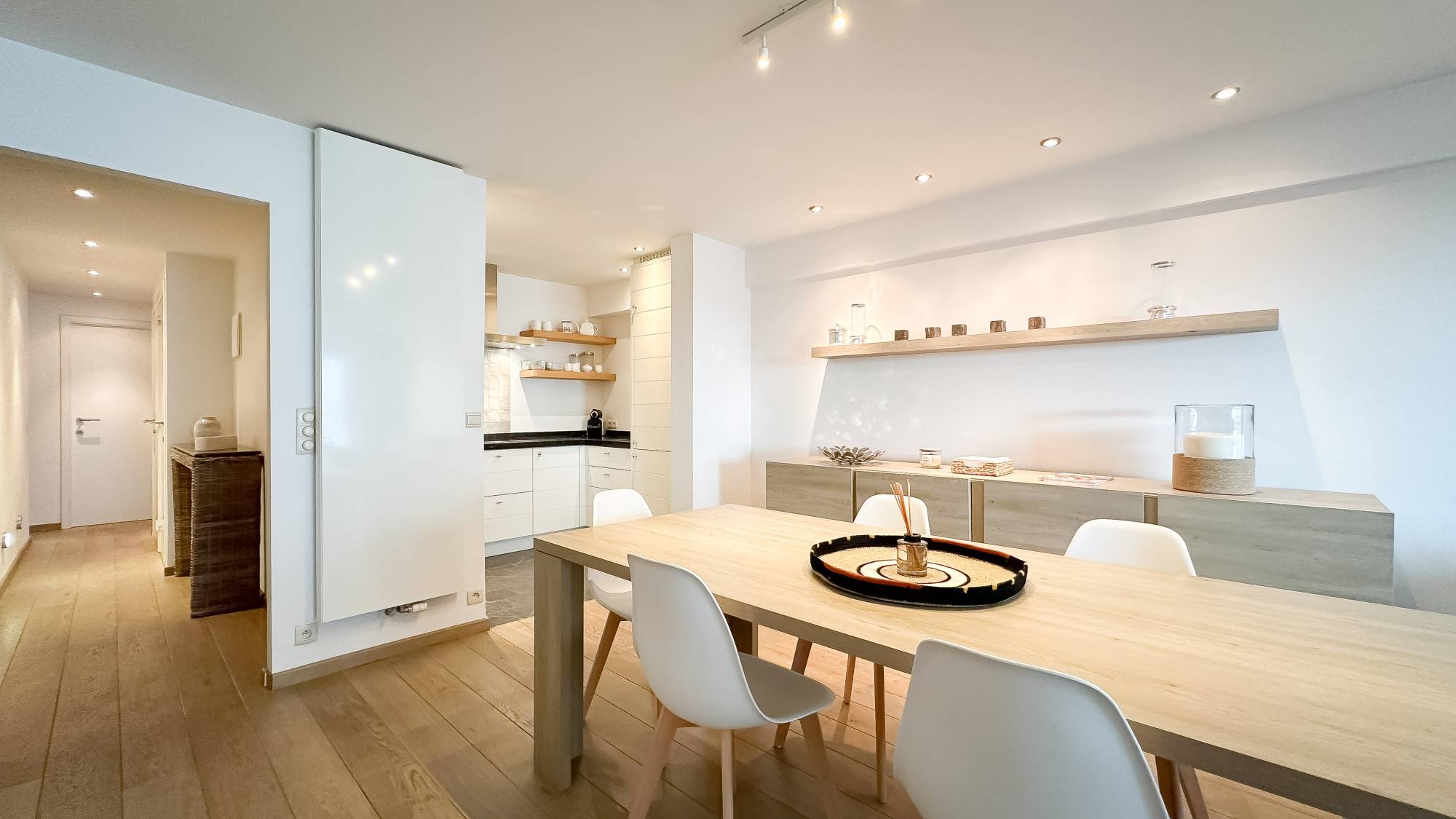 Composition : Spacieux hall d'entrée avec toilettes invités et vestiaire. Le salon lumineux, avec coin repas, s'ouvre sur une magnifique terrasse orientée plein sud, offrant une vue sur la Kustlaan et les résidences de villas environnantes. La cuisine ouverte est pratique et équipée de tout le confort moderne.