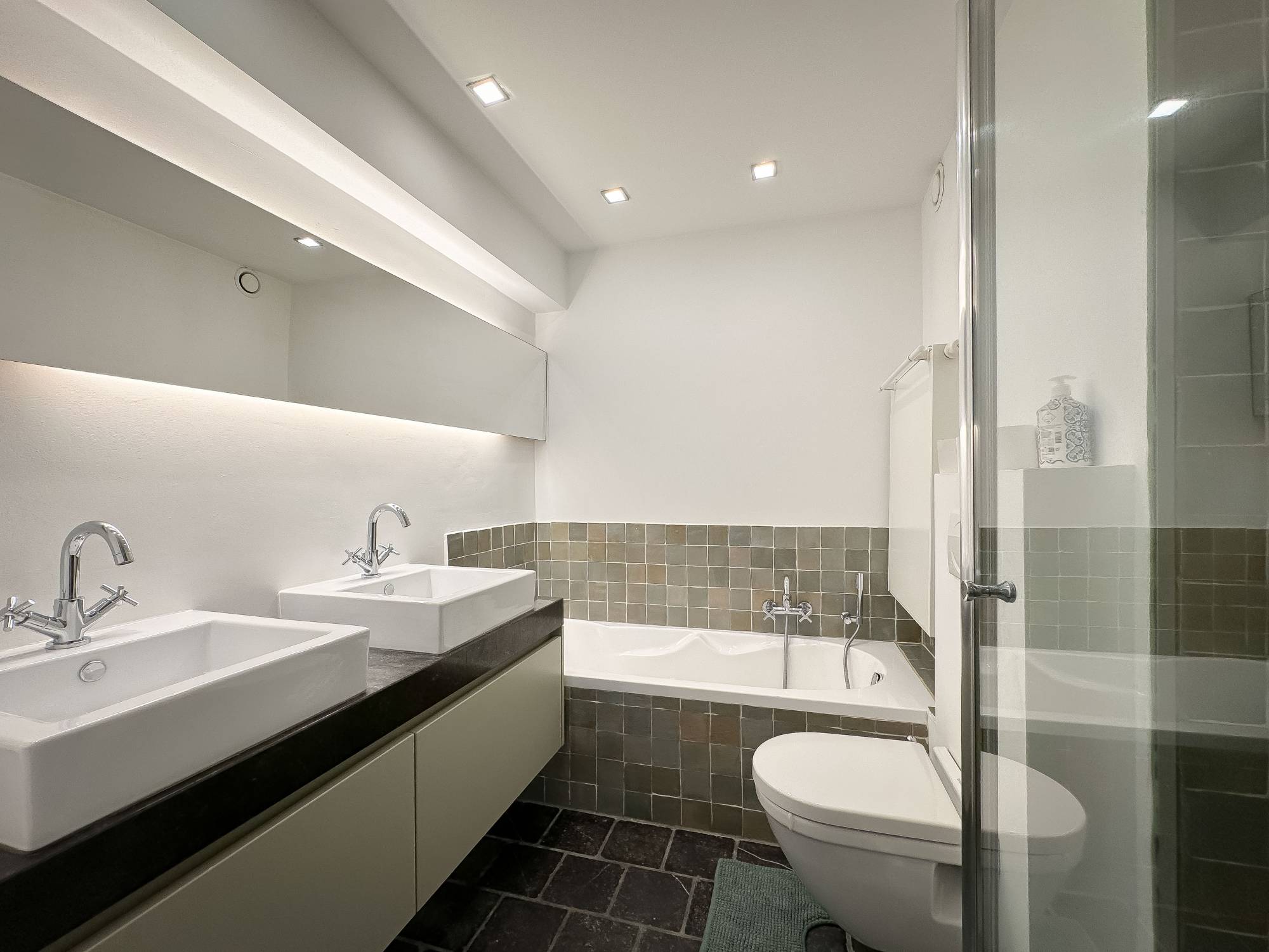 L'appartement dispose de 3 chambres, dont 2 grandes chambres avec placards intégrés. La chambre principale bénéficie d'une salle de bains en suite, avec double lavabo, douche, baignoire et toilettes. La troisième chambre est plus petite, idéale pour une chambre d'enfant ou un bureau. Il y a également une salle de douche séparée et une agréable terrasse à l'arrière.