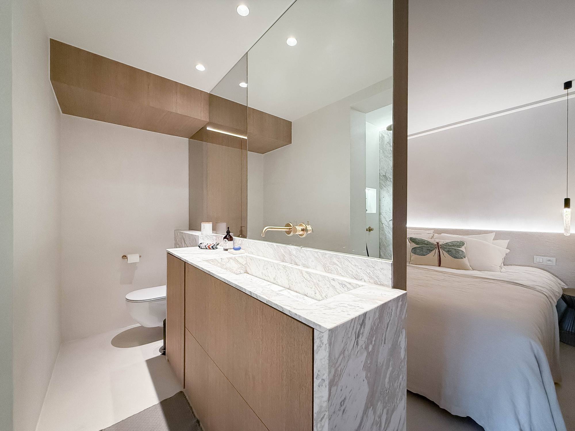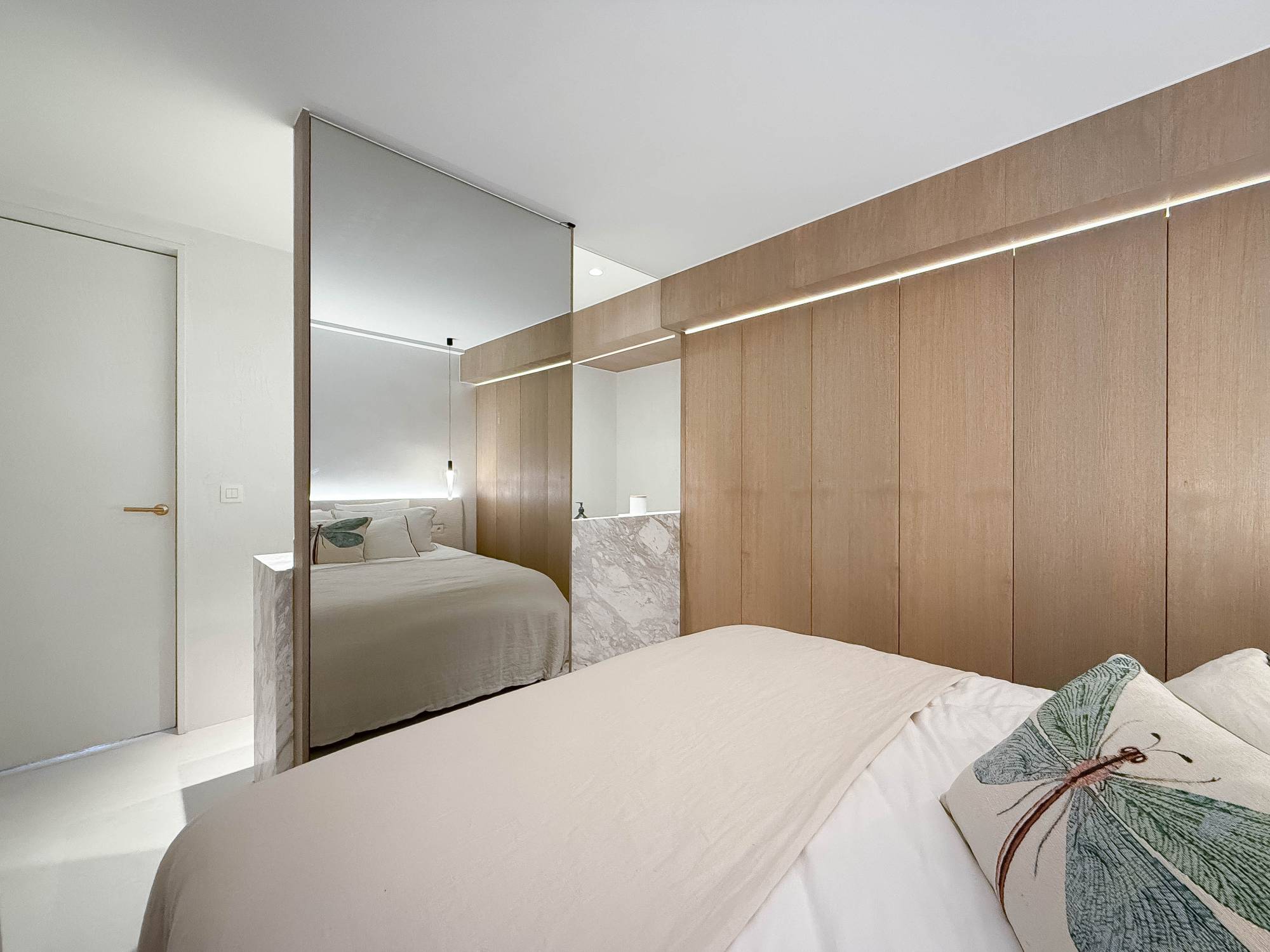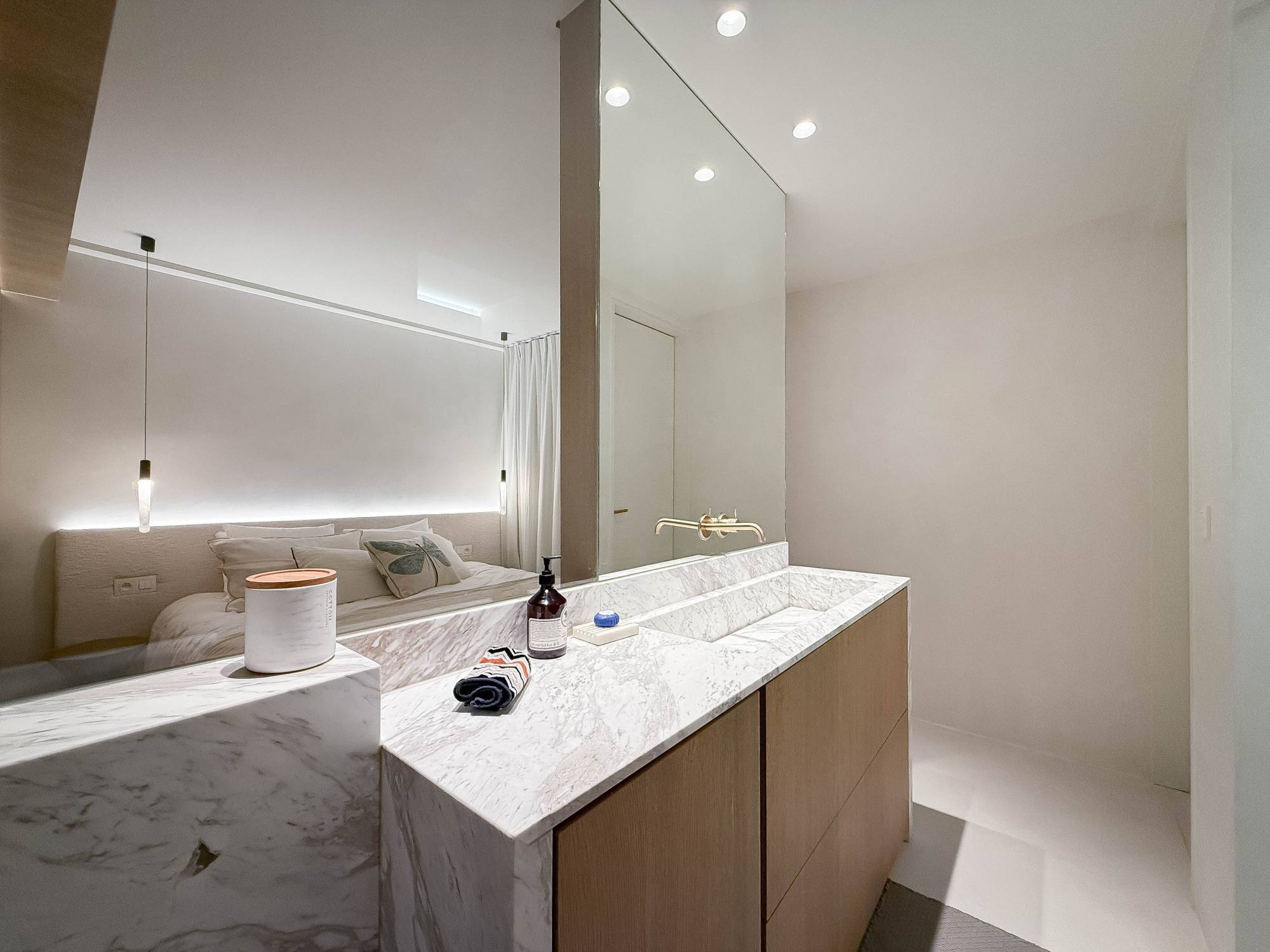 Le couloir de nuit mène à trois chambres élégantes. La chambre principale dispose d'une salle de douche privative avec lavabo, douche et toilettes. Une deuxième salle de bain, équipée d'une douche, lavabo et toilettes séparées. La troisième chambre est astucieusement aménagée avec un lit superposé intégré, parfait pour des enfants ou des invités.