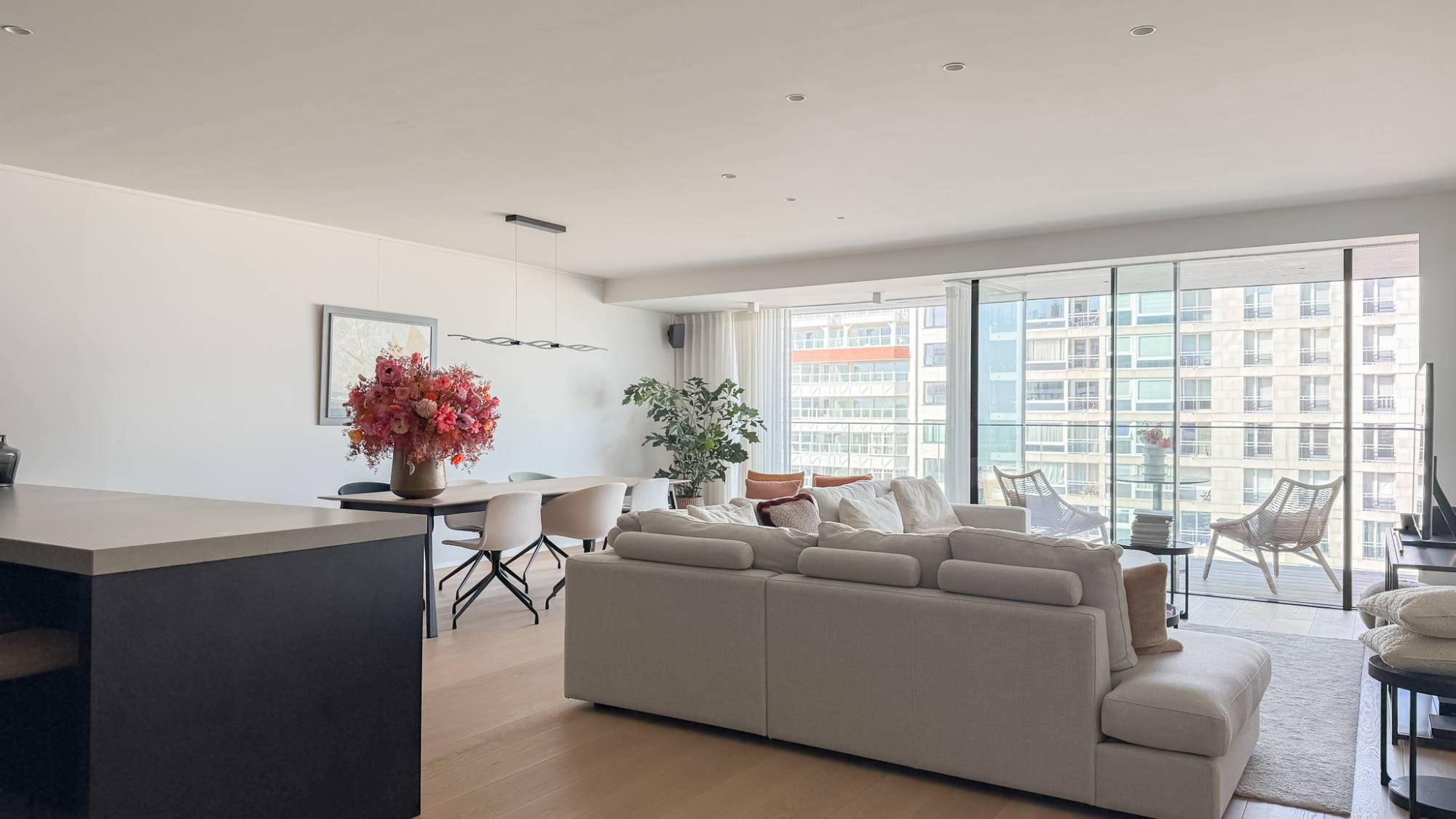 Les vastes baies vitrées inondent le séjour de lumière et révèlent un panorama à couper le souffle, mêlant la mer du Nord à l’animation élégante de Knokke. La terrasse ensoleillée et couverte invite à savourer pleinement l’atmosphère unique du Zoute, en toute saison.